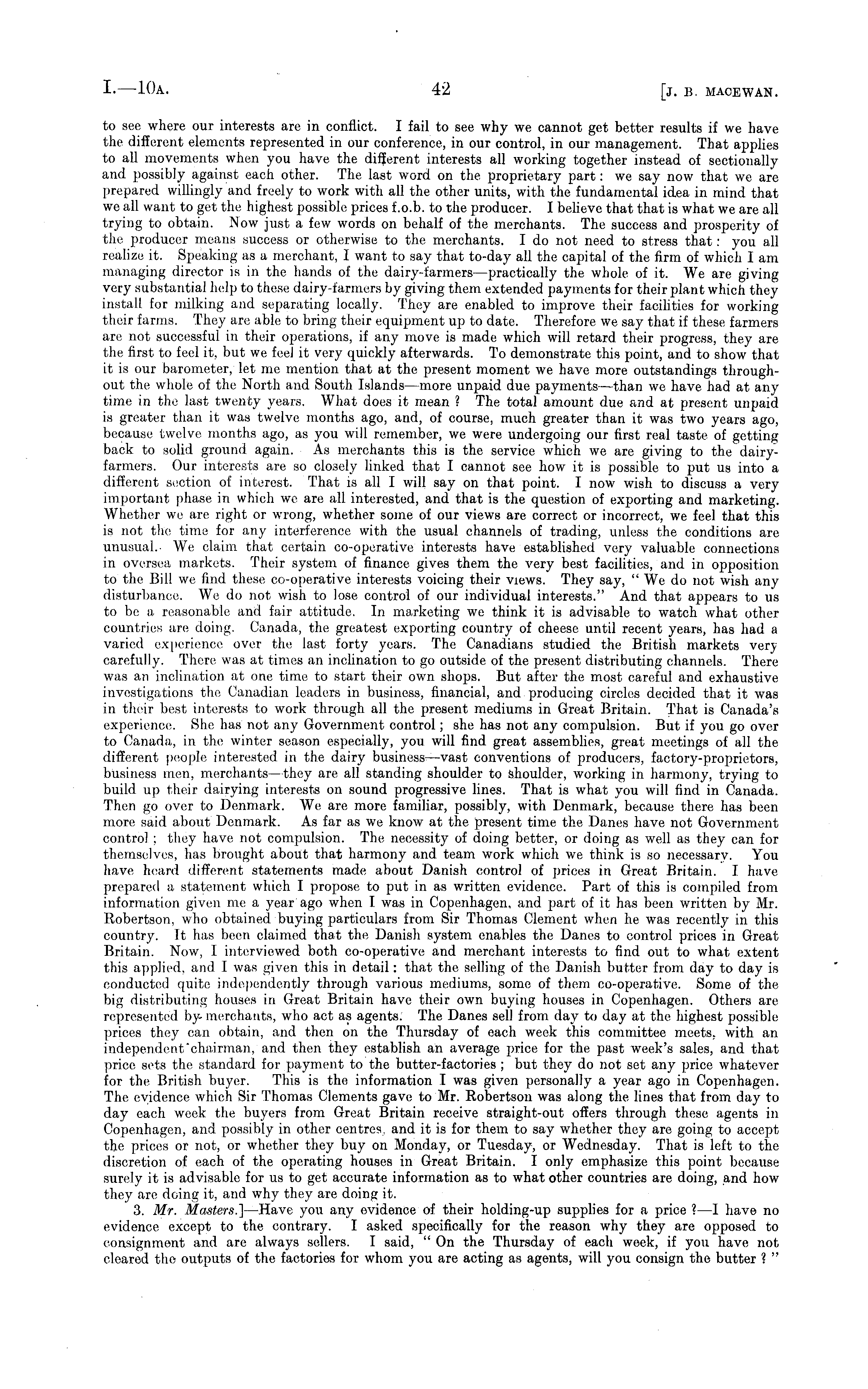 to see where our interests are in conflict. I fail to see why we cannot get better results if we have the different elements represented in our conference, in our control, in our management. That applies to all movements when you have the different interests all working together instead of sectionally and possibly against each other. The last word on the proprietary part: we say now that we are prepared willingly and freely to work with all the other units, with the fundamental idea in mind that we all want to get the highest possible prices f.o.b. to the producer. I believe that that is what we are all trying to obtain. Now just a few words on behalf of the merchants. The success and prosperity of the producer means success or otherwise to the merchants. I do not need to stress that : you all realize it. Speaking as a merchant, I want to say that to-day all the capital of the firm of which lam managing director is in the hands of the dairy-farmers—practically the whole of it. We are giving very substantial help to these dairy-farmers by giving them extended payments for their plant which they install for milking and separating locally. They are enabled to improve their facilities for working their farms. They are able to bring their equipment up to date. Therefore we say that if these farmers are not successful in their operations, if any move is made which will retard their progress, they are the first to feel it, but we feel it very quickly afterwards. To demonstrate this point, and to show that it is our barometer, let me mention that at the present moment we have more outstandings throughout the whole of the North and South Islands —more unpaid due payments —than we have had at any time in the last twenty years. What does it mean ? The total amount due and at present unpaid is greater than it was twelve months ago, and, of course, much greater than it was two years ago, because twelve months ago, as you will remember, we were undergoing our first real taste of getting back to solid ground again. As merchants this is the service which we are giving to the dairyfarmers. Our interests are so closely linked that I cannot see how it is possible to put us into a different section of interest. That is all I will say on that point. I now wish to discuss a very important phase in which we are all interested, and that is the question of exporting and marketing. Whether we are right or wrong, whether some of our views are correct or incorrect, we feel that this is not the time for any interference with the usual channels of trading, unless the conditions are unusual. We claim that certain co-operative interests have established very valuable connections in oversea markets. Their system of finance gives them the very best facilities, and in opposition to the Bill we find these co-operative interests voicing their views. They say, "We do not wish any disturbance. We do not wish to lose control of our individual interests." And that appears to us to be a reasonable and fair attitude. In marketing we think it is advisable to watch what other countries are doing. Canada, the greatest exporting country of cheese until recent years, has had a varied experience over the last forty years. The Canadians studied the British markets very carefully. There was at times an inclination to go outside of the present distributing channels. There was an inclination at one time to start their own shops. But after the most careful and exhaustive investigations the Canadian leaders in business, financial, and producing circles decided that it was in their best interests to work through all the present mediums in Great Britain. That is Canada's experience. She has not any Government control; she has not any compulsion. But if you go over to Canada, in the winter season especially, you will find great assemblies, great meetings of all the different people interested in the dairy business —vast conventions of producers, factory-proprietors, business men, merchants —they are all standing shoulder to shoulder, working in harmony, trying to build up their dairying interests on sound progressive lines. That is what you will find in Canada. Then go over to Denmark. We are more familiar, possibly, with Denmark, because there has been more said about Denmark. As far as we know at the present time the Danes have not Government control ; they have not compulsion. The necessity of doing better, or doing as well as they can for themselves, has brought about that harmony and team work which we think is so necessary. You have heard different statements made about Danish control of prices in Great Britain. I have prepared a statement which I propose to put in as written evidence. Part of this is compiled from information given me a year ago when I was in Copenhagen, and part of it has been written by Mr. Robertson, who obtained buying particulars from Sir Thomas Clement when he was recently in this country. It has been claimed that the Danish system enables the Danes to control prices in Great Britain. Now, I interviewed both co-operative and merchant interests to find out to what extent this applied, and I was given this in detail: that the selling of the Danish butter from day to day is conducted quite independently through various mediums, some of them co-operative. Some of the big distributing houses in Great Britain have their own buying houses in Copenhagen. Others are represented by-merchants, who act as agents. The Danes sell from day to day at the highest possible prices they can obtain, and then on the Thursday of each week this committee meets, with an independent/chairman, and then they establish an average price for the past week's sales, and that price sets the standard for payment to the butter-factories ; but they do not set any price whatever for the British buyer. This is the information I was given personally a year ago in Copenhagen. The evidence which Sir Thomas Clements gave to Mr. Robertson was along