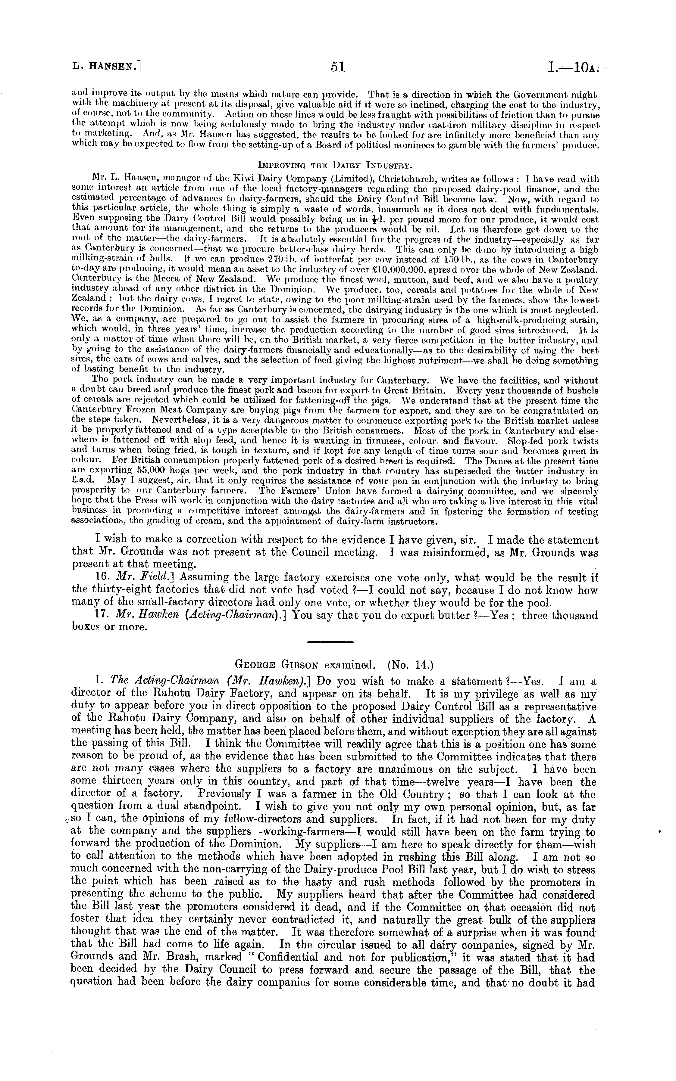 and improve its output by the means which nature can provide. That is a direetiem in which tho Governme-nt might with the machinery at present at its disposal, givo valuable aid if it wore se> inclined, charging the cost to the industry, of bourse, not to the community. Action on these lines would bo less fraught with possibilities of friction than to pursue tho attempt which is now being sedulously made to bring the industry under cast-iron military discipline- in respect to marketing. And, as Mr. Sanson has suggested, the results to be lookeel for are infinitely more beneficial than any which may be oxpeoted to flow from the setting-up e>f a Board of political nominees to gamble*with the fanners' produce. Improving the Dairy Industry. Mr. L. Hanson, manager of tho Kiwi Dairy Company (Limited), Christchurch, writes as fe>lleiws : I have road with some interest an article from ono of the local factory-managers regarding the proposed dairy-pool finance, and the estimated percentage of advances to dairy-farmers, should the Dairy Control Bill become law. Now, with regard to this particular article, the whole thing is simply a waste of words, inasmuch as it does ne>t deal with fundamentals. Even supposing the Dairy Control Bill would possibly bring us in Jd. ]ier pound more for our produce, it would cost that amerant for its management, and the returns to the producers wemld be nil. Let us therefore get de>wn to the root of the matter-—the dairy-farmers. It is absolutely essential feu-the progress of the industry—especially as far as Canterbury is concerned—that we procure bettor-class elairy herds. This can only be demo by introdueing a high milking-strain of bulls. If wei can produce 2701b. of butterfat per- oow instead of IfiO lb., as the cows in Canterbury ta-day SOT producing, it would mean an asset to the: industry of e>ver £10,000,000, spread e>ver the whole e>f New Zealand. Cantcrbiery is the Mecca eif New Zealand. Wei produce the finest weieil, mutton, anel beef, and we alse> have a poultry industry ahead of any either district in the Dominion. We produoe, too, cereals anel potatoes for the wheilo eif New Zealand ; but the dairy eeiws, I regret to state, owing to the poor milking-strain used by the farmers, show the lowest receirds for the Dominion. As far as Canterbury is cemcemed, the dairying industry is the erne which is meist neglected. We, as a ceimpany, are prepared to go out to assist the farmers in procuring sires eif a high-milk-produeang strain, which would, in three years' time, increase the production according to the number of geioei sires introduced. It is only a matter of time when there will be, on tho British market, a very fierce competition in the butter industry, and by going to tho assistance e)f the dairy-farmers financially and educatumally—as to the desirability of using the bewt sires, the care of cows and calves, and the selection of feed giving tho highest nutriment—we shall be doing something of lasting benefit to the industry. Tho pork industry can be made a very important industry for Canterbury. We have the facilities, and without a doubt can breed and produce the finest peirk and bacon for export to Great Britain. Every year thousands eif bushels of cereals are rejected which could be utilized for fattening-off the pigs. We understand that at the present time the Canterbury Frozen Meat Company are buying pigs from the farmers feir export, and they are to be congratulated on the steps taken. Nevertheless, it is a very dangerous matter to ceimmenee exporting peirk to the British market unless it be properly fattened and of a type acceptable to the British consumers. Most of the pork in Canterbury and elsewhere is fattened off with slop feed, and hence it is wanting in firmness, colour, and flavour. Slop-fed pork twists anel turns when being fried, is tough in texture, and if kept for any length of time turns sour and becomes green in colour. For British cemsumptiem properly fattened pork of a desired hrecd is required. The Danes at the present time are exporting 55,000 hogs per week, and the pork ineiustry in that country has superseded the butter industry in £.s.d. May I suggest, sir, that it only requires the assistance of your pen in conjunction with the industry to bring prosperity to emr Canterbury farmers. The Farmers' Dnion have feirmed a dairying committee, and we sincerely hope that the Press will weirk in conjunctiem with tho dairy factories and all whei are taking a live interest in this vital business in promoting a competitive interest amemgst the dairj'-farmers and in fostering the formation eif testing associations, the grading of cream, and the appointment of dairy-farm instructor's. I wish to make a correction with respect to the evidence I have given, sir. I made the statement that Mr. Grounds was not present at the Council meeting. I was misinformed, as Mr. Grounds was present at that meeting. 16. Mr. Field.] Assuming the large factory exercises one vote only, what would be the result if the thirty-eight factories that did not vote had voted ?—I could not say, because Ido not know how many of the small-factory directors had only one vote, or whether they would be for the pool. 17. Mr. Hawken (Acting-Chairman).] You say that you do export butter ? —Yes : three thousand boxes or more. George Gtbson examined. (No. 14.) 1. The Acting-Chairman (Mr. Hawken).] Do you wish to make a statement ? —Yes. I am a director of the Rahotu Dairy Factory, and appear on its behalf. It is my privilege as well as my duty to appear before you in direct opposition to the proposed Dairy Control Bill as a representative of the Rahotu Dairy Company, and also on behalf of other individual suppliers of the factory. A meeting has been hold, the matter has been placed before them, and without exception they are all against the passing of this Bill. I think the Committee will readily agree that this is a position one has some reason to be proud of