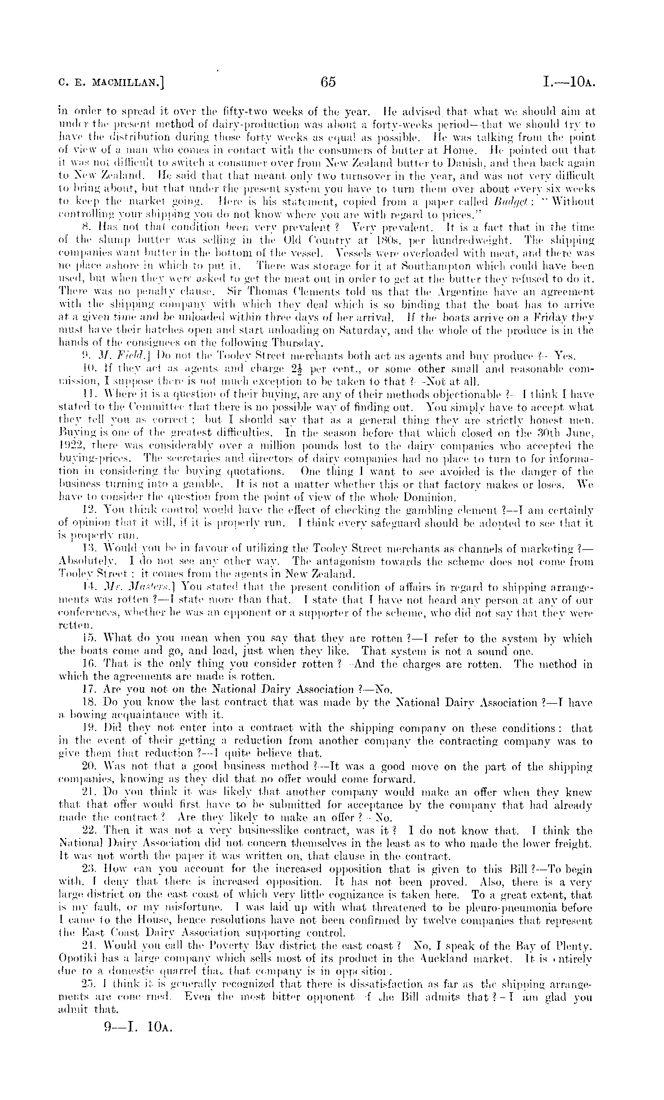 in order to spread it over the fifty-two weeks of the year. He advised, that what we should aim at under the present method of dairy-production was about a forty-weeks period —that we should try to have the distribution during those forty weeks as equal as possible. He was talking from the point of view of a man who comes in contact with the consumers of butter at Home. He pointed oat that it was not difficult to switch a consumer over from New Zealand butter to Danish, and then back again to New Zealand. He said that that meant only two turnsover in the year, and was not very difficult to bring about, but that under the present system you have to turn them over about every six weeks to keep the market going. Here is his statement, copied from a paper called Budget: " Without controlling your shipping you do not know where you are with regard to prices." 8. Has not that condition been very prevalent ? —Very prevalent. It is a fact that in the time of the slump butter was selling in the Old Country at 180s. per hundredweight. The shipping companies want butter in the bottom of the vessel. Vessels were overloaded with meat, and there was no place ashore in which to put it. There was storage for it at Southampton which, could have been used, but when they were asked to get the meat out in order to get at the butter they refused to do it. There was no penalty clause. Sir Thomas Clements told us that the Argentine have an agreement with the shipping company with which they deal which is so binding that the boat has to arrive at a given time and be unloaded within three days of her arrival. If the boats arrive on a Friday they must have their hatches open and start unloading on Saturday, and the whole of the produce is in the hands of the consignees on the following Thursday. 9. M. Field.] Do not the Tooley Street merchants both act as agents and buy produce ? —Yes. 10. If they act as agents and charge 2J per cent., or some other small and reasonable commission, I suppose there is not much exception to be taken to that ? —Not at all. 11. Where it is a question of their buying, are any of their methods objectionable ?—I think I have stated to the Committee that there is no possible way of finding out. You simply have to accept what they tell you as correct; but I should say that as a general thing they are strictly honest men. Buying is one of the greatest difficulties. In the season before that which closed on the 30th June, 1922, there was considerably over a million pounds lost to the dair}' companies who accepted the buying-prices. The secretaries and directors of dairy companies had no place to turn to for information in considering the buying quotations. One thing I want to see avoided is the danger of the business turning into a gamble. It is not a matter whether this or that factory makes or loses. We have to consider the question from the point of view of the whole Dominion. 12. You think control would have the effect of checking the gambling element ? —I am certainly of opinion that it will, if it is properly run. I think every safeguard should be adopted to see that it is properly run. 13. Would you be in favour of utilizing the Tooley Street merchants as channels of marketing 1— Absolutely. Ido not see any other way. The antagonism towards the scheme does not come from Tooley Street: it comes from the agents in New Zealand. 14. Mr. Masters.] You stated that the present condition of affairs in regard to shipping arrangements was rotten ?—I state more than that. I state that I have not heard any person at any of our conferences, whether he was an opponent or a supporter of the scheme, who did not say that they were rotten. 15. What do you mean when you say that they are rotten ? —I refer to the system by which the boats come and go, and load, just when they like. That system is not a sound one. 16. That is the only thing you consider rotten ?—And the charges are rotten. The method in which the agreements are made is rotten. 17. Are you not on the National Dairy Association ? —No. 18. Do you know the last contract that was made by the National Dairy Association ? —I have a bowing acquaintance with it. 19. Did they not enter into a contract with the shipping company on these conditions : that in the event of their getting a reduction from another company the contracting company was to give them that reduction ? —I quite believe that. 20. Was not that a good business method ? —lt was a good move on the part of the shipping companies, knowing as they did that no offer would come forward. 2.1. Do you think it was likely that another company would make an offer when they knew that that offer would first have to be submitted for acceptance by the company that had already made the contract ? Are they likely to make an offer ?—No. 22. Then it was not a very businesslike contract, was it ? —I do not know that. I think the National Dairy Association did not concern themselves in the least as to who made the lower freight. It was not worth the paper it was written on, that clause in the contract. 23. How can you account for the increased opposition that is given to this Bill ? —To begin with, I deny that there is increased opposition. It has not been proved. Also, there is a very large district on the east coast of which very little cognizance is taken here. To a great extent, that is my fault, or my misfortune. I was laid up with what threatened to be pleuro-pneumonia before I came to the House, hence resolutions have not been confirmed by twelve companies that represent the East Coast Dairy Association supporting control. 24. Would you call the Poverty Bay district the east coast ?—No, I speak of the Bay of Plenty. Opotiki has a large company which sells most of its product in the Auckland market. It. is t ntirelv due to a domestic quarrel thai/ that company is in opposition. 25. I think it is generally recognized that there is dissatisfaction as far as the s