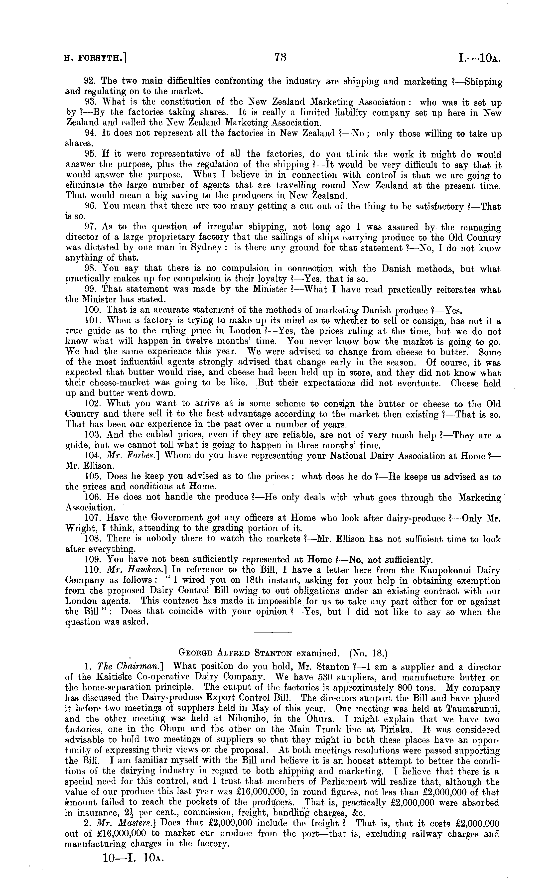 92. The two main difficulties confronting the industry are shipping and marketing ?—Shipping and regulating on to the market. 93. What is the constitution of the New Zealand Marketing Association : who was it set up by ? —By the factories taking shares. It is really a limited liability company set up here in New Zealand and called the New Zealand Marketing Association. 94. It does not represent all the factories in New Zealand ? —No ; only those willing to take up shares. 95. If it were representative of all the factories, do you think the work it might do would answer the purpose, plus the regulation of the shipping ? —lt would be very difficult to say that it would answer the purpose. What I believe in in connection with control is that we are going to eliminate the large number of agents that are travelling round New Zealand at the present time. That would mean a big saving to the producers in New Zealand. 96. You mean that there are too many getting a cut out of the thing to be satisfactory ? —That is so. 97. As to the question of irregular shipping, not long ago I was assured by the managing director of a large proprietary factory that the sailings of ships carrying produce to the Old Country was dictated by one man in Sydney : is there any ground for that statement ? —No, I do not know anything of that. 98. You say that there is no compulsion in connection with the Danish methods, but what practically makes up for compulsion is their loyalty ? —Yes, that is so. 99. That statement was made by the Minister ? -What I have read practically reiterates what the Minister has stated. 100. That is an accurate statement of the methods of marketing Danish produce ? —Yes. 101. When a factory is trying to make up its mind as to whether to sell or consign, has not it a true guide as to the ruling price in London ? —Yes, the prices ruling at the time, but we do not know what will happen in twelve months' time. You never know how the market is going to go. We had the same experience this year. We were advised to change from cheese to butter. Some of the most influential agents strongly aelvisod that change early in the season. Of course, it was expected that butter would rise, and cheese had been held up in store, and they did not know what their cheese-market was going to be like. But their expectations did not eventuate. Cheese held up and butter went down. 102. What you want to arrive at is some scheme to consign the butter or cheese to the Old Country and there sell it to the best advantage according to the market then existing ? —That is so. That has been our experience in the past over a number of years. 103. And the cabled prices, even if they are reliable, are not of very much help ? —They are a guide, but we cannot tell what is going to happen in three months' time. 104. Mr. Forbes.] Whom do you have representing your National Dairy Association at Home ?— Mr. Ellison. 105. Does he keep you advised as to the prices : what does he do ? —He keeps us advised as to the prices and conditions at Home. 106. He does not handle the produce ? —He only deals with what goes through the Marketing Association. 107. Have the Government got any officers at Home who look after dairy-produce ? —Only Mr. Wright, I think, attending to the grading portion of it. 108. There is nobody there to watch the markets ? —Mr. Ellison has not sufficient time to look after everything. 109. You have not been sufficiently represented at Home ? —No, not sufficiently. 110. Mr. Hawken.] In reference to the Bill, I have a letter here from the Kaupokonui Dairy Company as follows : "I wired you on 18th instant, asking for your help in obtaining exemption from the proposed Dairy Control Bill owing to out obligations under an existing contract with our London agents. This contract has made it impossible for us to take any part either for or against the Bill" : Does that coincide with your opinion ? —Yes, but I did not like to say so when the question was asked. George Alfred Stanton examined. (No. 18.) 1. The Chairman.] What position do you hold, Mr. Stanton ? —I am a supplier and a director of the Kaitie'ke Co-operative Dairy Company. We have 530 suppliers, and manufacture butter on the home-separation principle. The output of the factories is approximately 800 tons. My company has discussed the Dairy-produce Export Control Bill. The directors support the Bill and have placed it before two meetings of suppliers held in May of this year. One meeting was held at Taumarunui, and the other meeting was field at Nihoniho, in the Ohura. I might explain that we have two factories, one in the Ohura and the other on the Main Trunk line at Piriaka. It was considered advisable to hold two meetings of suppliers so that they might in both these places have an opportunity of expressing their views on the proposal. At both meetings resolutions were passed supporting the Bill. lam familiar myself with the Bill and believe it is an honest attempt to better the conditions of the dairying industry in regard to both shipping and marketing. I believe that there is a special need for this control, and I trust that members of Parliament will realize that, although the value of our produce this last year was £16,000,000, in round figures, not less than £2,000,000 of that amount failed to reach the pockets of the producers. That is, practically £2,000,000 were absorbed in insurance, 2J per cent., commission, freight, handling charges, &c. 2. Mr. Masters.] Does that £2,000,000 include the freight ?—That is, that it costs £2,000,000 out of £16,000,000 to market our produce from the port—that is, excluding railway charges and manufacturing charges in the factory.