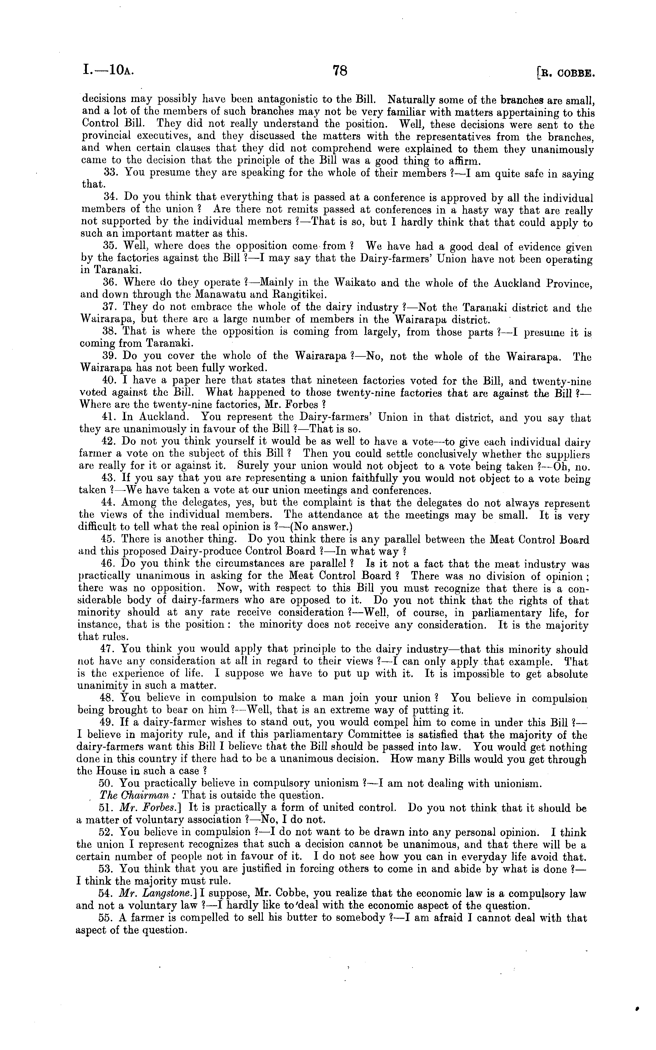 decisions may possibly have been antagonistic to the Bill. Naturally some of the branches arc small, and a lot of the members of such branches may not be very familiar with matters appertaining to this Control Bill. They did not really understand the position. Well, these decisions were sent to the provincial executives, and they discussed the matters with the representatives from the branches, and when certain clauses that they did not comprehend were explained to them they unanimously came to the decision that the principle of the Bill was a good thing to affirm. 33. You presume they are speaking for the whole of their members ?—I am quite safe in saying that. 34. Do you think that everything that is passed at a conference is approved by all the individual members of the union ? Are there not remits passed at conferences in a hasty way that are really not supported by the individual members ? —That is so, but I hardly think that that could apply to such an important matter as this. 35. Well, where does the opposition come from ? We have had a good deal of evidence given by the factories against the Bill ? —I may say that the Dairy-farmers' Union have not been operating in Taranaki. 36. Where elo they operate ? —Mainly in the Waikato and the whole of the Auckland Province, and down through the Manawatu and Rangitikei. 37. They do not embrace the whole of the dairy industry ? —Not the; Taranaki district and the Wairarapa, but there arc a large number of members in the Wairarapa district. 38. That is where the opposition is coming from largely, from those parts ? —I presume it is coming from Taranaki. 39. Do you cover the whole of the Wairarapa ? —No, not the whole of the Wairarapa. The Wairarapa has not been fully worked. 40. I have a paper here that states that nineteen factories voted for the Bill, and twenty-nine voted against the Bill. What happened to those twenty-nine factories that are against the Bill ? — Where are the twenty-nine factories, Mr. Forbes ? 41. In Auckland. You represent the Dairy-farmers' Union in that district, and you say that they are unanimously in favour of the Bill ? —That is so. 42. Do not you think yourself it would be as well to have a vote —to give each individual dairy farmer a vote on the subject of this Bill ? Then you could settle conclusively whether the suppliers are really for it or against it. Surely your union would not object to a vote being taken ? —Oh, no. 43. If you say that you are representing a union faithfully you would not object to a vote being taken ? —We have taken a vote at our union meetings and conferences. 44. Among the delegates, yes, but the complaint is that the delegates do not always represent the views of the individual members. The attendance at the meetings may be small. It is very difficult to tell what the real opinion is ? —(No answer.) 45. There is another thing. Do you think there is any parallel betweem the Meat Control Board and this proposed Dairy-produce Control Board ? —ln what way ? 46. Do you think the circumstances are parallel ? Is it not a fact that the meat industry was practically unanimous in asking for the Meat Control Board ? There was no division of opinion ; there was no opposition. Now, with respect to this Bill you must recognize that there is a considerable body of dairy-farmers who are opposed to it. Do you not think that the rights of that minority should at any rate receive consideration ? —Well, of course, in parliamentary life, for instance, that is the position : the minority does not receive any consideration. It is the majority that rules. 47. You think you would apply that principle to the-, dairy industry—that this minority should not have any consideration at all in regarel to their views ? —I can only apply that example. That is the experience of life. I suppose we have to put up with it. It is impossible to get absolute unanimity in such a matter. 48. You believe in compulsion to make a man join your union ? You believe in compulsion being brought to bear on him ?- Well, that is an extreme way of putting it. 49. If a dairy-farmer wishes to stand out, you would compel him to come in under this Bill ? — I believe in majority rule, and if this parliamentary Committee is satisfied that the majority of the dairy-farmers want this Bill I believe that the Bill should be passed into law. You would get nothing done in this country if there had to be a unanimous decision. How many Bills would you get through the House in such a case ? 50. You practically believe in compulsory unionism ? —1 am not dealing with unionism, The Chairman : That is outside the question. 51. Mr. Forbes.] It is practically a form of united control. Do you not think that it should be a matter of voluntary association ? —No, I do not. 52. You believe in compulsion ? —I do not want to be drawn into any personal opinion. I think the union I represent recognizes that such a decision cannot be unanimous, and that there will be a certain number of people not in favour of it. Ido not see how you can in everyday fife avoid that. 53. You think that you are justified in forcing others to come in and abide by what is done ? — I think the majority must rule. 54. Mr. Langstone.] I suppose, Mr. Cobbe, you realize that the economic law is a compulsory law and not a voluntary law ? —I hardly like to'deal with the economic aspect of the question. 55. A farmer is compelled to sell his butter to somebody ? —I am afraid I cannot deal with that aspect of the question.