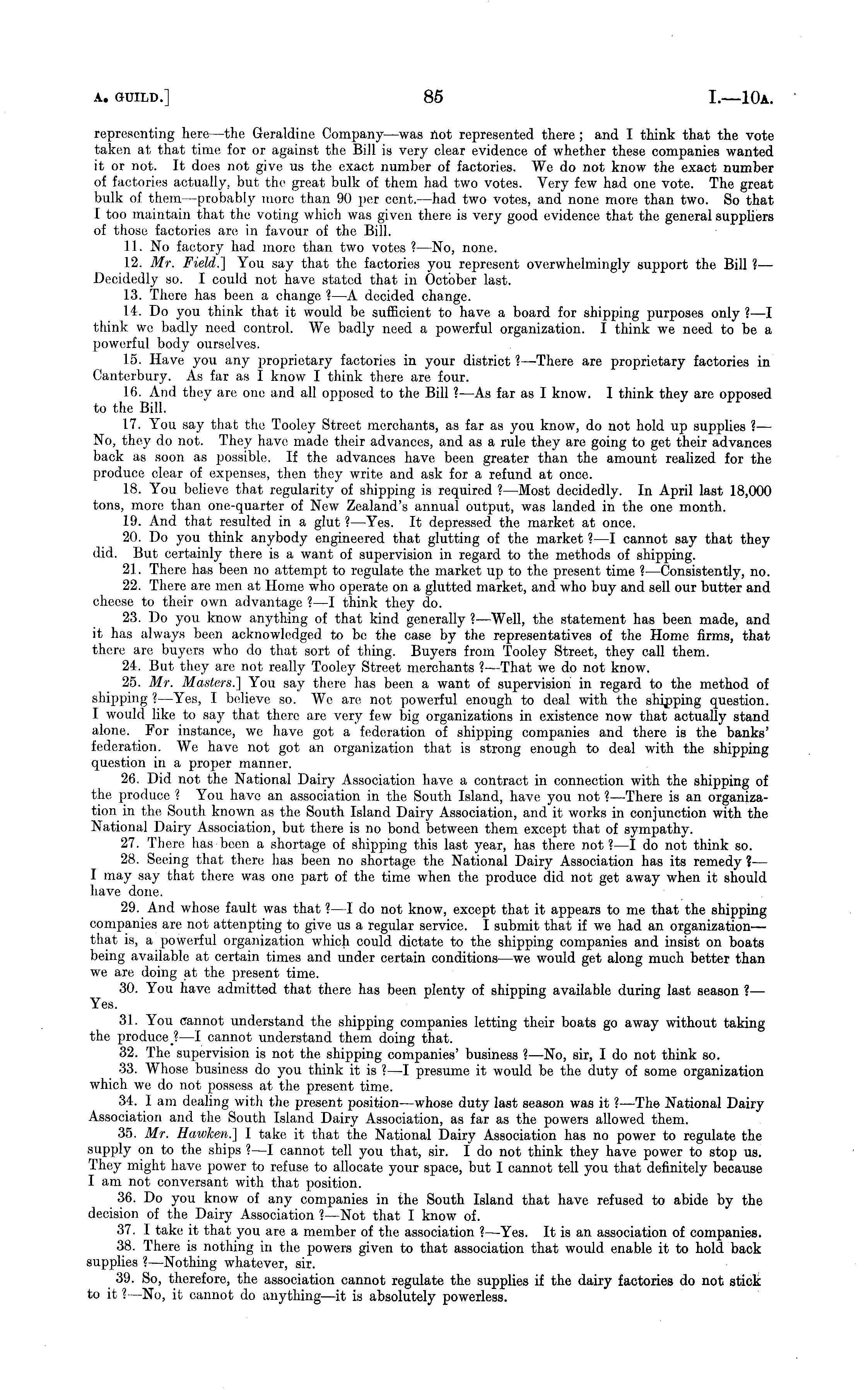 representing here —the Geraldine Company —was not represented there ; and I think that the vote taken at that time for or against the Bill is very clear evidence of whether these companies wanted it or not. It does not give us the exact number of factories. We do not know the exact number of factories actually, but the great bulk of them had two votes. Very few had one vote. The great bulk of them —probably more than 90 per cent. —had two votes, and none more than two. So that I too maintain that the voting which was given there is very good evidence that the general suppliers of those factories are in favour of the Bill. 11. No factory had more than two votes ? —No, none. 12. Mr. Field.] You say that the factories you represent overwhelmingly support the Bill ? — Decidedly so. I could not have stated that in October last. 13. There has been a change ? —A decided change. 14. Do you think that it would be sufficient to have a board for shipping purposes only ? —I think we badly need control. We badly need a powerful organization. I think we need to be a powerful body ourselves. 15. Have you any proprietary factories in your district ? —There are proprietary factories in Canterbury. As far as I know I think there are four. 16. And they are one and all opposed to the Bill ? —As far as I know. I think they are opposed to the Bill. 17. You say that the Tooley Street merchants, as far as you know, do not hold up supplies ? — No, they do not. They have made their advances, and as a rule they are going to get their advances back as soon as possible. If the advances have been greater than the amount realized for the produce clear of expenses, then they write and ask for a refund at once. 18. You believe that regularity of shipping is required ? —Most decidedly. In April last 18,000 tons, more than one-quarter of New Zealand's annual output, was landed in the one month. 19. And that resulted in a glut ?—Yes. It depressed the market at once. 20. Do you think anybody engineered that glutting of the market ? —I cannot say that they did. But certainly there is a want of supervision in regard to the methods of shipping. 21. There has been no attempt to regulate the market up to the present time ? —Consistently, no. 22. There are men at Home who operate on a glutted market, and who buy and sell our butter and cheese to their own advantage ?—I think they do. 23. Do you know anything of that kind generally ? —Well, the statement has been made, and it has always been acknowledged to be the case by the representatives of the Home firms, that there are buyers who do that sort of thing. Buyers from Tooley Street, they call them. 24. But they are not really Tooley Street merchants ? —That we do not know. 25. Mr. Masters.] You say there has been a want of supervision in regard to the method of shipping ? —Yes, I believe so. We are not powerful enough to deal with the shipping question. I would like to say that there are very few big organizations in existence now that actually stand alone. For instance, we have got a federation of shipping companies and there is the banks' federation. We have not got an organization that is strong enough to deal with the shipping question in a proper manner. 26. Did not the National Dairy Association have a contract in connection with the shipping of the produce ? You have an association in the South Island, have you not ?—There is an organization in the South known as the South Island Dairy Association, and it works in conjunction with the National Dairy Association, but there is no bond between them except that of sympathy. 27. There has been a shortage of shipping this last year, has there not ? —I do not think so. 28. Seeing that there has been no shortage the National Dairy Association has its remedy ? — I may say that there was one part of the time when the produce did not get away when it should have done. 29. And whose fault was that ? —I do not know, except that it appears to me that the shipping companies are not attenpting to give us a regular service. I submit that if we had an organization— that is, a powerful organization which could dictate to the shipping companies and insist on boats being available at certain times and under certain conditions—we would get along much better than we are doing at the present time. 30. You have admitted that there has been plenty of shipping available during last season ? — Yes. 31. You cannot understand the shipping companies letting their boats go away without taking the produce ) —l cannot understand them doing that. 32. The supervision is not the shipping companies' business ?—No, sir, I do not think so. 33. Whose business do you think it is ? —I presume it would be the duty of some organization which we do not possess at the present time. 34. I am dealing with the present position—whose duty last season was it ? —The National Dairy Association and the South Island Dairy Association, as far as the powers allowed them. 35. Mr. Hawken.] I take it that the National Dairy Association has no power to regulate the supply on to the ships ? —I cannot tell you that, sir. Ido not think they have power to stop us. They might have power to refuse to allocate your space, but I cannot tell you that definitely because I am not conversant with that position. 36. Do you know of any companies in the South Island that have refused to abide by the decision of the Dairy Association ? —Not that I know of. 37. I take it that you are a member of the association ? —Yes. It is an association of companies. 38. There is nothing in the powers given to that association that would enable it to hold back supplies ? —Nothing whatever, sir. 39. So, therefore, the association cannot regulate the supplies if the dairy factories do not stick to it ? —No, it cannot do anything—it is absolutely powerless.