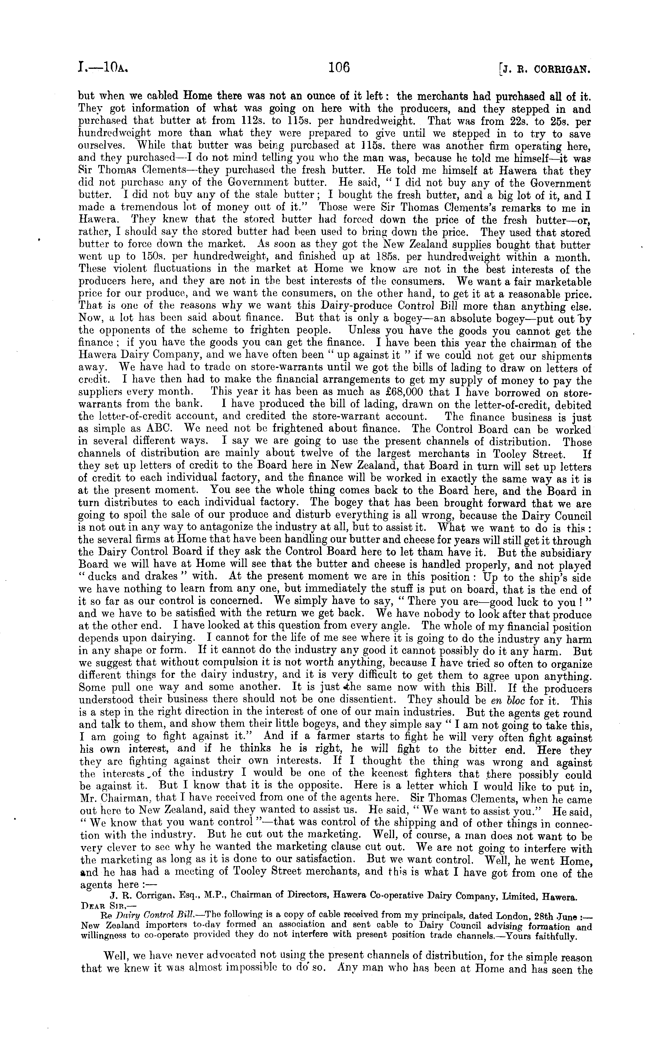 but when we cabled Home there was not an ounce of it left: the merchants had purchased all of it. They got information of what was going on here with the producers, and they stepped in and purchased that butter at from 112s. to 115s. per hundredweight. That was from 225. to 255. per hundredweight more than what they were prepared to give until we stepped in to try to save ourselves. While that butter was being purchased at 115s. there was another firm operating here, and they purchased—l do not mind telling you who the man was, because he told me himself —it was Sir Thomas Clements—they purchaseel the fresh butter. He told me himself at Hawera that they did not purchase any of the Government butter. He said, " I did not buy any of the Government butter. I did not buy any of the stale butter; I bought the fresh butter, and a big lot of it, and I made a tremendous lot of money out of it." Those were Sir Thomas Clements's remarks to me in Hawera. They knew that the stored butter had forced down the price of the fresh butter —or, rather, I should say the stored butter had been used to bring down the price. They used that stored butter to force down the market. As soon as they got the New Zealand supplies bought that butter went up to 150s. per hundredweight, and finished up at 185s. per hundredweight within a month. These violent fluctuations in the market at Home we know are not in the best interests of the producers here, and they are not in the best interests of the consumers. We want a fair marketable price for our produce, and we want the consumers, on the other hand, to get it at a reasonable price. That is one of the reasons why we want this Dairy-produce Control Bill more than anything else. Now, a lot has been said about finance. But that is only a bogey—an absolute bogey—put out by the opponents of the scheme to frighten people. Unless you have the goods you cannot get the finance ; if you have the goods you can get the finance. I have been this year the chairman of the Hawera Dairy Company, and we have often been " up against it " if we could not get our shipments away. We have had to trade on store-warrants until we got the bills of lading to draw on letters of credit. I have then had to make the financial arrangements to get my supply of money to pay the suppliers every month. This year it has been as much as £68,000 that I have borrowed on storewarrants from the bank. I have produced the bill of lading, drawn on the letter-of-credit, debited the letter-of-credit account, and credited the store-warrant account. The; finance business is just as simple as ABC. We need not be frightened about finance. The Control Board can be worked in several different ways. I say we are going to use the present channels of distribution. Those channels of distribution are mainly about twelve of the largest merchants in Tooley Street. If they set up letters of credit to the Board here in New Zealand, that Board in turn will set up letters of credit to each individual factory, and the finance will be worked in exactly the same way as it is at the present moment. You see the whole thing comes back to the Board here, and the Board in turn distributes to each individual factory. The bogey that has been brought forward that we are going to spoil the sale of our produce and disturb everything is all wrong, because the Dairy Council is not out in any way to antagonize the industry at all, but to assist it. What we want to do is this : the several firms at Home that have been handling our butter and cheese for years will still get it through the Dairy Control Board if they ask the Control Board here to let tham have it. But the subsidiary Board we will have at Home will see that the butter and cheese is handled properly, and not played " ducks and drakes " with. At the present moment we are in this position : Up to tho ship's side we have nothing to learn from any one, but immediately the stuff is put on board, that is the end of it so far as our control is concerned. We simply have to say, " There you are —good luck to you ! " and we have to be satisfied with the return we get back. We have nobody to look after that produce at the other end. I have looked at this question from every angle. The whole of my financial position depends upon dairying. I cannot for the life of me see where it is going to do the industry any harm in any shape or form. If it cannot do the industry any good it cannot possibly do it any harm. But we suggest that without compulsion it is not worth anything, because I have tried so often to organize different things for the dairy industry, and it is very difficult to get them to agree upon anything. Some pull one way and some another. It is just *the same now with this Bill. If the producers understood their business there should not be one dissentient. They should be en bloc for it. This is a step in the right direction in the interest of one of our main industries. But the agents get round and talk to them, and show them their little bogeys, and they simple say " I am not going to take this, I am going to fight against it." And if a farmer starts to fight he will very often fight against his own interest, and if he thinks he is right, he will fight to the bitter end. Here they they arc fighting against their own interests. If I thought the thing was wrong and against the interests.of the industry I would be one of the keenest fighters that there possibly could be against it. But I know that it is the opposite. Here is a letter which I would like to put in, Mr. Chairman, that I have received from one of the agents here. Sir Thomas Clements, when he came out here to New Zealand, said they wanted to assist us. He said, "We want to assist you." He said, " We know that you want control " —that was control of the shipping and of other things in connection with the industry. But he cut out the marketing. Well, of course, a man does not want to be very clever to see why he