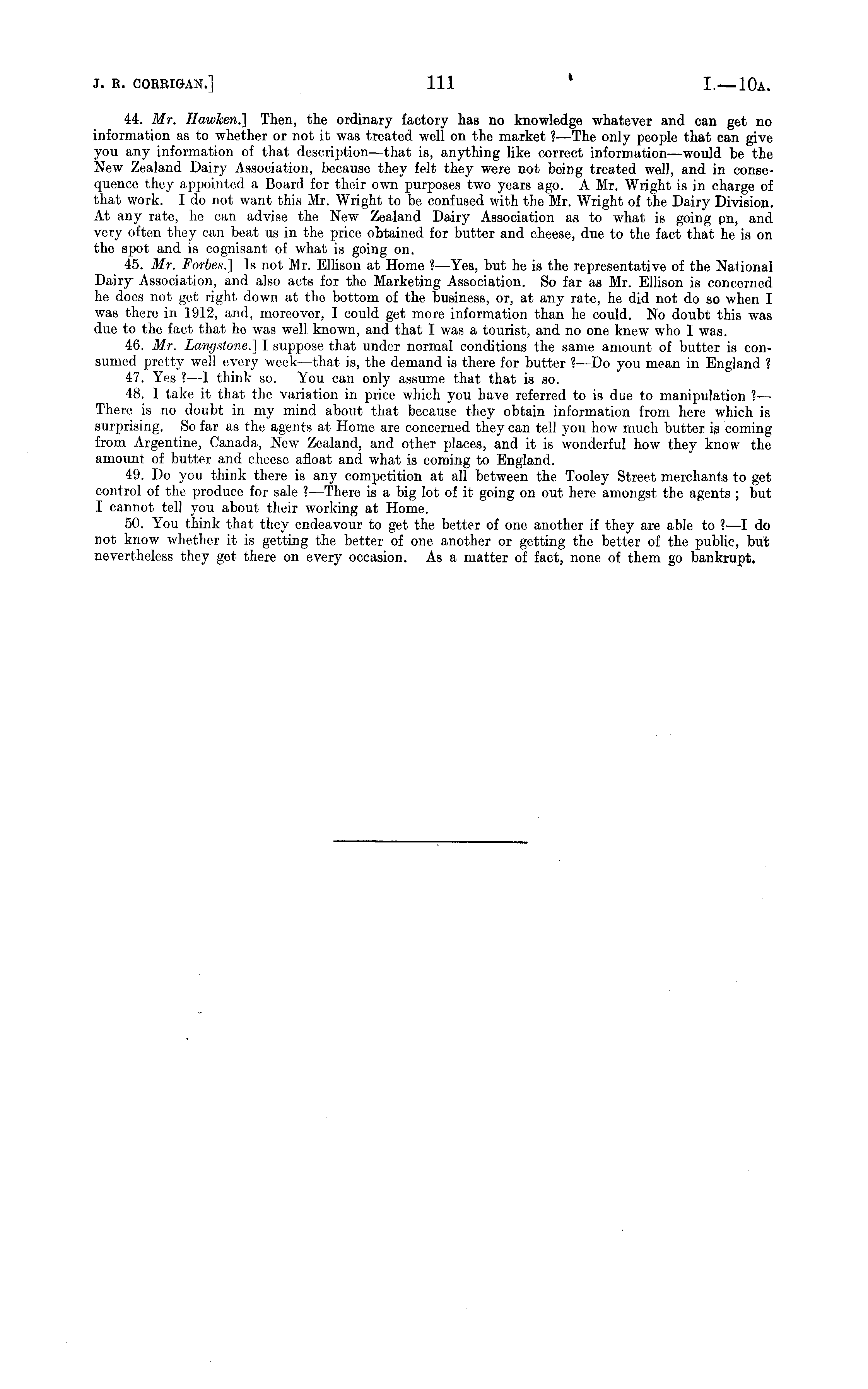 44. Mr. Hawken] Then, the ordinary factory has no knowledge whatever and can get no information as to whether or not it was treated well on the market ?•—The only people that can give you any information of that description—that is, anything like correct information—would be the New Zealand Dairy Association, because they felt they were not being treated well, and in consequence they appointed a Board for their own purposes two years ago. A Mr. Wright is in charge of that work. Ido not want this Mr. Wright to be confused with the Mr. Wright of the Dairy Division. At any rate, he can advise the New Zealand Dairy Association as to what is going pn, and very often they can beat us in the price obtained for butter and cheese, due to the fact that he is on the spot and is cognisant of what is going on. 45. Mr. Forbes] Is not Mr. Ellison at Home ? —Yes, but he is the representative of the National Dairy Association, and also acts for the Marketing Association. So far as Mr. Ellison is concerned he does not get right down at the bottom of the business, or, at any rate, he did not do so when I was there in 1912, and, moreover, I could get more information than he could. No doubt this was due to the fact that ho was well known, and that I was a tourist, and no one knew who I was. 46. Mr, Langstone] I suppose that under normal conditions the same amount of butter is consumed pretty well every week—that is, the demand is there for butter ? —Do you mean in England ? 47. Yes ? —I think so. You can only assume that that is so. 48. I take it that the variation in price which you have referred to is due to manipulation ?— There is no doubt in my mind about that because they obtain information from here which is surprising. So far as the agents at Home are concerned they can tell you how much butter is coming from Argentine, Canada, New Zealand, and other places, and it is wonderful how they know the amount of butter and cheese afloat and what is coming to England. 49. Do you think there is any competition at all between the Tooley Street merchants to get control of the produce for sale ? —There is a big lot of it going on out here amongst the agents ; but I cannot tell you about their working at Home. 50. You think that they endeavour to get the better of one another if they are able to ? —I do not know whether it is getting the better of one another or getting the better of the public, but nevertheless they get there on every occasion. As a matter of fact, none of them go bankrupt.