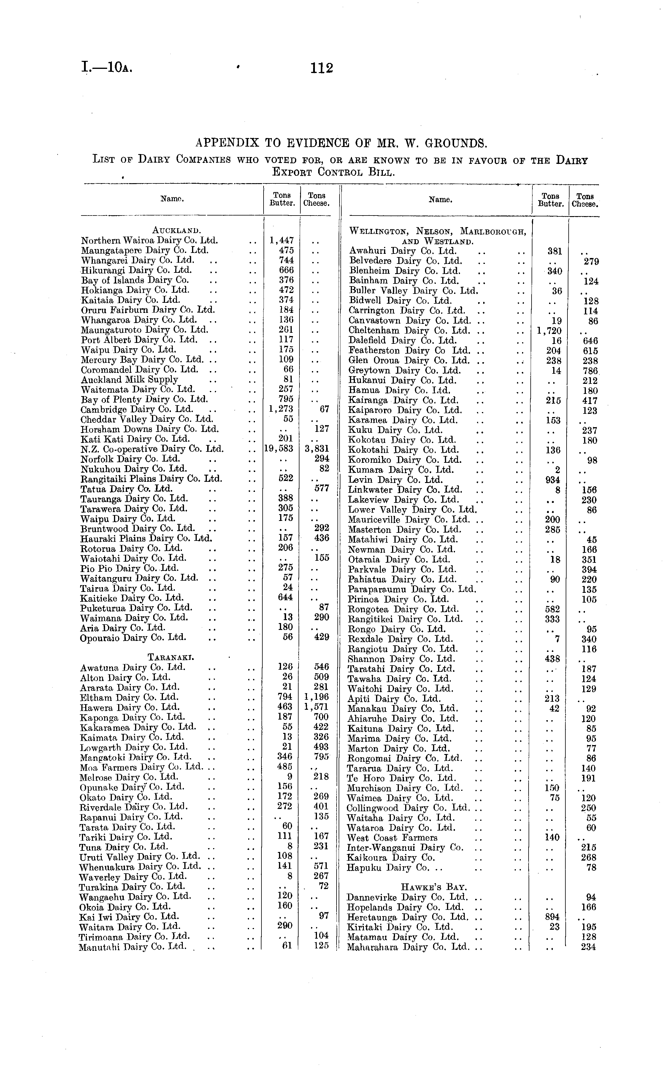 APPENDIX TO EVIDENCE OF MR. W. GROUNDS. List of Dairy Companies who voted for, or are known to be in favour of the Dairy Export Control Bill.