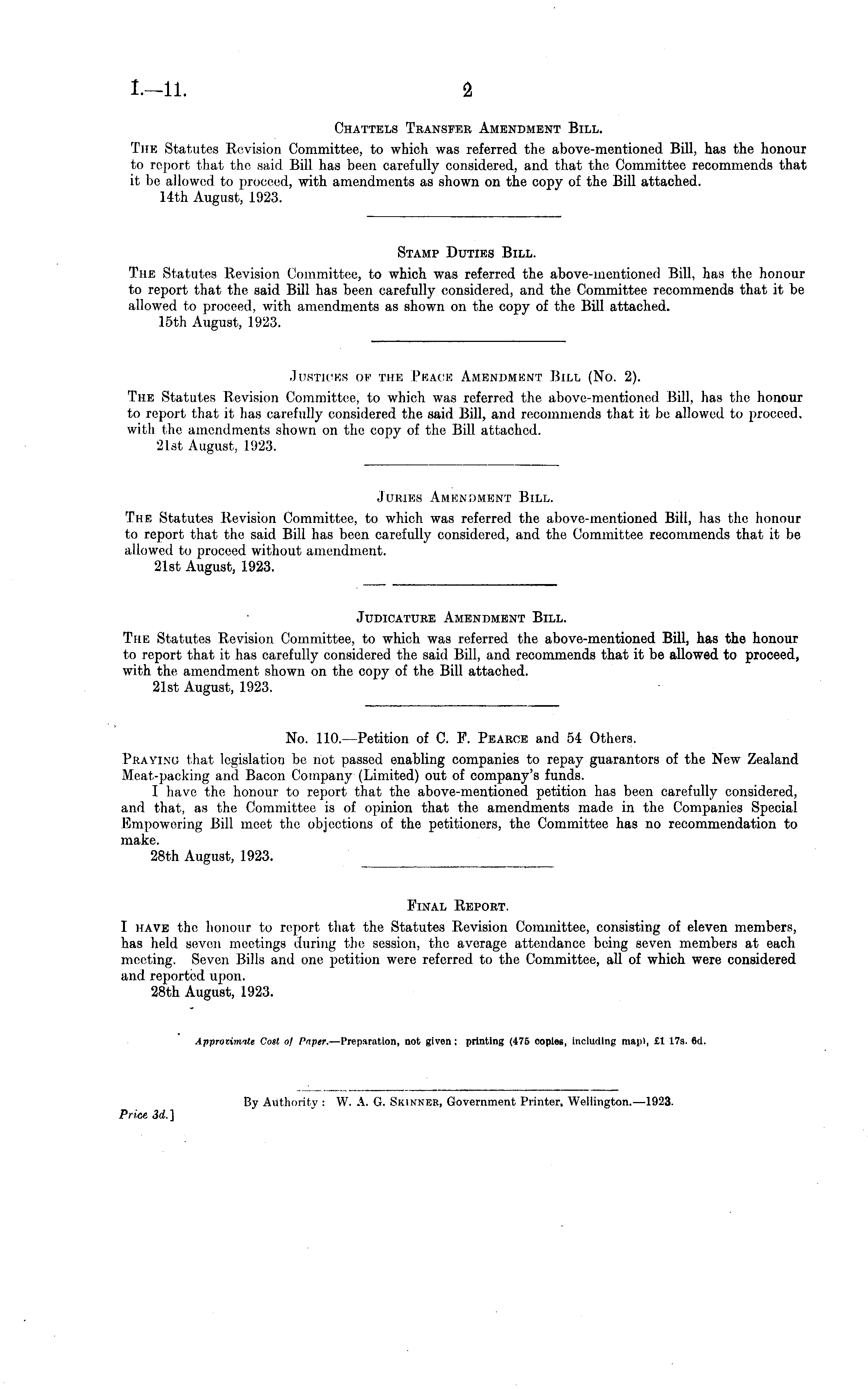 Final Report. I have the honour to report that the Statutes Revision Committee, consisting of eleven members, has held seven meetings during the; session, the average attendance being seven members at each meeting. Seven Bills and one petition were referred to the Committee, all of which were considered and reported upon. 28th August, 1923.