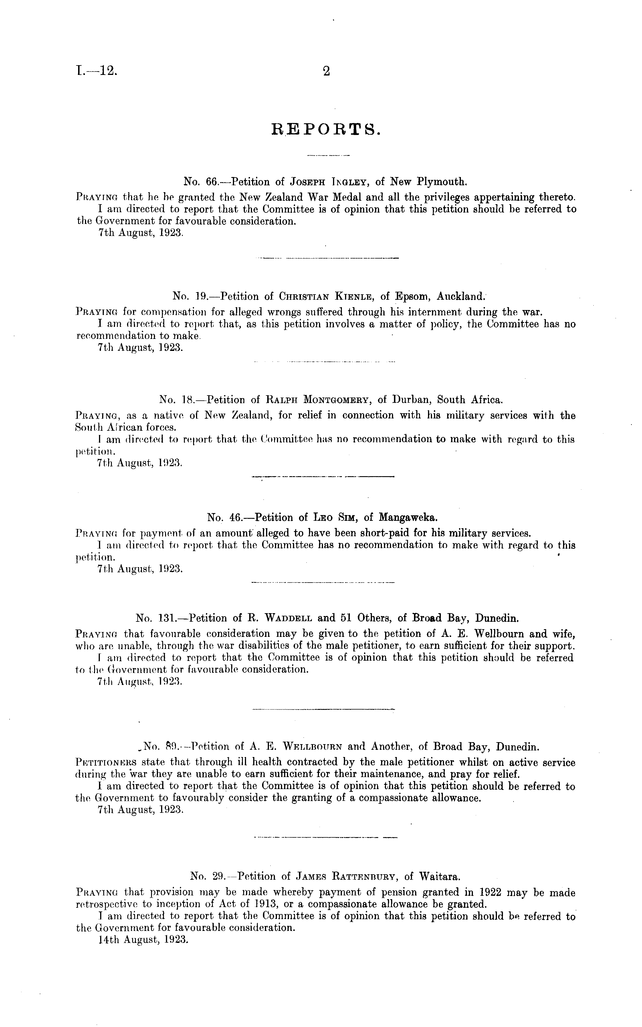 No. 18.—Petition of Ralph Montgomery, of Durban, South Africa. Praying, as a native of New Zealand, for relief in connection with his military services with the South African forces. 1 am directed to report that the Committee has no recommendation to make with regard to this petition. 7th August, 1923.