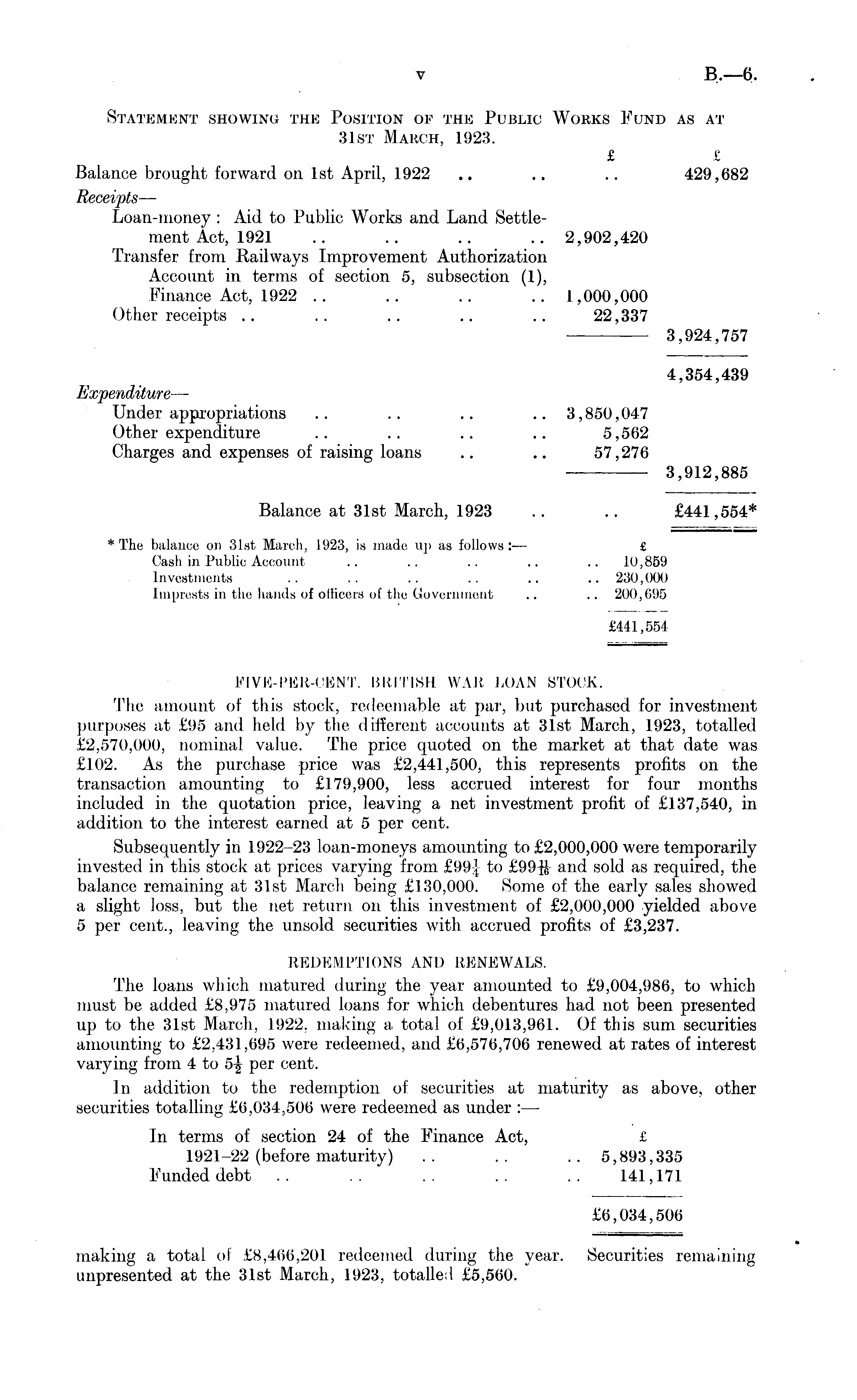 Statement showing the Position of the Public Works Fund as at 31st March, 1923. £ £ Balance brought forward on Ist April, 1922 .. .. .. 429,682 Receipts — Loan-money : Aid to Public Works and Land Settlement Act, 1921 .. .. .. .. 2,902,420 Transfer from Railways Improvement Authorization Account in terms of section 5, subsection (l), Finance Act, 1922 .. .. .. .. 1,000,000 Other receipts .. .. .. .. .. 22,337 3,924,757 4,354,439 Expenditure — Under appropriations .. .. .. .. 3,850,047 Other expenditure .. .. .. .. 5,562 Charges and expenses of raising loans .. .. 57,276 3,912,885 Balance at 31st March, 1923 .. .. £441,554* * The balance on 31st March, 1923, is made up as follows:— £ Cash in Public Account .. .. .. .. .. 10,859 investments .. .. .. .. .. .. 230,(XX1 imprests in the hands of officers of the Government .. .. 200,695 £441,551 FIVE-PER-CENT. BRITISH WAR LOAN STOCK. The amount of this stock, redeemable at par, but purchased for investment purposes at £95 and held by the different accounts at 31st March, 1923, totalled £2,570,000, nominal value. The price quoted on the market at that date was £102. As the purchase price was £2,441,500, this represents profits on the transaction amounting to £179,900, less accrued interest for four months included in the quotation price, leaving a net investment profit of £137,540, in addition to the interest earned at 5 per cent. Subsequently in 1922-23 loan-moneys amounting to £2,000,000 were temporarily invested in this stock at prices varying from £99j to and sold as required, the balance remaining at 31st March being £130,000. Some of the early sales showed a slight loss, but the net return on this investment of £2,000,000 yielded above 5 per cent., leaving the unsold securities with accrued profits of £3,237. REDEMPTIONS AND RENEWALS. The loans which matured during the year amounted to £9,004,986, to which must be added £8,975 matured loans for which debentures had not been presented up to the 31st March. 1922. making a total of £9,013,961. Of this sum securities amounting to £2,431,695 were redeemed, and £6,576,706 renewed at rates of interest varying from 4 to 5| per cent. In addition to the redemption of securities at maturity as above, other securities totalling £6,034,506 were redeemed as under : — In terms of section 24 of the Finance Act, £ 1921-22 (before maturity) .. .. ..5,893,335 Kundeddebt .. .. .. .. .. 141,171 £6,034,506 making a total ol £8,466,201 redeemed during the year. Securities remaining unpresented at the 31st March, 1923, totalled £5,500.