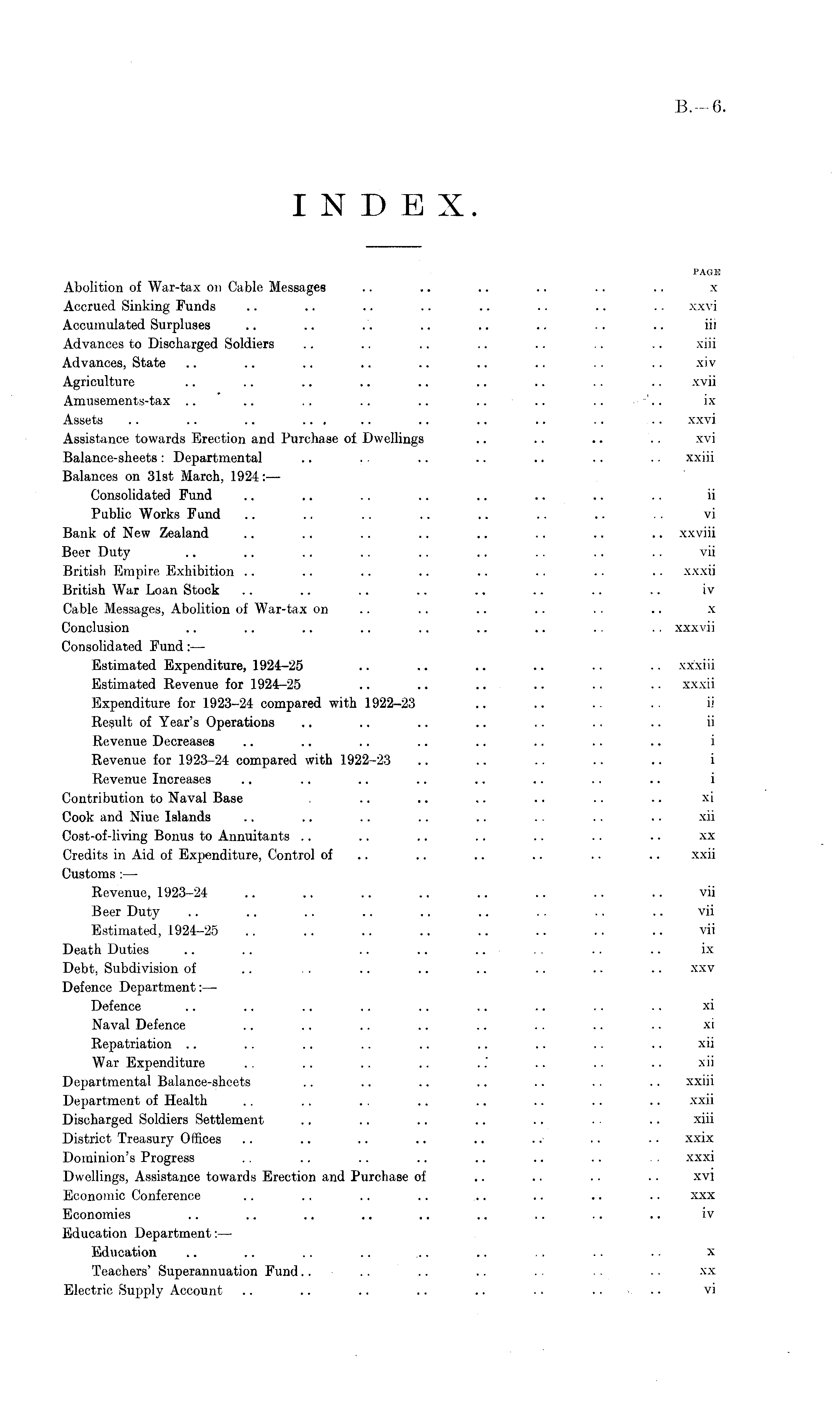INDEX. PAGI Abolition of War-tax on Gable Messages .. .. .. .. .. .. x Accrued Sinking Funds .. .. .. .. .. .. .. .. xxvi Accumulated Surpluses .. .. .'. .. .. .. .. .. iii Advances to Discharged Soldiers .. .. .. .. .. .. .. xiii Advances, State .. .. .. .. .. .. .. .. .. xiv Agriculture .. .. .. .. .. .. .. .. .. xvii Amusements-tax .. .. .. .. .. .... .. ■ '.. ix Assets . . .. .. ... .. .. .. .. . . . . xxvi Assistance towards Erection and Purchase of Dwellings .. .. .. .. xvi Balance-sheets: Departmental .. . . .. .. .. .. . • xxiii Balances on 31st March, 1924:— Consolidated Fund .. .. .. .. .. .. .. .. ii Public Works Fund .. .. .. .. .. .. .. . . vi Bank of New Zealand .. .. .. .. .. .. .. .. xxviii Beer Duty .. .. .. .. .. .. .. .. .. vii British Empire Exhibition .. .. .. .. .. .. .. .. xxxii British War Loan Stock .. .. .. .. .. .. .. .. iv Cable Messages, Abolition of War-tax on .. .. .. .. .. .. x Conclusion .. .. .. .. .. .. .. .. .. xxxvii Consolidated Fund: — Estimated Expenditure, 1924-25 .. .. .. .. .. .. xxxiii Estimated Revenue for 1924-25 .. .. .. .. .. .. xxxii Expenditure for 1923-24 compared with 1922-23 .. .. .. .. ii Result of Year's Operations .. .. .. .. .. .. .. ii Revenue Decreases .. .. .. .. .. .. .. .. i Revenue for 1923-24 compared with 1922-23 .. .. .. .. .. i Revenue Increases .. .. .. .. .. .. .. .. i Contribution to Naval Base . .. .. .. .. .. .. xi Cook and Niue Islands .. .. .. .. .. .. .. .. xii Cost-of-living Bonus to Annuitants .. .. .. .. .. . . .. xx Credits in Aid of Expenditure, Control of .. .. .. .. .. xxii Customs :— Revenue, 1923-24 .. .. .. .. .. .. .. .. vii Beer Duty .. .. .. .. .. .. .. .. .. vii Estimated, 1924-25 .. .. .. .. .. .. .. .. vii Death Duties .. .. .. .. .. .. .. .. ix Debt, Subdivision of .. .. .. .. .. .. .. .. xxv Defence Department: — Defence .. .. .. .. .. .. .. .. .. xi Naval Defence .. .. .. .. .. .. .. .. xi Repatriation .. .. .. .. .. .. .. .. .. xii War Expenditure .. .. .. .. ..' .. .. .. xii Departmental Balance-sheets .. .. .. .. .. .. .. xxiii Department of Health .. .. .. .. .. .. .. .. xxii Discharged Soldiers Settlement .. .. .. .. .. . • .. xiii District Treasury Offices .. .. .. .. .. .. .. • • xxix Dominion's Progress .. .. .. .. .. .. .. xxxi Dwellings, Assistance towards Erection and Purchase of .. .. .. .. XV] Economic Conference .. .. .. .. .. .. .. .. xxx Economies .. .. .. .. .. .. .. . . .. iv Education Department:— Education .. .. .. .. .. .. .. .. . ■ x Teachers' Superannuation Fund.. .. .. .. .. .. .. xx Electric Supply Account .. .. .. .. .. .. ...... vi