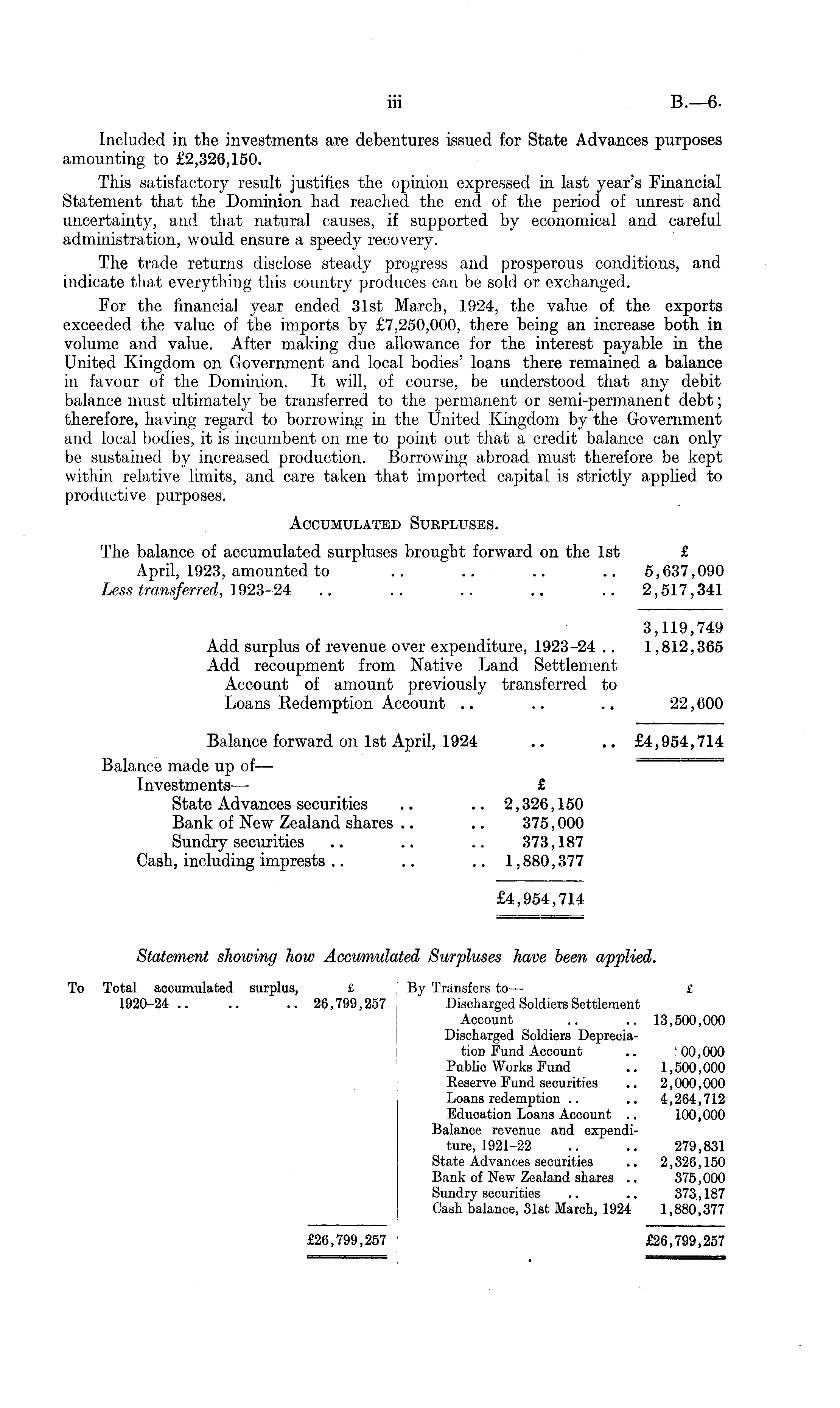 Included in the investments are debentures issued for State Advances purposes amounting to £2,326,150. This satisfactory result justifies the opinion expressed in last year's Financial Statement that the Dominion had reached the end of the period of unrest and uncertainty, and that natural causes, if supported by economical and careful administration, would ensure a speedy recovery. The trade returns disclose steady progress and prosperous conditions, and indicate that everything this country produces can be sold or exchanged. For the financial year ended 31st March, .1924, the value of the exports exceeded the value of the imports by £7,250,000, there being an increase both in volume and value. After making due allowance for the interest payable in the United Kingdom on Government and local bodies' loans there remained a balance in favour of the Dominion. It will, of course, be understood that any debit balance must ultimately be transferred to the permanent or semi-permanent debt; therefore, having regard to borrowing in the United Kingdom by the Government and local bodies, it is incumbent on me to point out that a credit balance can only be sustained by increased production. Borrowing abroad must therefore be kept within relative limits, and care taken that imported capital is strictly applied to productive purposes. Accumulated Surpluses. The balance of accumulated surpluses brought forward on the Ist £ April, 1923, amounted to .. .. .. .. 5,637,090 Less transferred, 1923-24 .. .. .. .. .. 2,517,341 3,119,749 Add surplus of revenue over expenditure, 1923-24 .. 1,812,365 Add recoupment from Native Land Settlement Account of amount previously transferred to Loans Redemption Account .. .. .. 22,600 Balance forward on Ist April, 1924 .. .. £4,954,714 Balance made up of — Investments — £ State Advances securities .. .. 2,326,150 Bank of New Zealand shares .. .. 375,000 Sundry securities .. .. .. 373,187 Cash, including imprests .. .. 1,880,377 £4,954,714 Statement showing how Accumulated Surpluses have been applied. To Total accumulated surplus, £ By Transfers to — £ 1920-24 .. .. .. 26,799,257 Discharged Soldiers Settlement Account .. .. 13,500,000 Discharged Soldiers Depreciation Fund Account .. '00,000 Public Works Fund .. 1,500,000 Reserve Fund securities .. 2,000,000 Loans redemption .. .. 4,264,712 Education Loans Account .. 100,000 Balance revenue and expenditure, 1921-22 .. .. 279,831 State Advances securities .. 2,326,150 Bank of New Zealand shares .. 375,000 Sundry securities .. .. 373,, 187 Cash balance, 31st March, 1924 1,880,377 £26,799,257 £26,799,257