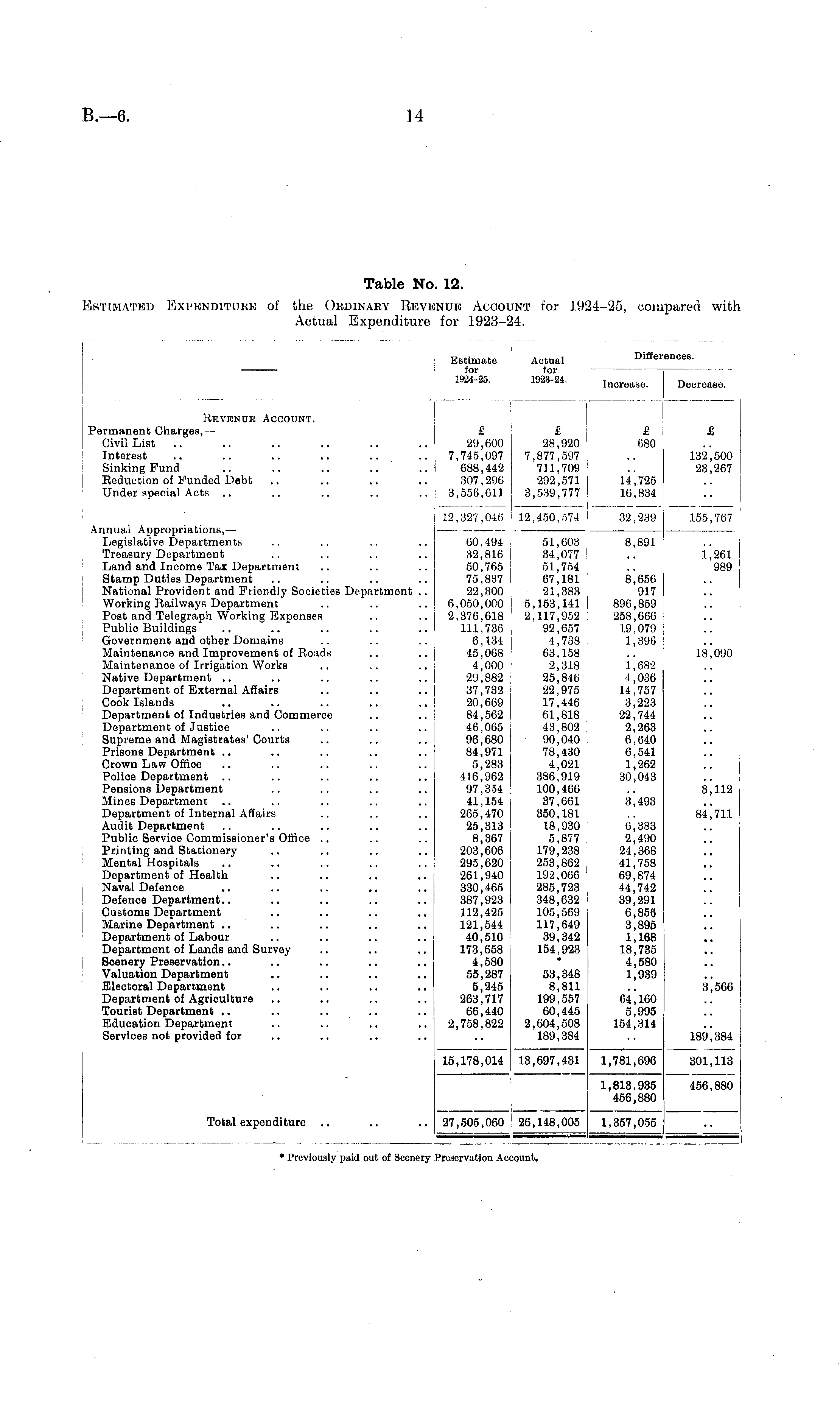 Differences. Estimate for 1924-25. Actual for 1923-24. Increase. Decrease. Revenue Account. £ Permanent Charges,— Civil List Interest .. .. .. .. Sinking Fund Reduction of Funded Debt Under special Acts £ 29,600 7,745,097 688,442 307,296 3,556,611 £ 28,920 7,877,597 711,709 292,571 3,539,777 £ 680 132,500 23,267 14,725 16,834 12,327,046 12,450,574 32,239 155,767 Annual Appropriations,— Legislative Departments Treasury Department Land and Income Tax Department Stamp Duties Department National Provident and Friendly Societies Department .. Working Railways Department Post and Telegraph Working Expenses Public Buildings Government and other Domains Maintenance and Improvement of Bonds Maintenance of Irrigation Works Native Department Department of External Affairs Cook Islands Department of Industries and Commerce Department of Justice Supreme and Magistrates' Courts Prisons Department .. Crown Law Offioe Police Department Pensions Department Mines Department Department of Internal Affairs Audit Department Public Service Commissioner's Office .. Printing and Stationery Mental Hospitals Department of Health Naval Defence Defence Department.. Customs Department Marine Department Department of Labour Department of Lands and Survey Soenery Preservation.. Valuation Department Eleotoral Department Department of Agrioulture Tourist Department Education Department Servioes not provided for 60,494 32,816 50,765 75,837 22,300 6,050,000 2,376,618 111,736 6,134 45,068 4,000 29,882 37,732 20,669 84,562 46,065 96,680 84,971 5,283 416,962 97,354 41,154 265,470 25,313 8,367 203,606 295,620 261,940 330,465 387,923 112,425 121,544 40,510 173,658 4,580 55,287 5,245 263,717 66,440 2,758,822 51,603 34,077 51,754 67,181 21,383 5,153,141 2,117,952 92,657 4,738 63,158 2,318 25,846 22,975 17,446 61,818 43,802 90,040 78,430 4,021 386,919 100,466 37,661 350,181 18,930 5,877 179,238 253,862 192,066 285,723 348,632 105,569 117,649 39,342 154,923 8,891 8,656 917 896,859 258,666 19,079 1,396 1,682 4,036 14,757 3,223 22,744 2,263 6,640 6,541 1,262 30,043 3,493 i,'261 989 18,090 3412 6,383 2,490 24,368 41,758 69,874 44,742 39,291 6,856 3,895 1,168 18,735 4,580 1,939 84^711 53,348 8,811 199,557 60,445 2,604,508 189,384 64,160 5,995 154,314 31566 189"384 15,178,014 13,697,431 1,781,696 301,113 1,813,935 456,880 456,880 Total expenditure .. 27,505,060 26,148,005 1,357,055 * Previously paid out of Scenery Preservation Ac louiit.