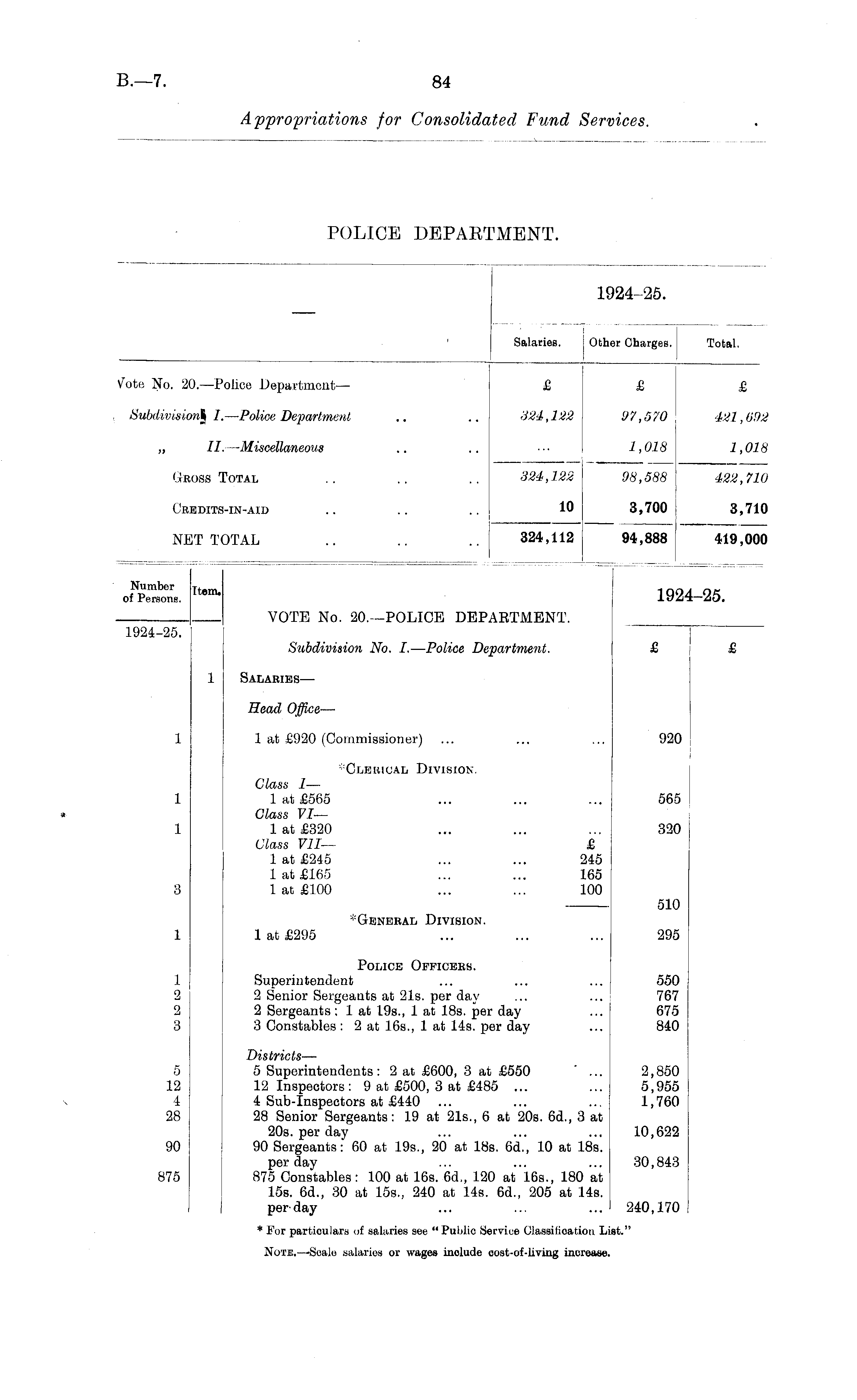 Salaries. 1924-25. Other Charges. Total. Vote No. 20.—Police Department— £ £ £ Subdivision\, I. — Police Department I 324,122 97,570 421,692 „ II. — Miscellaneous 1,018 1,018 Gross Total 324,122 98,588 422,710 Credits-in-aid 10 3,700 3,710 NET TOTAL 324,112 94,888 419,000 Number Item# of Persons. Item. 19 14-25. VOTE No. 20.—POLICE DEPARTMENT. 1924-25. Subdivision No. I. — Police Department. Salaries— Head Office — 1 at £920 (Commissioner) 920 *Clerical Division. Class I — 1 at £565 Class VI— 1 at £320 Class VII— £ 1 at £245 ... ... 245 1 at £165 ... ... 165 1 at £100 ... ... 100 565 I 1 320 3 510 1 Division. 1 at £295 295 1 2 2 3 Police Officers. 550 767 675 840 Superintendent 2 Senior Sergeants at 21s. per day 2 Sergeants; 1 at 19s., 1 at 18s. per day 3 Constables : 2 at 16s., 1 at 14s. per day \ 5 12 4 28 90 Districts — 5 Superintendents: 2 at £600, 3 at £550 ' ... 12 Inspectors: 9 at £500, 3 at £485 ... 4 Sub-Inspectors at £440 28 Senior Sergeants: 19 at 21s., 6 at 20s. 6d., 3 at 20s. per day 90 Sergeants: 60 at 19s., 20 at 18s. 6d., 10 at 18s. per day 875 Constables: 100 at 16s. 6d., 120 at 16s., 180 at 15s. 6d., 30 at 15s., 240 at 14s. 6d., 205 at 14s. per day 2,850 5,955 1,760 10,622 875 30,843 240,170 * For partioulars of salaries see " Public Service Classification Li ist." Note.—-Scale salaries or wages inolude cost-of-living increase.