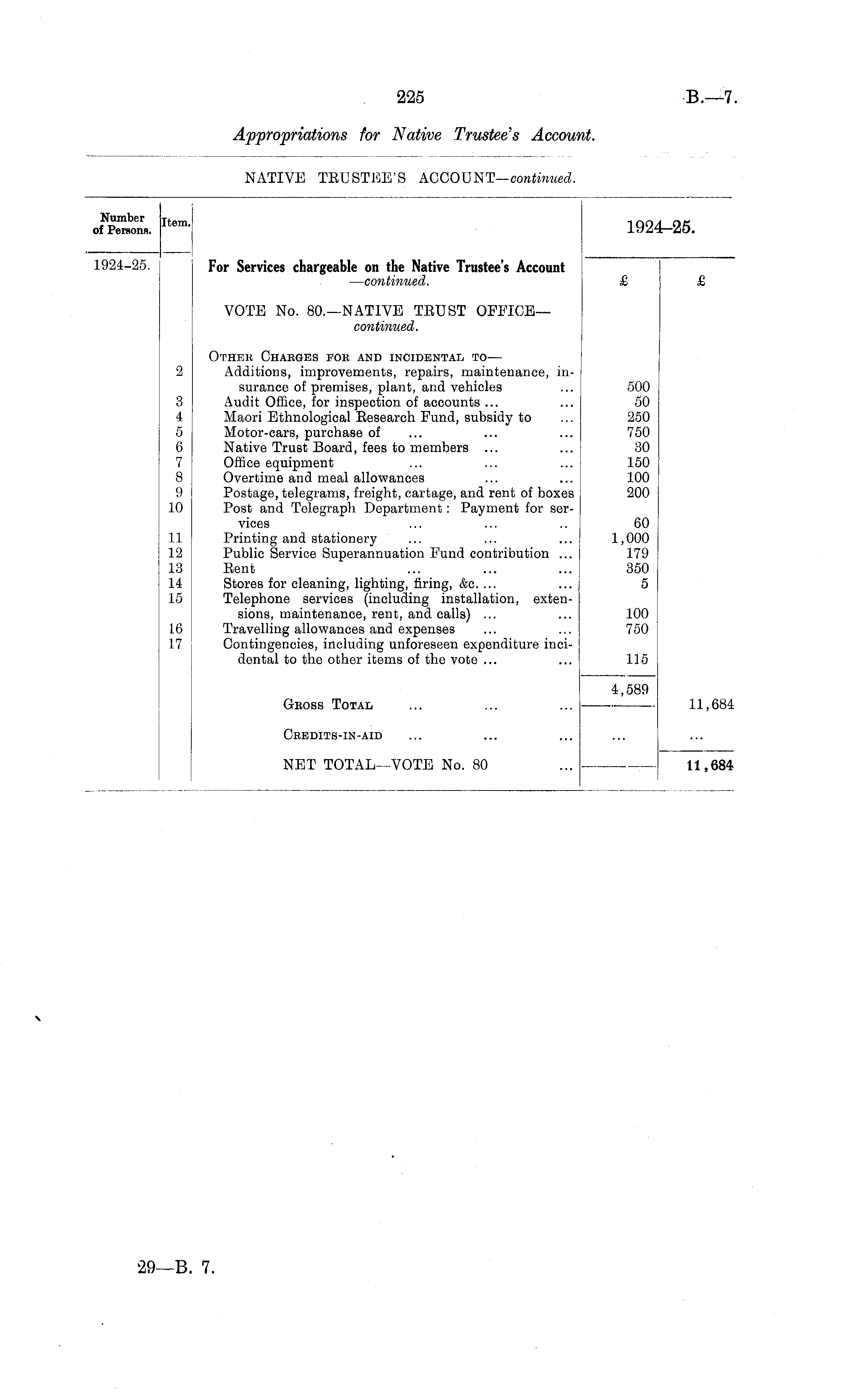 Number of Persons. Item. 192 25. 1924-25. For Services chargeable on the Native Trustee's Account — continued. VOTE No. 80.—NATIVE TRUST OFFICE— continued. 2 3 4 5 6 7 8 9 10 Other Charges for and incidental to — Additions, improvements, repairs, maintenance, insurance of premises, plant, and vehicles Audit Office, for inspection of accounts ... Maori Ethnological Research Fund, subsidy to Motor-cars, purchase of Native Trust Board, fees to members ... Office equipment Overtime and meal allowances Postage, telegrams, freight, cartage, and rent of boxes Post and Telegraph Department : Payment for services Printing and stationery Public Service Superannuation Fund contribution ... Rent Stores for cleaning, lighting, firing, &c. ... Telephone services (including installation, extensions, maintenance, rent, and calls) ... Travelling allowances and expenses Contingencies, including unforeseen expenditure incidental to the other items of the vote ... 500 50 250 750 30 150 100 200 60 1,000 179 350 5 11 12 13 14 15 16 17 100 750 115 Gross Total 4,589 11,684 Credits-in-aid NET TOTAL—VOTE No. 80 11,684