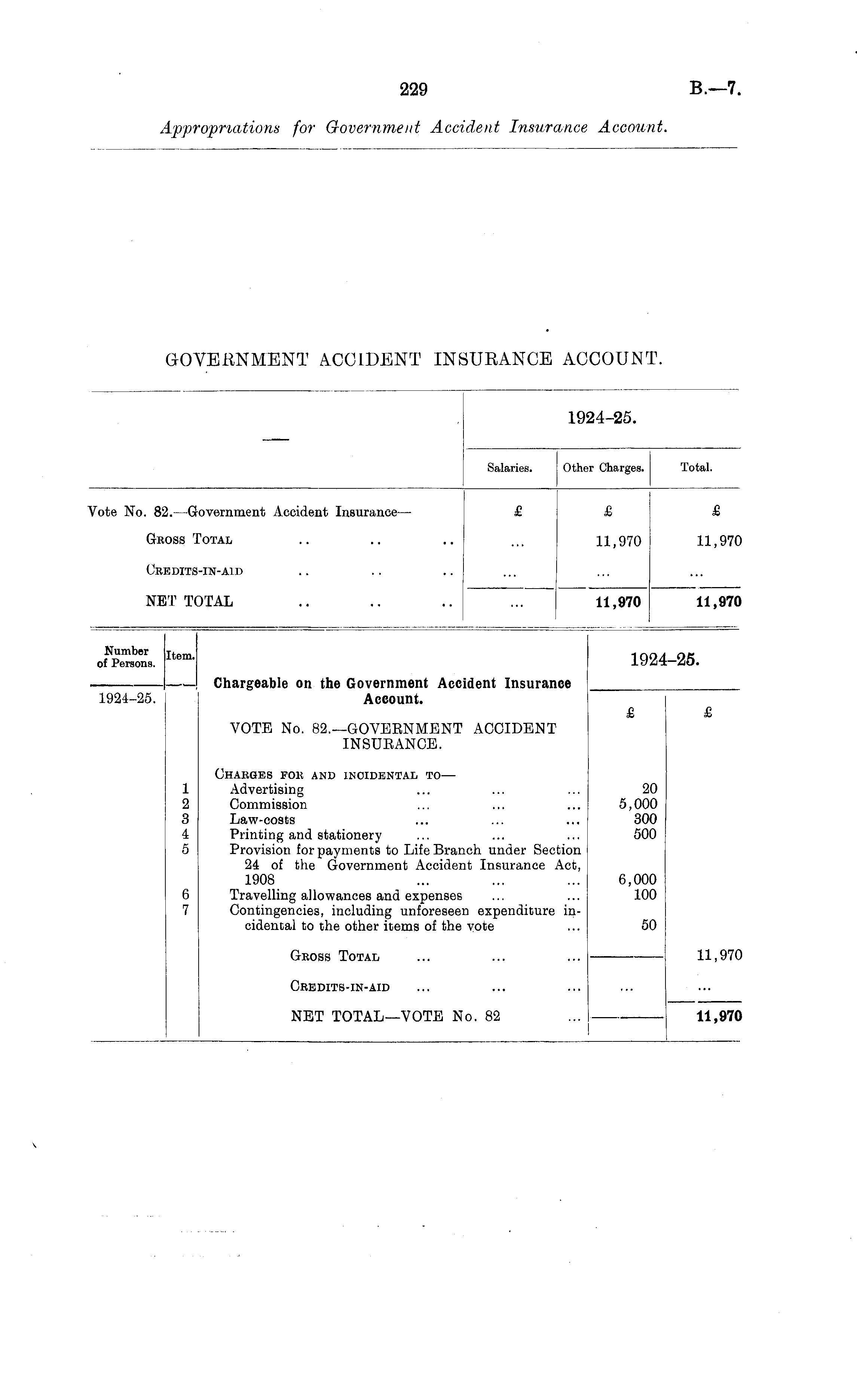 Salaries. 1924-25. Other Charges. 1924-25. Total. Vote No. 82. —Government Accident Insurance — £ £ £ Gross Total 11,970 11,970 Credits-in-aid NET TOTAL 11,970 11,970 Number of Persons. Item. Chargeable on the Government Accident Insurance Account. 19 -25. 1924-25. VOTE No. 82.—GOVERNMENT ACCIDENT INSURANCE. £ 1 2 3 4 5 6 7 1 2 8 4 5 Charges for and incidental to — Advertising Commission Law-costs Printing and stationery Provision for payments to Life Branch under Section 24 of the Government Accident Insurance Act, 1908 Travelling allowances and expenses Contingencies, including unforeseen expenditure incidental to the other items of the vote 20 5,000 300 500 6,000 100 6 7 50 Gross Total 11,970 Credits-in-aid NET TOTAL—VOTE No. 82 11,970