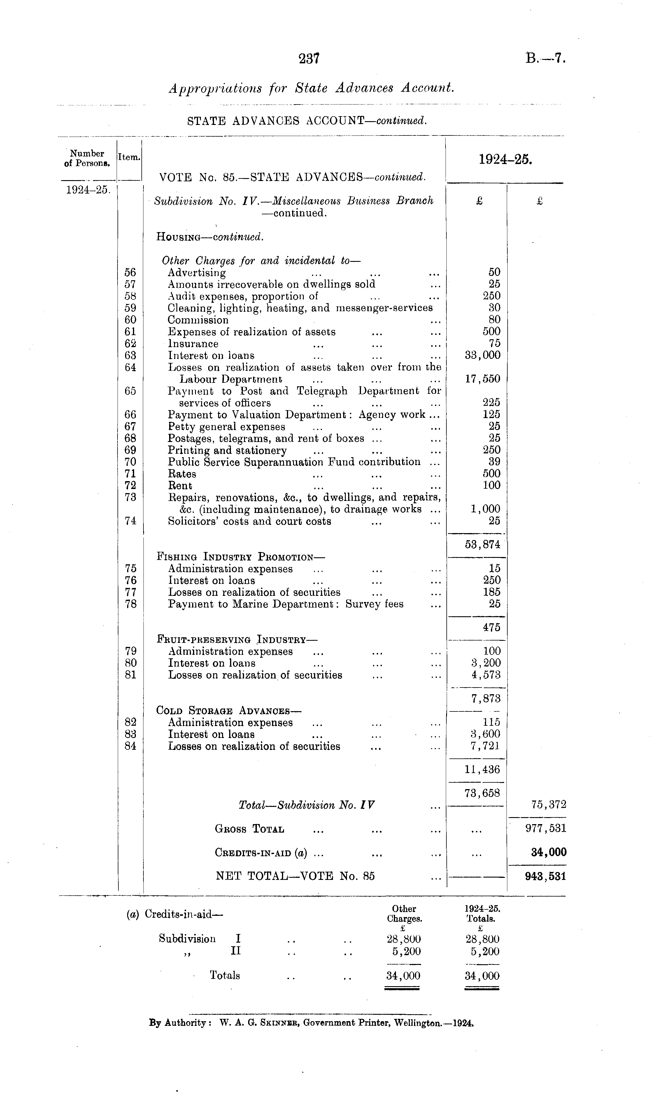 Number of Persons. Item. I VOTE No. 85.—STATE ADVANCES— continued. 1924-25. 1924-25. Subdivision No. IV. — Miscellaneous Business Branch —continued. £ Housing— continued. 56 57 58 59 60 61 62 63 64 65 66 67 68 69 70 71 72 73 74 56 .07 58 59 60 61 62 69 64 65 Other Charges for and incidental to — Advertising Amounts irrecoverable on dwellings sold Audit expenses, proportion of Cleaning, lighting, heating, and messenger-services Commission Expenses of realization of assets Insurance Interest on loans Losses on realization of assets taken over from the Labour Department Payment to Post and Telegraph Department for services of officers Payment to Valuation Department: Agency work ... Petty general expenses Postages, telegrams, and rent of boxes ... Printing and stationery Public Service Superannuation Fund contribution ... Rates Rent Repairs, renovations, &c, to dwellings, and repairs, &c. (including maintenance), to drainage works ... Solicitors' costs and court costs 50 25 250 30 80 500 75 33,000 17,550 225 125 25 25 250 39 500 100 (ill 67 68 69 70 71 72 73 74 1,000 25 75 76 77 78 Fishing Industry Promotion— Administration expenses Interest on loans Losses on realization of securities Payment to Marine Department: Survey fees 53,874 : 75 76 77 78 15 250 185 25 79 80 81 Fruit-preserving Industry— Administration expenses Interest on loans Losses on realization of securities 475 79 80 81 100 3,200 4,573 82 83 84 Cold Storage Advances— Administration expenses Interest on loans Losses on realization of securities 7,873 82 83 84 115 3,600 7,721 11,436 Total — Subdivision No. IV 73,658 75,372 Gross Total 977,531 Credits-in-aid (a) ... 34,000 NET TOTAL—VOTE No. 85 943,531