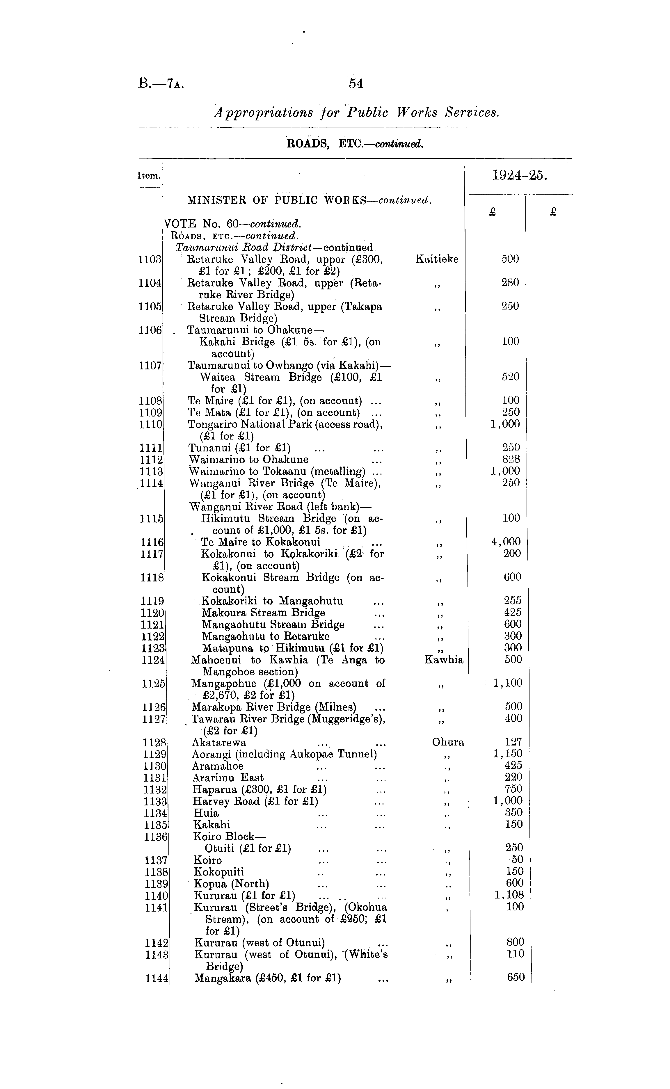 Item. 1924-25. MINISTER OF PUBLIC WORKS— continued. VOTE No. 60— continued. Roads, etc. — continued. Taumarunui Road District— continued. Retaruke Vallev Road, upper (£300, Kaitieke £1 for £1; £200, £1 for £2) Retaruke Valley Road, upper (Reta- ,, ruke River Bridge) Retaruke Valley Road, upper (Takapa ,, Stream Bridge) . Taumarunui to Ohakune— Kakahi Bridge (£1 5s. for £1), (on ,, account) Taumarunui to Owhango (via Kakahi) — Waitea Stream Bridge (£100, £1 for £1) Te Maire (£1 for £1), (on account) ... Te Mata (£1 for £1), (on account) ... Tongariro National Park (access road), ,, (£1 for £1) Tunanui (£1 for £1) Waimarino to Ohakune ... ,, Waimarino to Tokaanu (metalling) ... ,, Wanganui River Bridge (Te Maire), ,, (£1 for £1), (on account) Wanganui River Road (left bank) — i Hikimutu Stream Bridge (on ac- ,, count of £1,000, £1 5s. for £1) I Te Maire to Kokakonui ... ,, Kokakonui to Kpkakoriki (£2 for ,, £1), (on account) i Kokakonui Stream Bridge (on ac- ,, count) I Kokakoriki to Mangaohutu ... ,, ) Makoura Stream Bridge ... ,, Mangaohutu Stream Bridge ... ,, ! Mangaohutu to Retaruke ... ,, i Matapuna to Hikimutu (£1 for £1) ,, [ Mahoenui to Kawhia (Te Anga to Kawhia Mangohoe section) 5 Mangapohue (£1,000 on account of ,, £2,670, £2 for £1) 5 Marakopa River Bridge (Milnes) ... „ J Tawarau River Bridge (Muggeridge's), ,, (£2 for £1) 1 Akacarewa .... ... Ohura 3 Aorangi (including Aukopae Tunnel) ,, 3 Aramahoe ... ... ,, 1 Ararimu East ... ... ,. 2 Haparua (£300, £1 for £1) 3 Harvey Road (£1 for £1) i Huia 5 Kakahi 6 Koiro Block— Otuiti (£lfor£l) 7 Koiro 8 Kokopuiti .. ... ,, 9 Kopua (North) 0 Kururau (£1 for £1) ... . 1 Kururau (Street's Bridge), (Okohua Stream), (on account of £250; £1 for £1) 2 Kururau (west of Otunui) ... ,, 3 Kururau (west of Otunui), (White's ,, Bridge) 4 Mangakara (£450, £1 for £1) £ 500 1103 1104 280 1105 250 1106 100 1107 520 1108 1109 1110 100 250 1,000 1111 1112 1113 1114 250 828 1,000 250 1115 100 1116 1117 4,000 200 1118 600 1119 1120 1121 1122 1123 1124 255 425 600 300 300 500 1125 1,100 1126 1127 500 400 1128 1129 1130 1131 1132 1133 1134 1135 1136 127 1,150 425 220 750 1,000 350 150 1137 1138 1139 1140 1141 250 50 150 600 1,108 100 1142 1143 800 110 1144 650