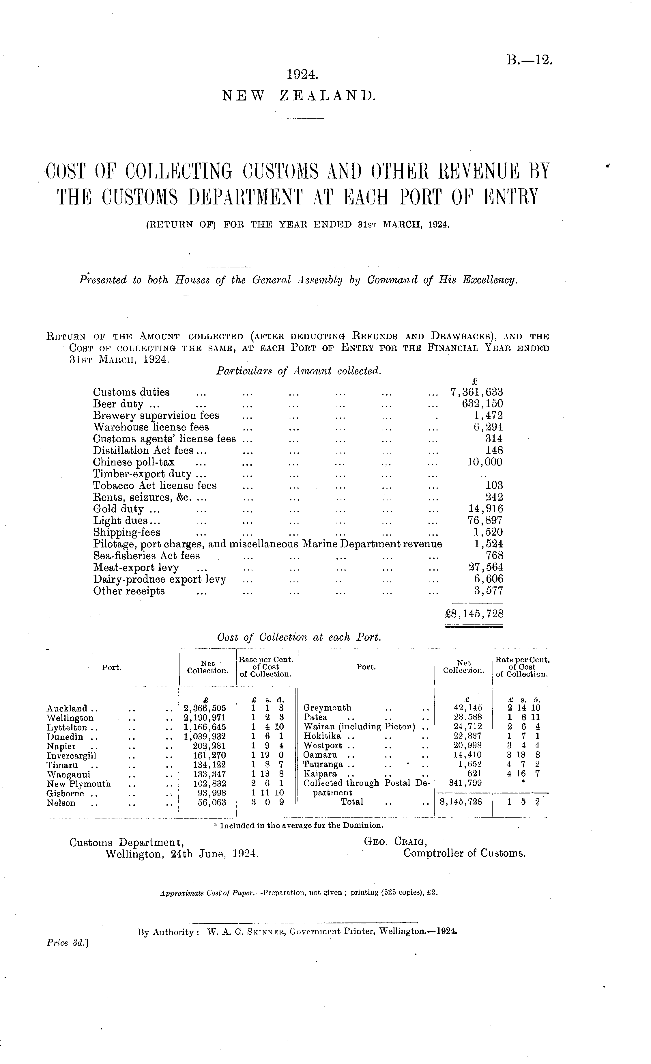 Port. Net Bat^L°t ent - Collection. of option. Port - Collection 0l Cost collection. Qf Conectior Net Collection. Rat« per Cent. of Cost of Collection. Auckland Wellington ... Lyttelton Dunedin .. Napier Invercargill Timaru Wanganui New Plymouth Gisborne Nelson £ £ s. d. 2,366,505 113 2,190,971 1 2 3 1,166,645 1 4 10 1,039,932 1 6 1 202,281 19 4 161,270 1 19 0 134,122 18 7 133,347 1 13 8 102,832 2 6 1 93,998 1 11 10 56,063 3 0 9 £ £ s. a. Greymouth .. .. 42,145 2 14 10 Patea .. .. .. 28,588 1 8 11 Wairau (including Picton) .. 24,712 2 6 4 Hokitika .. .. .. 22,837 17 1 Westport .. .. .. 20,998 3 4 4 Oamaru .. .. .. 14,410 3 18 8 Tauranga .. .. • .. 1,652 4 7 2 Kaipara .. .. .. 621 4 16 7 Collected through Postal De- 341,799 parbrnent Total .. .. 8,145,728 1 5 2 £ 42,145 28,588 24,712 22,837 20,998 14,410 1,652 621 341,799 £ s. a. 2 14 10 1 8 11 2 6 4 1 7 1 3 4 4 3 18 8 4 7 2 4 16 7 * * Included in the avei rage for the Dominion. Customs Departmen Wellington, 2 i'th June, 1924. Geo. Craig, Comptroller of Customs.