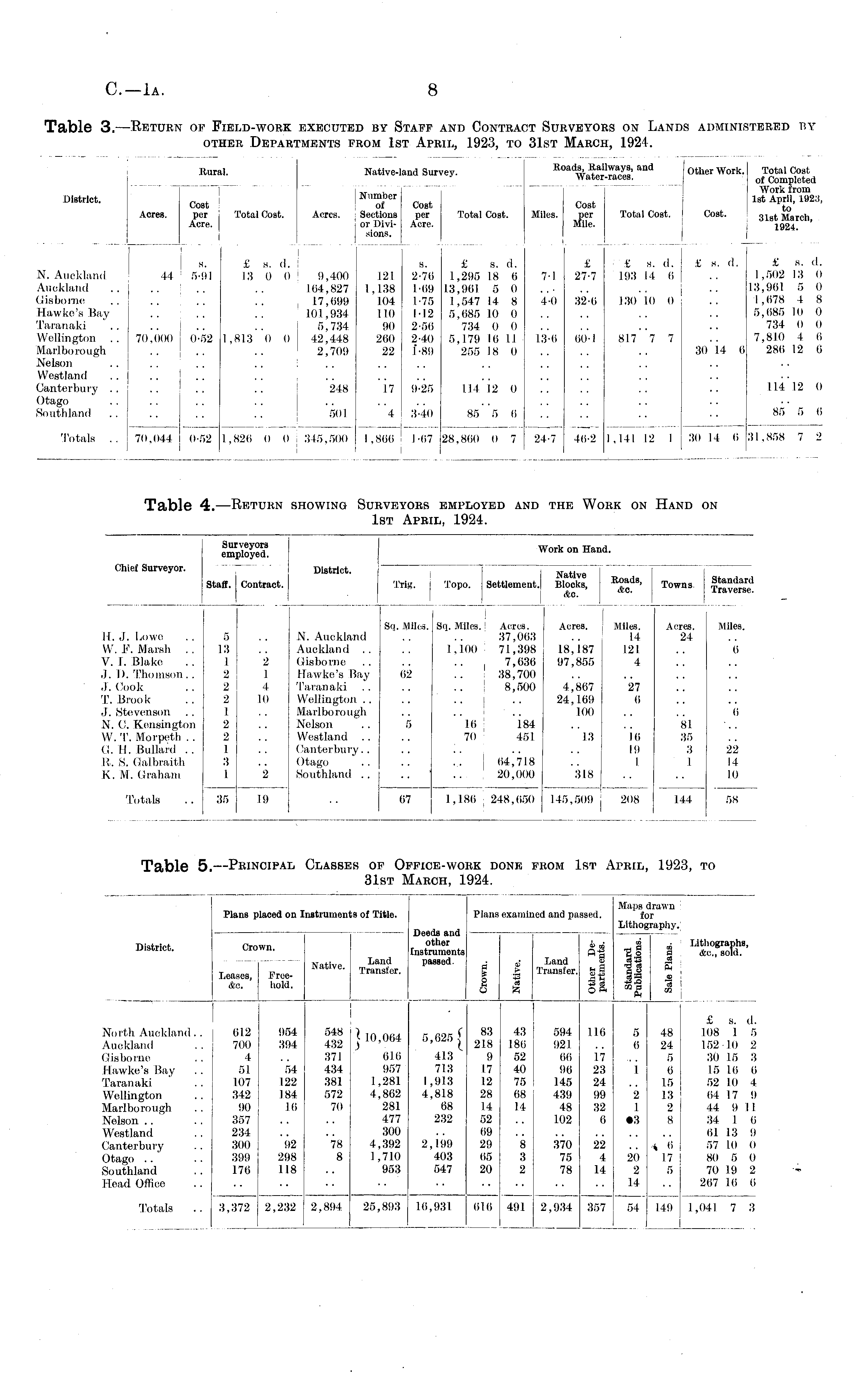 Surveyors employed. Chief Surveyor. Staff. Contract. District. Trig. Topo. Settlement. Work on Hand. Native Blocks, Ac. Roads, Ac. Towns Standard Traverse. II. ,1. Lowe . , 5 . . JS W. F. Marsh .. 13 .. A V. I. Blake .. 1 2 0 ,1. D. Thomson.. 2 1 II J. Cook . . 2 4 T T. Brook .. 2 10 V J. Stevenson .. 1 .. M N. C. Kensington 2 .. N W. T. Morpeth .. 2 .. V G. H. Bullard .. 1 .. C R. S. Galbraith 3 .. (1 K. M. Graham I 2 S M. Auckland Auckland iis borne Hawke's Ba; Caran aid Wellington . Uarlbo rough Melson Westland Canterbury. Otago Southland . 6 i ■y Sq. Mil 02 5 Sq. Miles. Sq. Miles, j Acres. 37,063 1,100 ' 71,398 7,636 ' 38,700 8,500 Acres. Miles. 14 121 4 Acres. 24 Miles. N. Auckland Auckland . . Gisborne Hawke's Bay Taranaki Wellington .. Marlborough Nelson Westland Canterbury.. Otago Southland . . 62 5 ! 16 | 184 70 451 18J87 97,855 4,807 24,109 100 27 (i 81 35 3 1 6 0 13 10 1!) I 22 14 10 j 20,000 318 Totals .. 35 19 07 07 1,180 , 248,050 145,509 20S 144 58