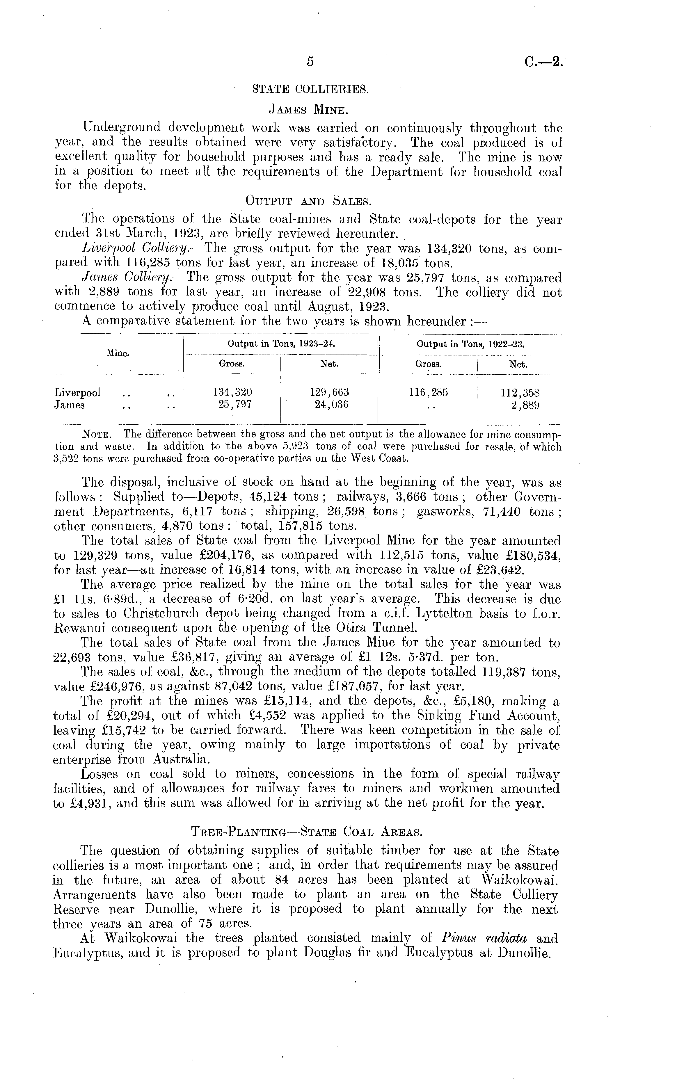 STATE COLLIERIES. James Mine. Underground development work was carried on continuously throughout the year, and the results obtained were very satisfactory. The coal produced is of excellent quality for household purposes and has a ready sale. The mine is now in a position to meet all the requirements of the Department for household coal for the depots. Output and Sales. The operations of the State coal-mines and State coal-depots for the year ended 31st March, 1923, are briefly reviewed hereunder. Liverpool Colliery, -The gross output for the year was 134,320 tons, as compared with 116,285 tons for last year, an increase of 18,035 tons. James Colliery. —The gross output for the year was 25,797 tons, as compared with 2,889 tons for last year, an increase of 22,908 tons. The colliery did not commence to actively produce coal until August, 1923. A comparative statement for the two years is shown hereunder : —