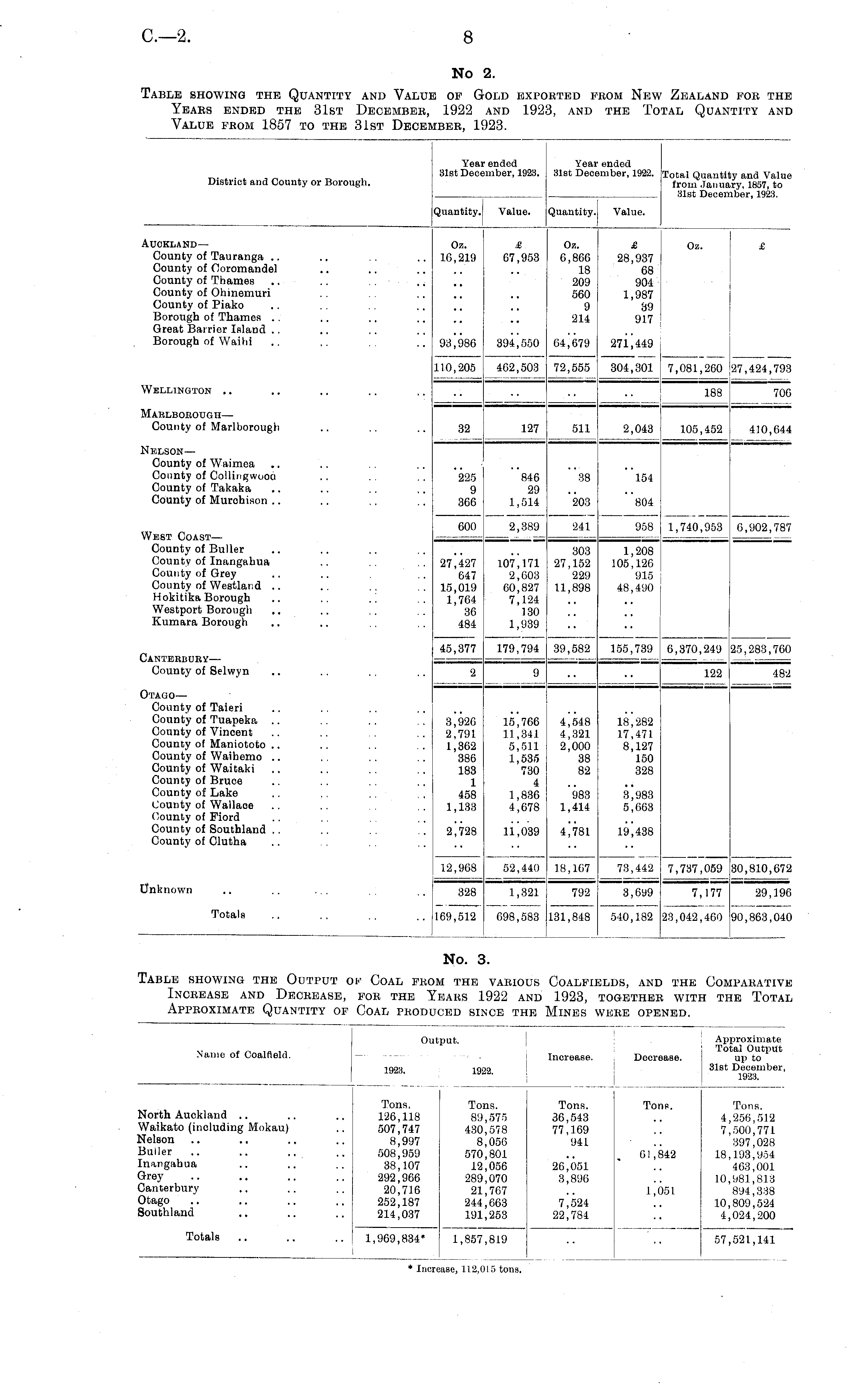 No 2. Table showing the Quantity and Value of Gold exported from New Zealand for the Years ended the 31st December, 1922 and 1923, and the Total Quantity and Value from 1857 to the 31st December, 1923.
