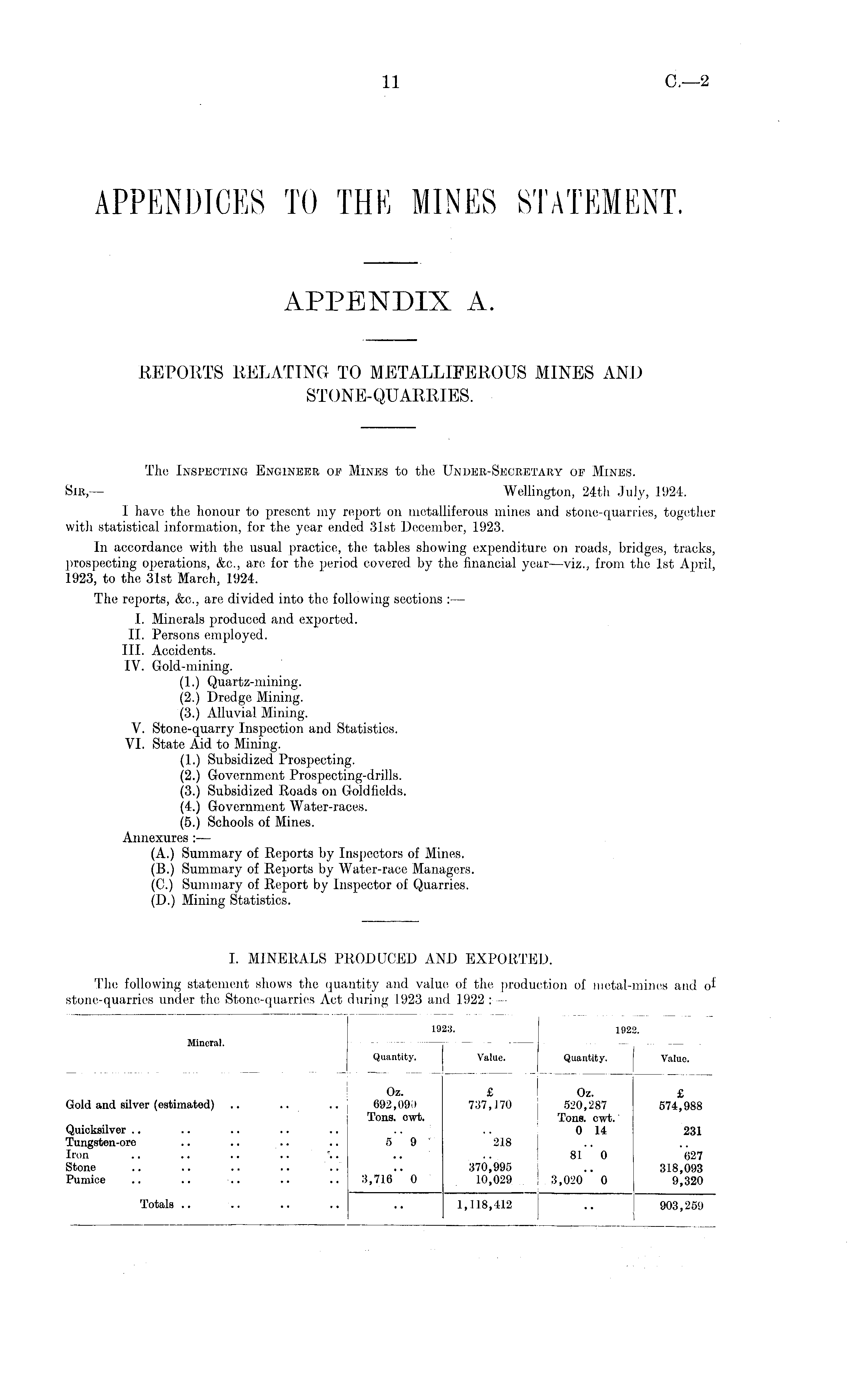 The Inspecting Engineer of Mines to the Under-Secretary of Mines. Sir,— Wellington, 24th July, 1924. I have the honour to present my report on metalliferous mines and stone-quarries, together with statistical information, for the year ended 31st December, 1923. In accordance with the usual practice, the tables showing expenditure on roads, bridges, tracks, prospecting operations, &c, are for the period covered by the financial year —viz., from the Ist April, 1923, to the 31st March, 1924. The reports, &c, are divided into the following sections : — I. Minerals produced and exported. 11. Persons employed. 111. Accidents. IV. Gold-mining. (1.) Quartz-mining. (2.) Dredge Mining. (3.) Alluvial Mining. V. Stone-quarry Inspection and Statistics. VI. State Aid to Mining. (1.) Subsidized Prospecting. (2.) Government Prospecting-drills. (3.) Subsidized Roads on Goldfields. (4.) Government Water-races. (5.) Schools of Mines. Annexures : — (A.) Summary of Reports by Inspectors of Mines. (B.) Summary of Rejiorts by Water-race Managers. (C.) Summary of Report by Inspector of Quarries. (D.) Mining Statistics. I. MINERALS PRODUCED AND EXPORTED. The following statement shows the quantity and value of the production of metal-mines and stone-quarries under the Stone-quarries Act during 1923 and 1922 :—