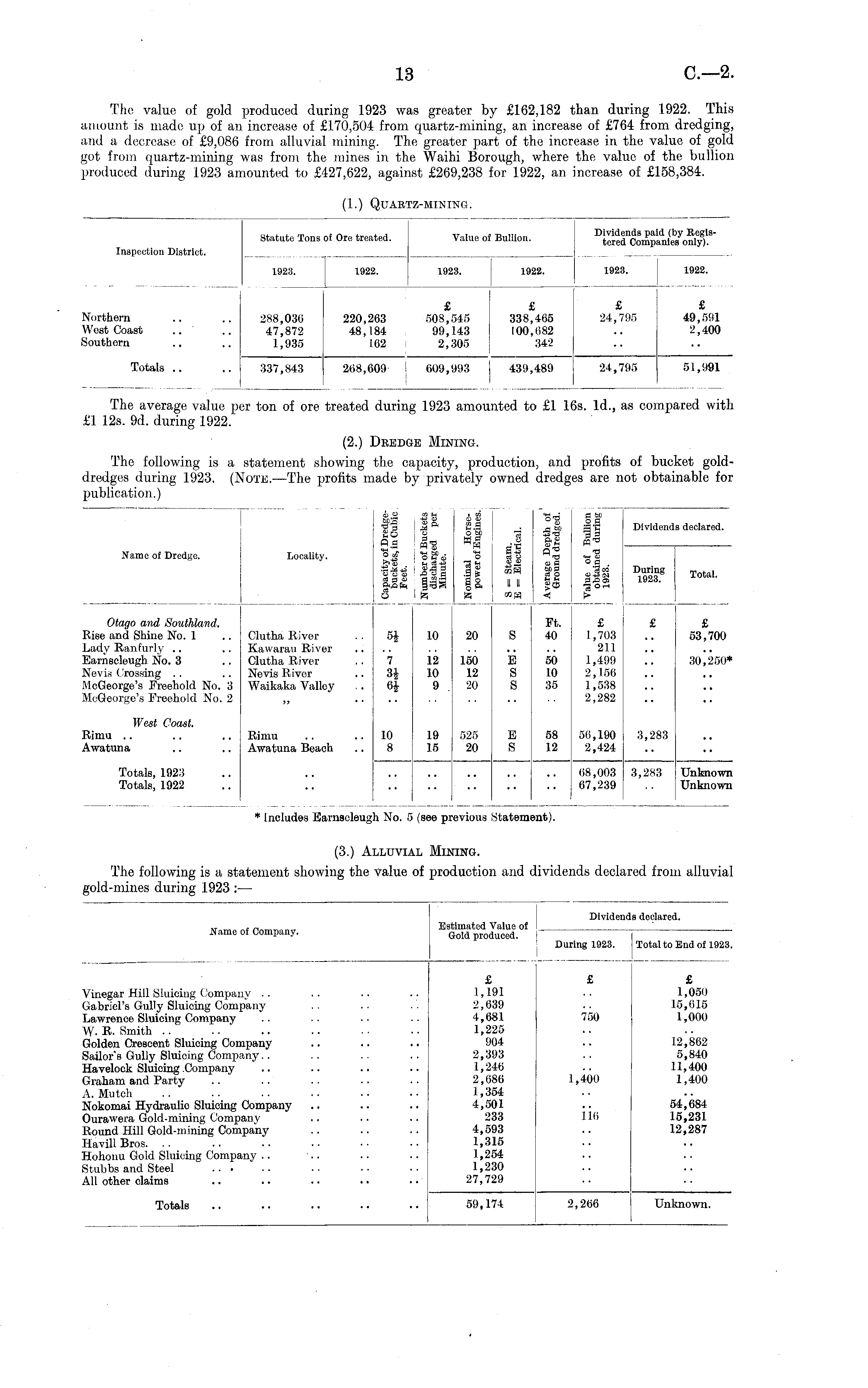 (3.) Alluvial Mining. The following is a statement showing the value of production and dividends declared from alluvial gold-mines during 1923 : —
