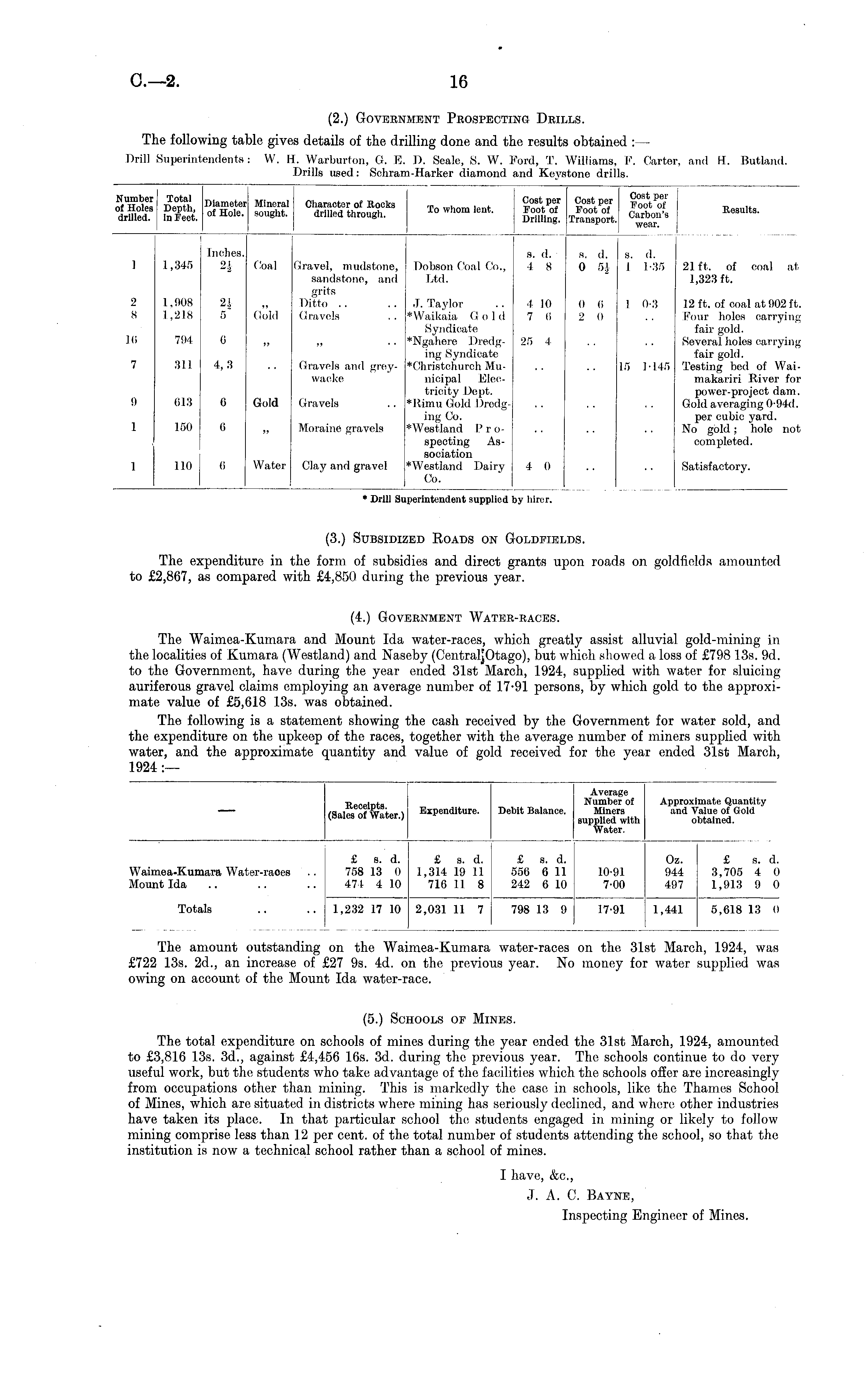 (2.) Government Prospecting Drills. The following table gives details of the drilling done and the results obtained :— Drill Superintendents: VV. H. Warburlon, G. E. D. Scale, S. W. Ford, T. Williams, I'\ Carter, and H. Butland. Drills used: Schram-Harker diamond and Keystone drills.