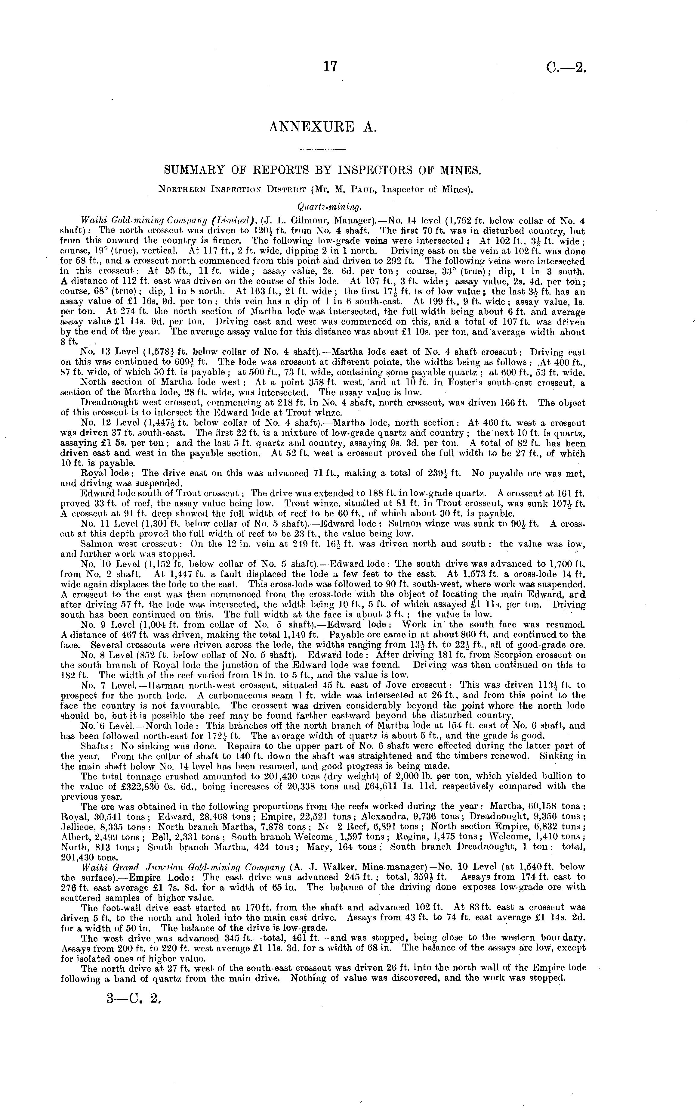 ANNEXURE A. SUMMARY OF REPORTS BY INSPECTORS OF MINES. Northern Inspection District (Mr. M. Paui.,, Inspector of Mines). Quart?-mining. Waihi Gold-mining Company (limited), (J. L. Gilmour, Manager).—No. 14 level (1,752 ft. below collar of No. 4 shaft): The north crosscut was driven to 120J ft. from No. 4 shaft. The first 70 ft. was in disturbed country, but from this onward the country is firmer. The following low-grade veins were intersected: At 102 ft., 31 ft. wide; course, 19° (true), vertical. At 117 ft., 2 ft. wide, dipping 2in 1 north. Driving east on the vein at 102 ft. was done for 58 ft., and a crosscut north commenced from this point and driven to 292 ft. The following veins wore intersected in this crosscut: At 55ft., lift, wide; assay value, 2s. 6d. per ton; course, 33° (true); dip, 1 in 3 south. A distance of 112 ft. east was driven on the course of this lode. At 107 ft., 3 ft. wide ; assay value, 2s. 4d. per ton; course, 68° (true); dip, lin 8 north. At 163 ft., 21 ft. wide; the first 171 ft. is of low value; the last 3J ft. has an assay value of £1 16s. 9d. por ton: this vein has a dip of lin 6 south-east. At 199 ft., 9 ft. wide ; assay value, Is. per ton. At 274 ft. the north section of Martha lode was intersected, the full width being about 6 ft. and average assay value £1 14s. 9d. per ton. Driving east and west was commenced on this, and a total of 107 ft. was driven by the end of the year. The average assay value for this distance was about £1 10s. per ton, and average width about 8 ft. ."'. No. 13 Level (1,5781 ft. below collar of No. 4 shaft). —Martha lode east of No. 4 shaft crosscut: Driving east on this was continued to 0091 ft. The lode was crosscut at different points, tho widths being as follows ; .At 400 ft., 87 ft. wide, of which 50 ft. is payable ■ at 500 ft., 73 ft. wide, containing some payable quartz ; at 600 ft., 53 ft. wide. North section of Martha lode west: At a point 358 ft. west, and at 10 ft. in Foster's southeast crosscut, a section of the Martha lode, 28 ft. wide, was intersected. The assay value is low. Dreadnought west crosscut, commencing at 218 ft. in No. 4 shaft, north crosscut, was driven 166 ft. The object of this crosscut is to intersect the Edward lode at Trout winze. No. 12 Level (1,447 1 ft. below collar of No. 4 shaft). —Martha lode, north section: At 460 ft. west a crosscut was driven 37 ft. south-east. The first 22 ft. is a mixture of low-grade quart/, and country ; the next 10 ft. is quartz, assaying £1 ss. per ton ; and the last 5 ft. quartz and country, assaying 9s. 3d. per ton. A total of 82 ft. has been driven east and west in the payable section. At 52 ft. west a crosscut proved the full width to be 27 ft., of which 10 ft. is payable. Royal lode : The drive east on this was advanced 71 ft., making a total of 239J ft. No payable ore was met, and driving was suspended. Edward lode south of Trout crosscut: The drive was extended to 188 ft. in low-grade quartz. A crosscut at 161 ft. proved 33 ft. of reef, the assay value being low. Trout winze, situated at 81 ft. in Trout crosscut, was sunk 1071 ft. A crosscut at 91 ft. deep showed the full width of reef to be 60 ft., of which about 30 ft. is payable. No. 11 Level (1,301 ft. below collar of No. 5 shaft). —Edward lode : Salmon winze was sunk to 90J ft. A crosscut at this depth proved the full width of reef to be 23 ft., the value being low. Salmon west crosscut: On the 12 in. vein at 249 ft. 165 ft. was driven north and south : the value was low, and further work was stopped. No. 10 Level (1,152 ft. below collar of No. 5 shaft).—-Edward lode : The south drive was advanced to 1,700 ft. from No. 2 shaft. At 1,447 ft. a fault displaced the lode a few feet to the east. At 1,573 ft. a cross-lode 14 ft. wide again displaces the lode to the east. This cross-lode was followed to 90 ft. south-west, where work was suspended. A crosscut to the east was then commenced from the cross-lode with the object of locating the main Edward, ar.d after driving 57 ft. the lode was intersected, the width being 10 ft., 5 ft. of which assayed £1 lis. per ton. Driving south has been continued on this. The full width at the face is about 3 ft. ; the value is low. No. 9 Level (1,004 ft. from collar of No. 5 shaft). —Edward lode: Work in the south face was resumed. A distance of 467 ft. was driven, making the total 1,149 ft. Payable ore came in at about 860 ft. and continued to the face. Several crosscuts were driven a.cross the lode, the widths ranging from 131 ft. to 221 ft., all of good-grade ore. No. 8 Level (852 ft. below collar of No. 5 shaft). —Edward lode : After driving 181 ft. from Scorpion crosscut on the south branch of Royal lode the junction of tho Edward lode was found. Driving was then continued on this to 182 ft. The width of the reef varied from 18 in. to 5 ft., and the value is low. No. 7 Level. —Harman north-west crosscut, situated 45 ft. east of Jove crosscut: This was driven 1133-ft. to prospect for the north lode. A carbonaceous seam I ft. wide was intersected at 26 ft., and from this point to the face the country is not favourable. The crosscut was driven considerably beyond the point where the north lode should be, but it is possible the reef may be found farther eastward beyond the disturbed country. No. 6 Level.—North lode : This branches off the north branch of Martha lode at 154 ft. east of No. 6 shaft, and has been followed north-east for 1721 ft. The average width of quartz is about 5 ft., and the grade is good. Shafts :No sinking was done. Repairs to the upper part of No. 6 shaft were effected during the latter part of the year. From the collar of shaft to 140 ft. down the shaft was straightened and the timbers renewed. Sinking in the main shaft below No. 14 level has been resumed, and good progress is being made. The total tonnage crushed amounted to 201,430 tons (dry weight) of 2,000 lb. per ton, which yielded bullion to the value of £322,830 os. (i