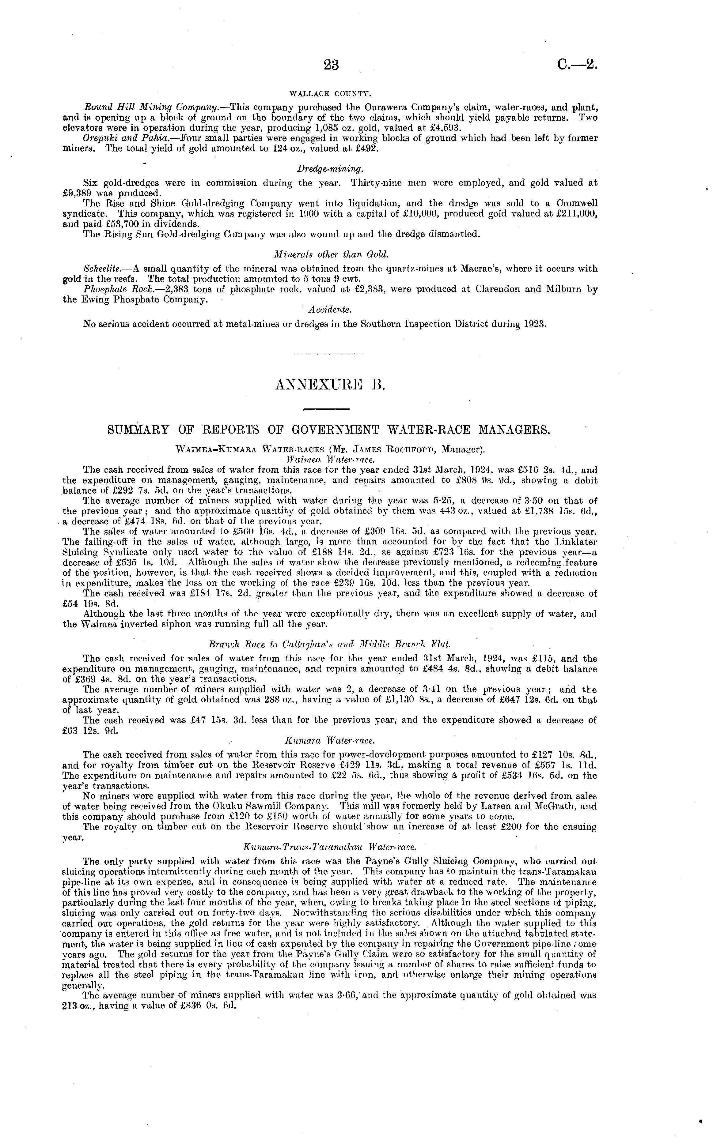 WALLACE COUNTY. Round Hill Mining Company. —This company purchased the Ourawera Company's claim, water-races, and plant, and is opening up a block of ground on the boundary of the two claims, which should yield payable returns. Two elevators were in operation during the year, producing 1,085 oz. gold, valued at £4,593. Orepuki and Pahia. —Four small parties were engaged in working blocks of ground which had been left by former miners. The total yield of gold amounted to 124 oz., valued at £492. Dredge-mining. Six gold-dredges were in commission during the year. Thirty-nine men were employed, and gold valued at £9,389 was produced. The Rise and Shine Gold-dredging Company went into liquidation, and the dredge was sold to a Cromwell syndicate. This company, which was registered in 1900 with a capital of £10,000, produced gold valued at £211,000, and paid £53,700 in dividends. The Rising Sun Gold-dredging Company was also wound up and the dredge dismantled. Minerals other than, Gold. Scheelite. —A small quantity of the mineral was obtained from the quartz-mines at Macrae's, where it occurs with gold in the reefs. The total production amounted to 5 tons 9 cwt. Phosphate Rock. —2,383 tons of phosphate rock, valued at £2,383, were produced at Clarendon and Milburn by the Ewing Phosphate Company. Accidents. No serious accident occurred at metal-mines or dredges in the Southern Inspection District during 1923.