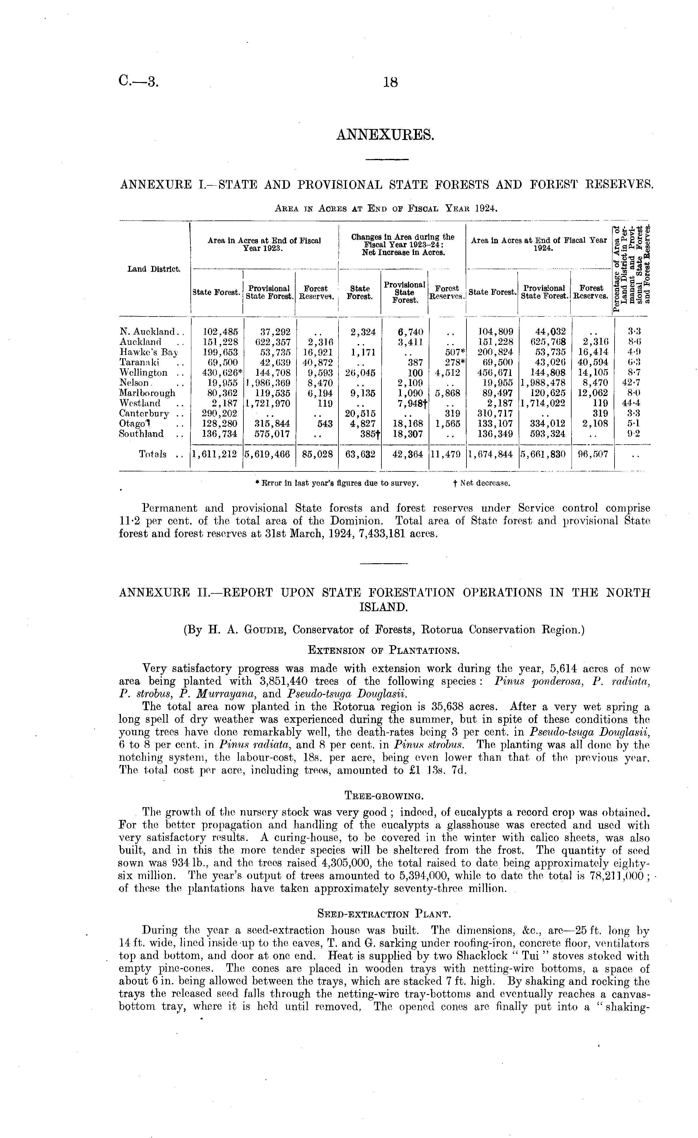 Permanent and provisional State forests and forest reserves under Service control comprise, 11-2 per cent, of the total area of the Dominion. Total area of State forest and provisional State forest and forest reserves at 31st March, 1924, 7,433,181 acres. ANNEXURE II.—REPORT UPON STATE FORESTATION OPERATIONS IN THE NORTH ISLAND. (By H. A. Goutjie, Conservator of Forests, Rotorua Conservation Region.) Extension of Plantations. Very satisfactory progress was made with extension work during the year, 5,614 acres of new area being planted with 3,851,440 trees of the following species : Pinus ponderosa, P. radiata, P. strobus, P. Murrayana, and Pseudo-tsuga Douglasii. The total area now planted in the Rotorua region is 35,638 acres. After a very wet spring a long spell of dry weather was experienced during the summer, but in spite of these conditions the young trees have done remarkably well, the death-rates being 3 per cent, in Pseudo-tsuga Douglasii, 6to 8 per cent, in Pinus radiata, and 8 per cent, in Pinus strobus. The planting was all done by the notching system, the labour-cost, 18s. per acre, being even lower than that of the previous year. The total cost per acre, including trees, amounted to £1 13s. 7d. Tree-growing . The, growth of the nursery stock was very good ; indeed, of eucalypts a record crop was obtained. For the better propagation and handling of the eucalypts a glasshouse was erected and used with very satisfactory results. A curing-house, to be covered in the, winter with calico sheets, was also built, and in this the more tender species will be sheltered from the frost. The quantity of seed sown was 934 lb., and the trees raised 4,305,000, the, total raised to date being approximately eightysix million. The year's output of trees amounted to 5,394,000, while to date, the total is 78,211,000 ; of these the plantations have, taken approximately seventy-three million. Seed-extraction Plant. During the year a seed-extraction house was built. The dimensions, &c, are—2s ft. long by 14 ft. wide, lined inside-up to the eaves, T. and G. sarking under roofing-iron, concrete floor, ventilators top and bottom, and door at one end. Heat is supplied by two Shacklock " Tui " stoves stoked with empty pine-cones. The cones are placed in wooden trays with netting-wire bottoms, a space of about 6 in. being allowed between the trays, which are stacked 7 ft. high. By shaking and rocking the trays the released seed falls through the netting-wire tray-bottoms and eventually reaches a canvasbottom tray, where it is hold until removed, The opened cones are, finally put into a " shaking-