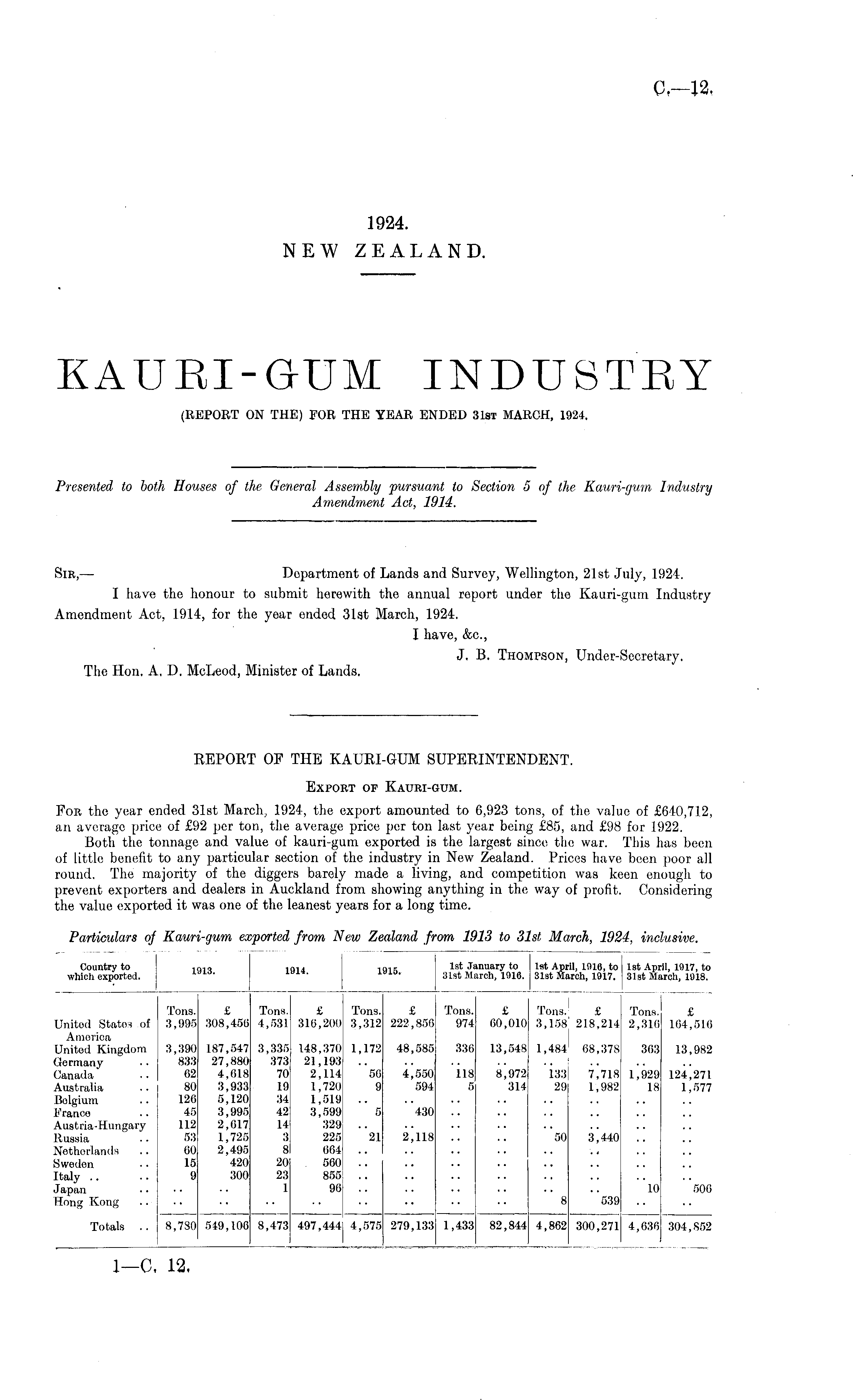 Sir, — Department of Lands and Survey, Wellington, 21st July, 1924. I have the honour to submit herewith the annual report under the Kauri-gum Industry Amendment Act, 1914, for the year ended 31st March, 1924. I have, &c, J. B. Thompson, Under-Secretary. The Hon. A. D. McLeod, Minister of Lands.