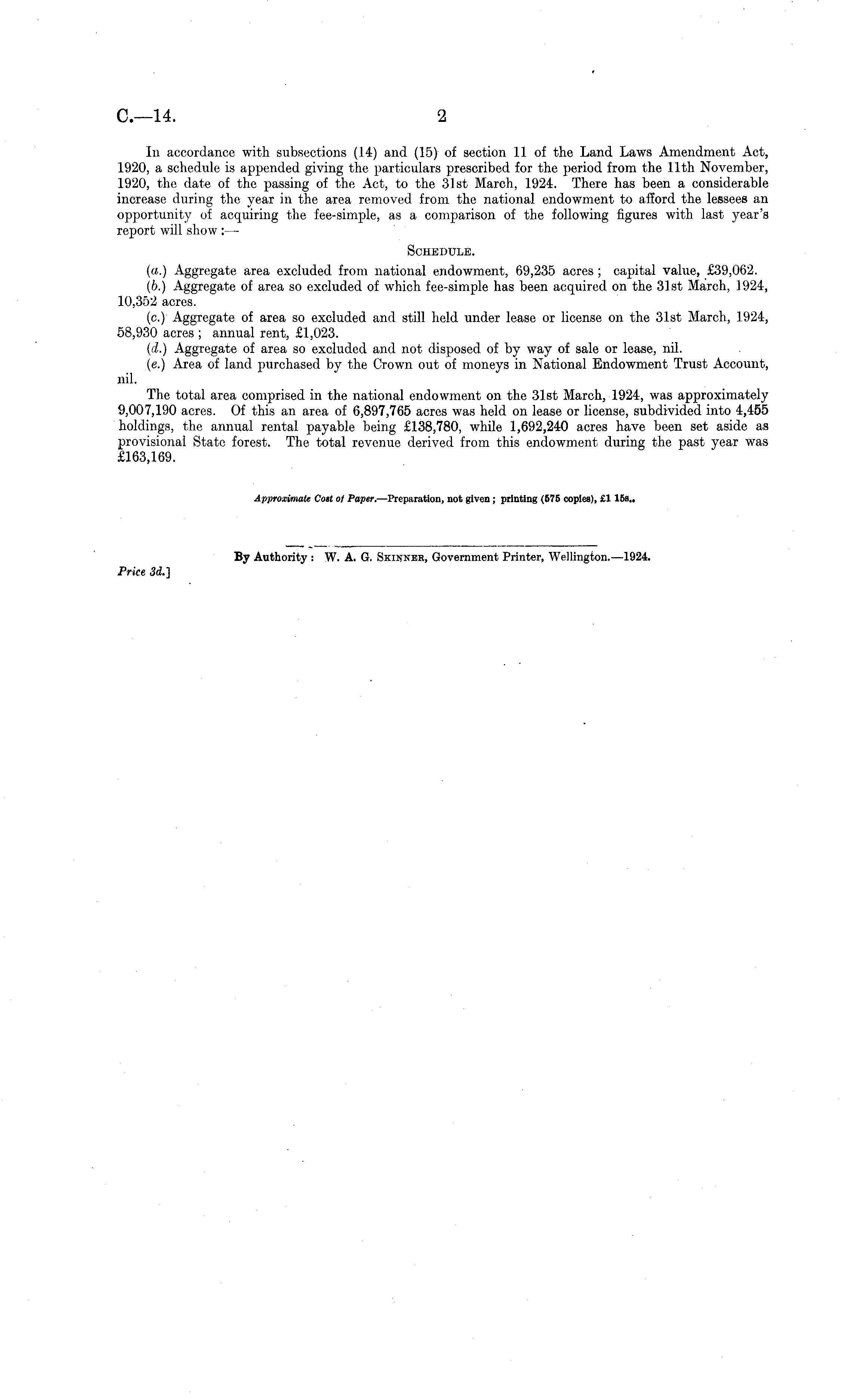 In accordance with subsections (14) and (15) of section 11 of the Land Laws Amendment Act, 1920, a schedule is appended giving the particulars prescribed for the period from the 11th November, 1920, the date of the passing of the Act, to the 31st March, 1924. There has been a considerable increase during the year in the area removed from the national endowment to afford the lessees an opportunity of acquiring the fee-simple, as a comparison of the following figures with last year's report will show : — Schedule. (a.) Aggregate area excluded from national endowment, 69,235 acres ; capital value, £39,062. (b.) Aggregate of area so excluded of which fee-simple has been acquired on the 31st March, .1924, 10,352 acres. (c.) Aggregate of area so excluded and still held under lease or license on the 31st March, 1924, 58,930 acres ; annual rent, £1,023. (d.) Aggregate of area so excluded and not disposed of by way of sale or lease, nil. (c.) Area of land purchased by the Crown out of moneys in National Endowment Trust Account, nil. The total area comprised in the national endowment on the 31st March, 1924, was approximately 9,007,190 acres. Of this an area of 6,897,765 acres was held on lease or license, subdivided into 4,455 holdings, the annual rental payable being £138,780, while 1,692,240 acres have been set aside as provisional State forest. The total revenue derived from this endowment during the past year was £163,169.