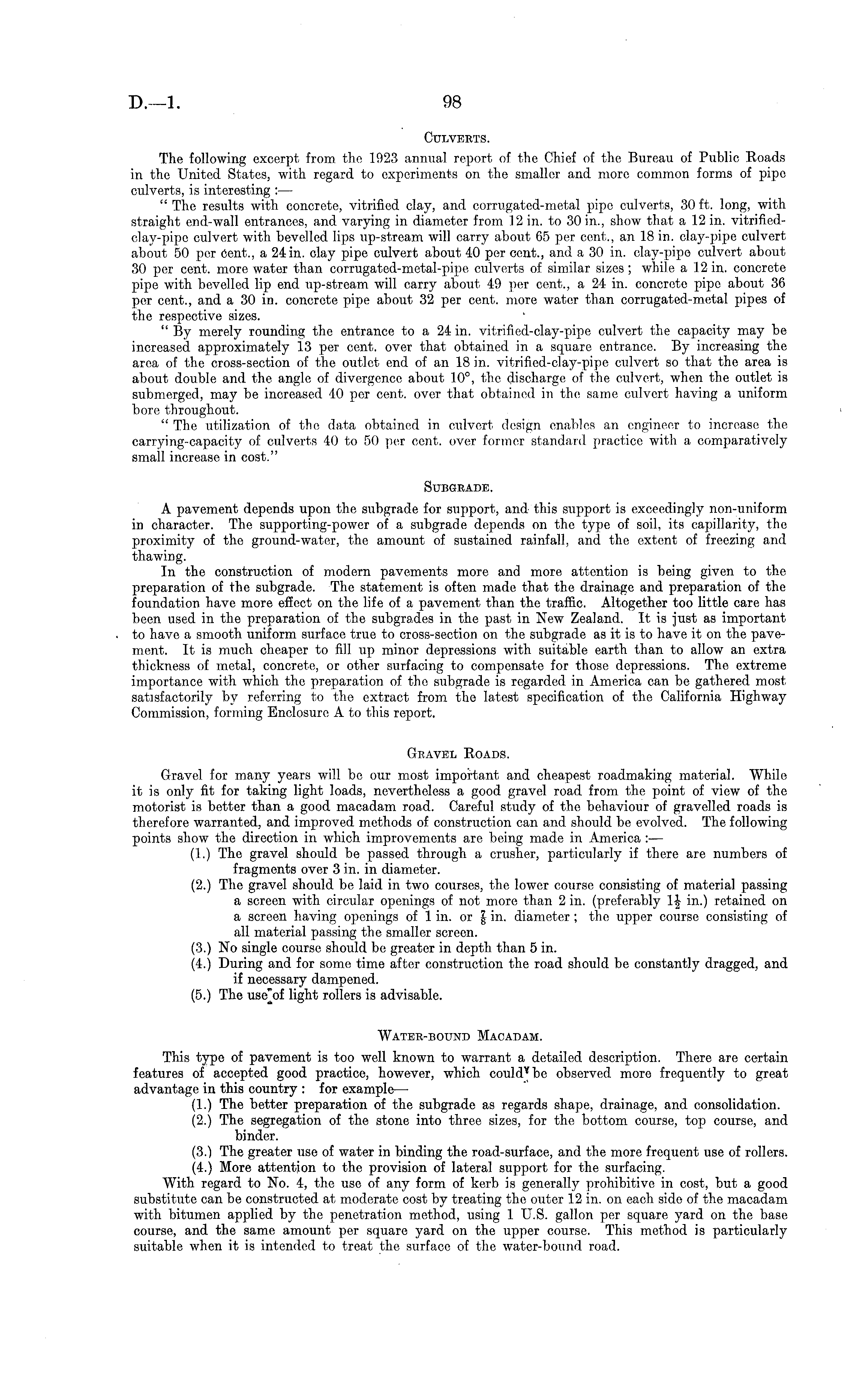 Culverts. The following excerpt from the 1923 annual report of the Chief of the Bureau of Public Roads in the United States, with regard to experiments on the smaller and more common forms of pipe culverts, is interesting : — "The results with concrete, vitrified clay, and corrugated-metal pipe culverts, 30ft. long, with straight end-wall entrances, and varying in diameter from 12 in. to 30 in., show that a 12 in. vitrified-clay-pipe culvert with bevelled lips up-stream will carry about 65 per cent., an 18 in. clay-pipe culvert about 50 per cent., a 24in. clay pipe culvert about 40 per cent., and a3O in. clay-pipe culvert about 30 per cent, more water than corrugated-metal-pipe culverts of similar sizes; while a 12 in. concrete pipe with bevelled lip end up-stream will carry about 49 per cent., a 24 in. concrete pipe about 36 per cent., and a 30 in. concrete pipe about 32 per cent, more water than corrugated-metal pipes of the respective sizes. " By merely rounding the entrance to a 24 in. vitrified-clay-pipe culvert the capacity may be increased approximately 13 per cent, over that obtained in a square entrance. By increasing the area of the cross-section of the outlet end of an 18 in. vitrified-clay-pipe culvert so that the area is about double and the angle of divergence about 10°, the discharge of the culvert, when the outlet is submerged, may be increased 40 per cent, over that obtained in the same culvert having a uniform bore throughout. " The utilization of tho data obtained in culvert design enables an engineer to increase the carrying-capacity of culverts 40 to 50 per cent, over former standard practice with a comparatively small increase in cost." Subgrade. A pavement depends upon the subgrade for support, and this support is exceedingly non-uniform in character. The supporting-power of a subgrade depends on tho type of soil, its capillarity, the proximity of tho ground-water, the amount of sustained rainfall, and the extent of freezing and thawing. In the construction of modern pavements more and more attention is being given to the preparation of the subgrade. The statement is often made that the drainage and preparation of the foundation have more effect on the life of a pavement than the traffic. Altogether too little care has been used in the preparation of the subgrades in the past in New Zealand. It is just as important to have a smooth uniform surface true to cross-section on tho subgrade as it is to have it on the pavement. It is much cheaper to fill, up minor depressions with suitable earth than to allow an extra thickness of metal, concrete, or other surfacing to compensate for those depressions. The extreme importance with which the preparation of tho subgrade is regarded in America can be gathered most satisfactorily by referring to tho extract from the latest specification of the California Highway Commission, forming Enclosure A to this report. Gravel Roads. Gravel for many years will bo our most important and cheapest roadmaking material. While it is only fit for taking light loads, nevertheless a good gravel road from the point of view of the motorist is better than a good macadam road. Careful study of tho behaviour of gravelled roads is therefore warranted, and improved methods of construction can and should be evolved. The following points show tho direction in which improvements are being made in America : — (1.) The gravel should bo passed through a crusher, particularly if there are numbers of fragments over 3 in. in diameter. (2.) The gravel should be laid in two courses, the lower course consisting of material passing a screen with circular openings of not more than 2 in. (preferably If in.) retained on a screen having openings of 1 in. or | in. diameter ; the upper course consisting of all material passing the smaller screen. (3.) No single course should be greater in depth than 5 in. (4.) During and for some time after construction the road should be constantly dragged, and if necessary dampened. (5.) The use*"of light rollers is advisable. Water-bound Macadam. This type of pavement is too well known to warrant a detailed description. There are certain features of accepted good practice, however, which could Y be observed moro frequently to great advantage in this country : for example— (1.) The better preparation of the subgrade as regards shape, drainage, and consolidation. (2.) The segregation of the stone into three sizes, for the bottom course, top course, and binder. (3.) The greater use of water in binding the road-surface, and the more frequent use of rollers. (4.) More attention to the provision of lateral support for the surfacing. With regard to No. 4, the use of any form of kerb is generally prohibitive in cost, but a good substitute can be constructed at moderate cost by treating the outer 12 in. on each side of the macadam with bitumen applied by the penetration method, using 1 U.S. gallon per square yard on the base course, and the same amount per square yard on the upper course. This method is particularly suitable when it is intended to treat the surface of the water-bound road.