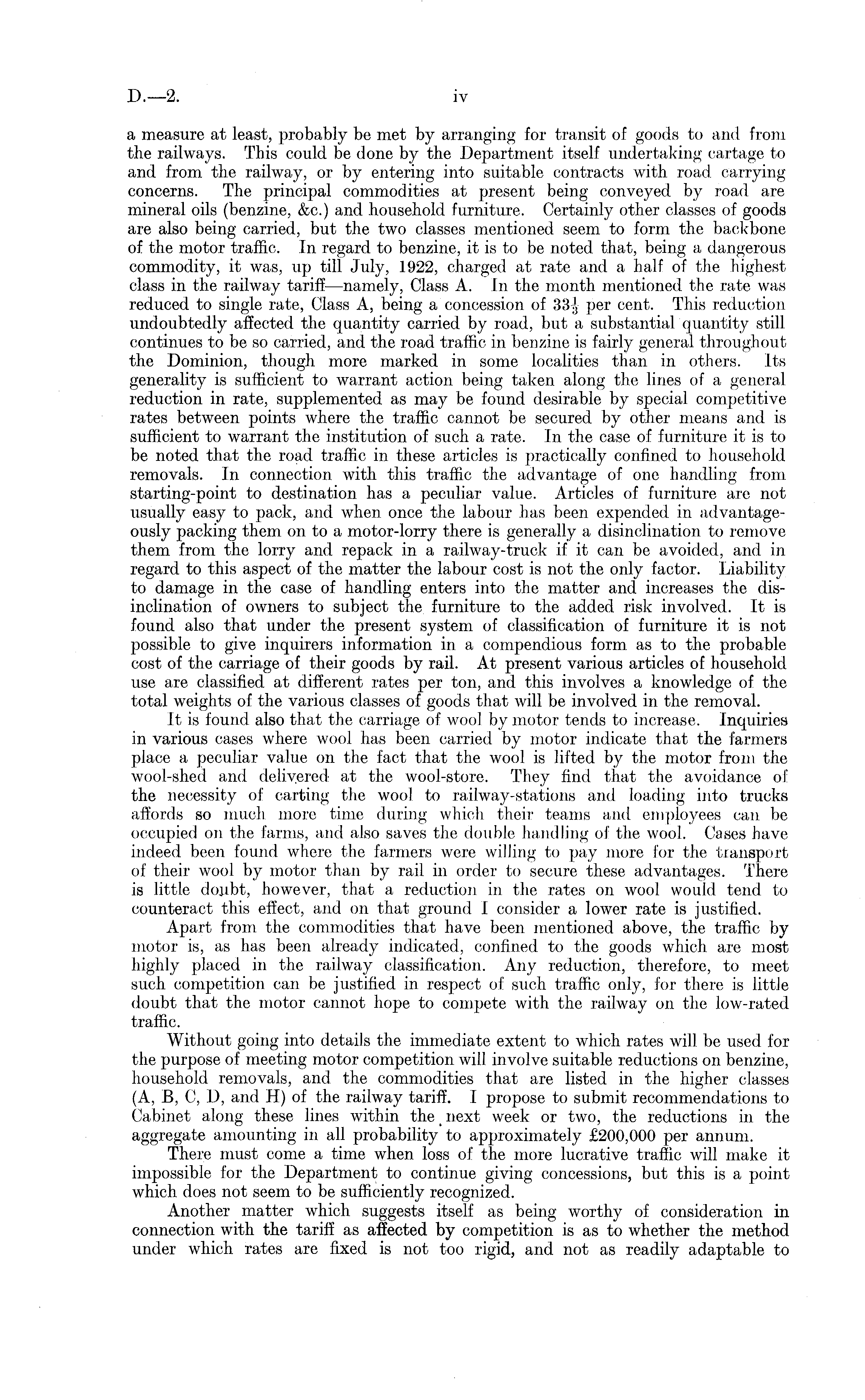 a measure at least, probably be met by arranging for transit of goods to and from the railways. This could be done by the Department itself undertaking cartage to and from the railway, or by entering into suitable contracts with road carrying concerns. The principal commodities at present being conveyed by road are mineral oils (benzine, &c.) and household furniture. Certainly other classes of goods are also being carried, but the two classes mentioned seem to form the backbone of the motor traffic. In regard to benzine, it is to be noted that, being a dangerous commodity, it was, up till July, 1922, charged at rate and a half of the highest class in the railway tariff—namely, Class A. In the month mentioned the rate was reduced to single rate, Class A, being a concession of per cent. This reduction undoubtedly affected the quantity carried by road, but a substantial quantity still continues to be so carried, and the road traffic in benzine is fairly general throughout the Dominion, though more marked in some localities than in others. Its generality is sufficient to warrant action being taken along the lines of a general reduction in rate, supplemented as may be found desirable by special competitive rates between points where the traffic cannot be secured by other means and is sufficient to warrant the institution of such a rate. In the case of furniture it is to be noted that the road traffic in these articles is practically confined to household removals. In connection with this traffic the advantage of one handling from starting-point to destination has a peculiar value. Articles of furniture are not usually easy to pack, and when once the labour has been expended in advantageously packing them on to a motor-lorry there is generally a disinclination to remove them from the lorry and repack in a railway-truck if it can be avoided, and in regard to this aspect of the matter the labour cost is not the only factor. Liability to damage in the case of handling enters into the matter and increases the disinclination of owners to subject the furniture to the added risk involved. It is found also that under the present system of classification of furniture it is not possible to give inquirers information in a compendious form as to the probable cost of the carriage of their goods by rail. At present various articles of household use are classified at different rates per ton, and this involves a knowledge of the total weights of the various classes of goods that will be involved in the removal. It is found also that the carriage of wool by motor tends to increase. Inquiries in various cases where wool has been carried by motor indicate that the farmers place a peculiar value on the fact that the wool is lifted by the motor from the wool-shed and delivered at the wool-store. They find that the avoidance ol' the necessity of carting the wool to railway-stations and loading into trucks affords so much more time during which, their teams and employees can be occupied on the farms, and also saves the double handling of the wool. Cases have indeed been found where the farmers were willing to pay more for the transport of their wool by motor than by rail in order to secure these advantages. There is little doubt, however, that a reduction in the rates on wool would tend to counteract this effect, and on that ground I consider a lower rate is justified. Apart from the commodities that have been mentioned above, the traffic by motor is, as has been already indicated, confined to the goods which are most highly placed in the railway classification. Any reduction, therefore, to meet such competition can be justified in respect of such traffic only, for there is little doubt that the motor cannot hope to compete with the railway on the low-rated traffic. Without going into details the immediate extent to which rates will be used for the purpose of meeting motor competition will involve suitable reductions on benzine, household removals, and the commodities that are listed in the higher classes (A, B, C, D, and H) of the railway tariff. I propose to submit recommendations to Cabinet along these lines within the t next week or two, the reductions in the aggregate amounting in all probability to approximately £200,000 per annum. There must come a time when loss of the more lucrative traffic will make it impossible for the Department to continue giving concessions, but this is a point which does not seem to be sufficiently recognized. Another matter which suggests itself as being worthy of consideration in connection with the tariff as affected by competition is as to whether the method under which rates are fixed is not too rigid, and not as readily adaptable to