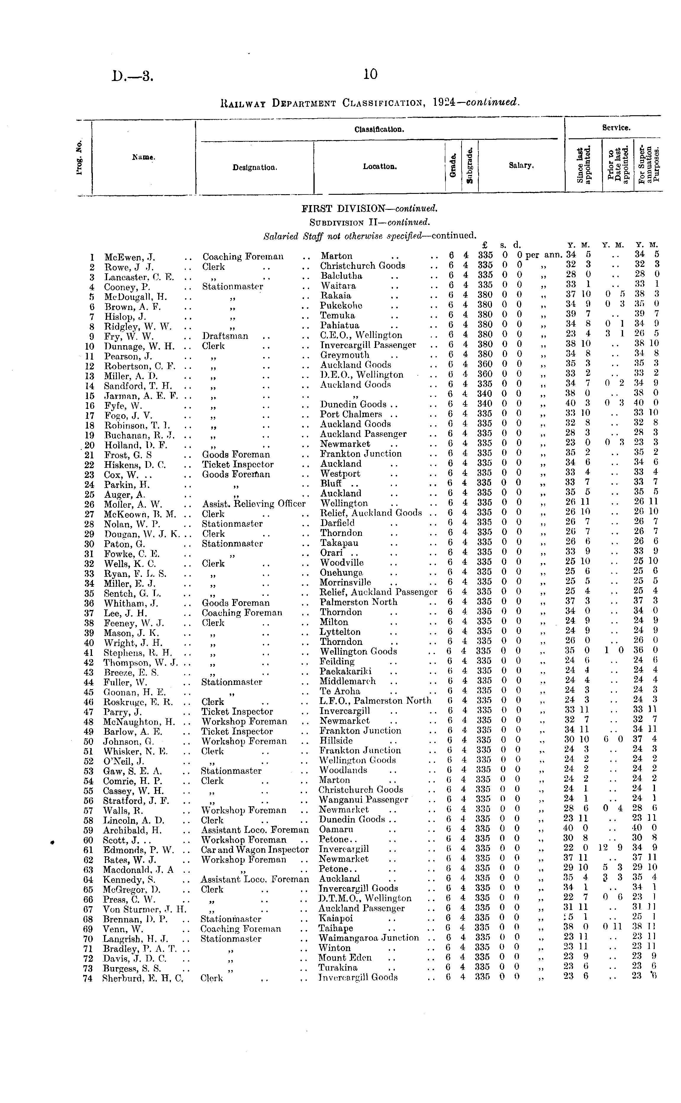 Classification. Service. 6 Location. 4 ■a 2 I * n Salary. S Nrtlllfc. Designation. I| 80 q a Issii lit fffi FIRST DIVISION— continued. Subdivision IT— continued. 1 McEwen, J. 2 Rowp, J J. 3 Lancaster. 0. K. 4 Cooney, I , . r> Mi'Dougall, H. 0 Brown, A. W. 7 Hislop, J. 8 Ridgley, W. W. .. 9 l<>y, W. W. 10 Dunnage, W. H. .. 11 Pearson, J. 12 Robertson, C. F, .. 13 Miller, A. l>. 14 Sandford, T. H. .. 15 Jarmon, A. E. F. .. 10 Fyfe, \V. 17 Fogo, J. V. 18 Robinson, T, L 10 Buchanan, R. J. . . .20 Holland, 1). P. 21 Frost, 0. S 22 Hiskens, I). C, 23 Cox, W. .. 24 Parkin, H. 25 Auger, A. 26 Moller, A. W. 27 MeKeown, li. M. .. 28 Nolan, W. P. 29 Dougan, \V. J. K. .. 30 Paton, Q. 31 Fowke, 0. E. 32 Wells, K. C. 33 Ryan, F. L. S. 34 Miller, E, J. 35 Sentch, G. L. 36 Whitham, J. 37 Lee, J. H. 38 Feency, VV. J. 39 Mason, J. EC. 40 Wright. J. H. 41 Stephens, R. 11. 42 Thompson, W. J. . . 43 Breeze, E. S. 44 Fuller, W. 45 Goon an, IT. E. 40 Roskruge, E. R. 47 Parry, J. 48 MoNaughton, H. .. 49 Barlow, A. E. 50 Johnson, (i. 51 Whisker, N. E. .. 52 O'Neil, J. 53 Gaw, 8. E. A. 54 Comrie, H. P. 55 Cassey, W. H. 50 Stratford, J. F. .. 57 Walls, l<. 58 Lincoln, A. 1). 59 Archibald, II. lid Scott, J. .. 01 Edmonds, P. W. .. 02 Bates, W. J. (i.'i Maedonald, J. A 04 Kennedy, S. 05 McGregor, I >. 06 Press, 0. VV. 07 Von Stunner, .">. II. 08 Brennan, 1). P. 69 Venn, W. 70 Langrish, 11. .T. .. 71 Bradley, P. A. T. . . 72 Davis, J. I). C. 73 Burgess, S. S. 74 Sherburd, E. IT, C, Salaried Staff not otherwise specified —continued. £ s. d. Y. M. Coaching Foreman .. Marton .. .. 6 4 335 0 0 per ann. 34 5 Clerk .. .. Christchurch Goods .. 6 4 335 0 0 „ 32 3 .. Balclutha .. .. 6 4 335 0 0 „ 28 0 Stationmaster .. Waitaia .. ..04 335 0 0 „ 33 1 „ .. Rakaia .. ..0 4 380 0 0 „ 37 10 .. Pukekoho .. 0 4 380 0 0 „ 34 9 .. Temuka .. .. 0 4 380 0 0 „ 39 7 .. Pahiatua .. .. 6 4 380 0 0 „ 34 8 Draftsman .. .. C.E.O., Wellington ..0 4 380 0 0 „ 23 4 Clerk .. .. Tnvercargill Passenger .. 0 4 380 0 0 „ 38 10 .. Greymouth .. ..0 4 380 0 0 „ 34 8 .. Auckland Goods .. 0 4 300 0 0 „ 35 3 .. D.E.O., Wellington ..0 4 360 0 0 ,, 33 2 .. Auckland Goods ..04 335 0 0 „ 34 7 .. 0 4 340 0 0 38 0 " .. .. Ounedin Goods .. .. 6 4 340 0 0 „ 40 3 .. Port Chalmers .. ..0 4 335 0 0 „ 33 10 .. Auckland Goods ..0 4 335 0 0 ., 32 8 .. Auckland Passenger ..04 335 0 0 „ 28 3 .. Newmarket .. ..0 4 335 0 0 „ 23 0 Goods Foreman .. Frankton Junction .. 6 4 335 0 0 ,, 35 ! Ticket Inspector .. Auckland .. ..04 335 0 0 „ 34 0 Goods Foreman .. Westport .. ..04 335 00 „ 33 4 .. Bluff .. .. .. 6 4 335 0 0 „ 33 7 .. Auckland .. ..6 4 335 0 0 „ 35 5 Assist. Relieving Officer Wellington .. ..0 4 335 0 0 „ 20 11 Clerk .. .. Relief, Auckland Goods ..04 335 0 0 „ 26 10 Stationmaster .. Darfield .. ..0 4 335 0 0 „ 20 7 Clerk .. .. Thorndon .. .. 0 4 335 0 0 „ 20 7 Stationmaster .. Takapau .. .. 6 4 335 0 0 „ 20 ti .. Orari .. .. . . 6 4 335 0 0 ,, 33 i> Clerk .. .. Woodville .. .. 6 4 335 0 0 „ 25 10 .. Onehuim:' .. .. 0 4 335 0 0 ,, 25 0 .. Morrinsville .. .. 0 4 335 0 0 „ 25 5 .. Relief, Auckland Passenger 0 4 335 0 0 ,, 25 4 Goods Foreman .. Palmerston North .. 0 4 335 0 0 ,, Coaching Foreman .. Thorndon .. ..64 335 0 0 ,. 34 0 Clerk .. .. Milton .. .. 6 4 335 0 0 „ 24 9 .. Lyttelton . . .. 0 4 335 0 0 „ 24 9 .. Thorndon .. ..64 335 00 „ 20 (I .. Wellington Goods ..04 335 0 0 ,. 35 0 .. Feilding .. ..04 335 00 .. 24 li „ .. .. Paekakariki .. ..0 4 335 0 0 „ 24 4 Stationmaster .. Middlemarch .. ..64 335 00 ,, 24 4 .. TeAroha .. ..0 4 335 0 0 ,. 24 3 Clerk .. .. L.F.O., Palmerston North 0 4 335 0 0 „ 24 3 Ticket Inspector .. Invercargill .. ..6 4 335 0 0 ,, 33 II Workshop Foreman .. Newmarket .. ..04 335 00 ,, Ticket Inspector .. Frankton Junction .. 6 4 335 0 0 ,. 34 11 Workshop Foreman .. Hillside .. .. 0 4 335 0 0 „ 30 10 Clerk .. .. Frankton Junction .. 0 4 335 0 0 „ 24 3 .. Wellington Goods .. 0 4 335 0 0 ,, 24 2 Stationmaster .. Woodlands .. ..64 335 0 0 „ 24 2 Clerk .. .. Marton .. .. 0 4 335 0 0 „ 24 2 .. Christchurch Goods .. 6 4 335 0 0 „ 24 1 .. Wanganui Passenger . . 6 4 335 0 0 ,. 24 1 Workshop Foreman .. Newmarket .. ..0 4 335 0 0 ,, 28 6 Clerk .. .. Dunedin Goods .. . . 6 4 335 0 0 „ 23 ] 1 Assistant Loco. Foreman Oamaru .. ..04 335 00 ,, 40 0 Workshop Foreman .. Petone.. .. ..0 4 335 0 0 „ 30 8 Car and Wagon Inspector Invercargill .. ..0 4 335 0 0 „ 22 0 Workshop Foreman .. Newmarket .. ..0 4 335 0 0 „ 37 11 „ .. Petone.. .. ..6 4 335 0 0 „ 29 10 Assistant Loco. Foreman Auckland .. ..04 335 0 0 ,, 35 4 Clerk .. .. Tnvercargill Goods .. 0 4 335 0 0 „ 34 1 . . D.T.M.O.', Wellington ..04 335 0 0 „ 22 7 .. Auckland Passenger .. 0 4 335 0 0 „ 3111 Stationmaster .. Kaiapoi .. ..0 4 335 0 0 ,, 15 1 Coaching Foreman .. Taihape .. ..04 335 0 0 „ 38 0 Stationmaster .. Waimangaroa Junction .. 0 4 335 0 0 ,. 23 II .. Winton ' .. ..04 335 0 0 ,. 23 1 1 .. Mount Eden .. ..0 4 335 (I 0 ,, 23 !) .. Turaldna .. . . 6 4 335 0 0 ., 23 6 Clerk ,. ,. Invercargill Goods .. 0 4 335 0 0 „ 23 0 Y. M. Y. M. 34 5 .. 32 3 .. 28 0 .. 33 1 0 5 38 3 0 3 35 0 .. 39 7 0 1 34 0 3 1 20 5 38 10 . . 34 8 .. 35 3 .. 33 2 0 2 34 !) . . 38 0 0 3 40 0 33 10 .. 32 8 28 3 0 3 23 3 .. 35 2 .. 34 0 .. 33 4 33 7 .. 35 5 .. 20 11 20 10 20 7 .. 20 7 .. 20 0 .. 33 9 .. 25 10 .. 25 0 25 5 25 4 .. 37 3 34 0 24 9 24 9 26 0 1 0 30 0 24 6 24 4 24 4 .. 24 3 24 3 .. 33 11 .. 32 7 34 11 0 0 37 4 .. 24 3 .. 24 2 24 2 .. 24 2 .. 24 1 .. 24 1 0 4 28 6 .. 23 11 40 0 30 8 12 9 34 9 37 11 5 3 29 10 3 3 35 4 IS I 1 0 0 23 1 31 11 .. 25 1 0 11 38 11 23 11 .. 23 11 23 9 23 6 .. 23 '0