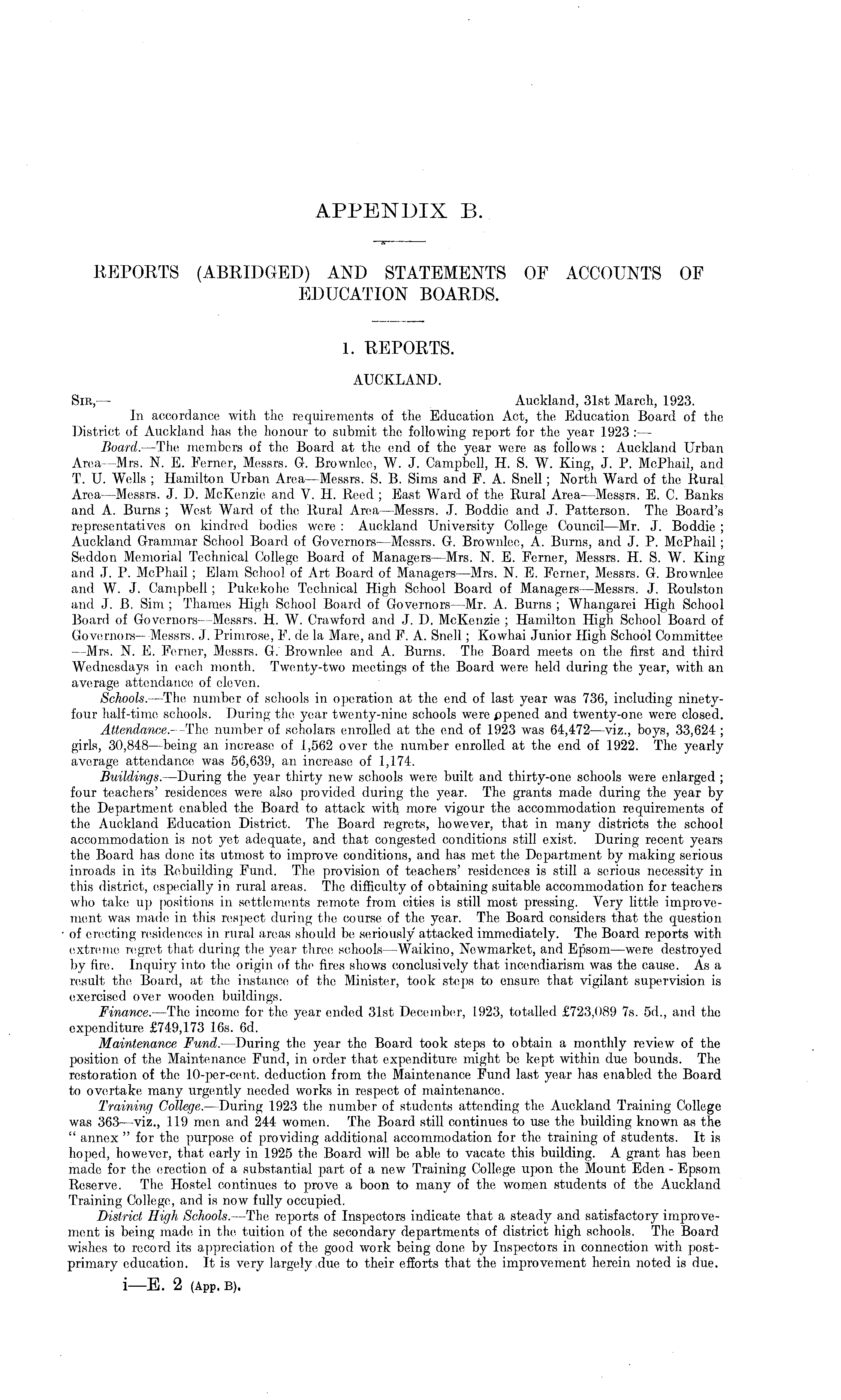 APPENDIX B. —it ' REPORTS (ABRIDGED) AND STATEMENTS OF ACCOUNTS OF EDUCATION BOARDS. 1. REPORTS. AUCKLAND. Sir,— Auckland, 31st March, 1923. In accordance with the requirements of the Education Act, the Education Board of the District of Auckland has the honour to submit tho following report for the year 1923 : — Board. —The members of the Board at tho end of the year were as follows : Auckland Urban Area -Mrs. N. E. Ferner, Messrs. G. Brownleo, W. J. Campbell, H. S. W. King, J. P. McPhail, and T. U. Wells ; Hamilton Urban Area—Messrs. S. B. Sims and F. A. Snell ; North. Ward of the Rural Area—Messrs. J. D. McKenzie and V. H. Reed ; East Ward of the Rural Area—Messrs. E. C. Banks and A. Burns ; West Ward of the Rural Area —Messrs. J. Boddio and J. Patterson. The Board's representatives on kindred bodies were : Auckland University College Council— Mr. J. Boddie ; Auckland Grammar School Board of Governors—Messrs. G. Brownleo, A. Burns, and J. P. McPhail ; Seddon Memorial Technical College Board of Managers —Mrs. N. E. Ferner, Messrs. H. S. W. King and J. P. McPhail; Elam School of Art Board of Managers—Mrs. N. E. Ferner, Messrs. G. Brownlee and W. J. Campbell ; Pukekohe Technical High School Board of Managers—Messrs. J. Roulston and J. B. Sim ; Thames High School Board of Governors —Mr. A. Burns ; Whangarei High School Board of Governors—Messrs. H. W. Crawford and J. D. McKenzie ; Hamilton High School Board of Governors —Messrs. J. Primrose, F. de la Mare, and F. A. Snell; Kowhai Junior High School Committee —Mrs. N. E. Ferner, Messrs. G. Brownlee and A. Burns. The Board meets on the first and third Wednesdays in each month. Twenty-two meetings of the Board were held during the year, with an average attendance of eleven. Schools. —The number of schools in operation at the end of last year was 736, including ninetyfour half-time schools. During the year twenty-nine schools were ppencd and twenty-one were closed. Attendance. —The number of scholars enrolled at the end of 1923 was 64,472 —viz., boys, 33,624 ; girls, 30,848 —being an increase of 1,562 over the number enrolled at the end of 1922. The yearly average attendance was 56,639, an increase of 1,174. Buildings. —During the year thirty new schools were built and thirty-one schools were enlarged ; four teachers' residences were also provided during the year. Tho grants made during the year by the Department enabled the Board to attack with more vigour the accommodation requirements of the Auckland Education District. The Board regrets, however, that in many districts the school accommodation is not yet adequate, and that congested conditions still exist. During recent years the Board has done its utmost to improve conditions, and has met the Department by making serious inroads in its Rebuilding Fund. The provision of teachers' residences is still a serious necessity in this district, especially in rural areas. The difficulty of obtaining suitable accommodation for teachers who take up positions in settlements remote from cities is still most pressing. Very little improvement was made in this respect during the course of the year. The Board considers that the question of erecting residences in rural areas should be seriously attacked immediately. The Board reports with extreme regret that during the year three schools—Waikino, Newmarket, and Epsom —were destroyed by fire. Inquiry into the origin of the fires shows conclusively that incendiarism was the cause. As a result tho Board, at the instance of the Minister, took stops to ensure that vigilant supervision is exercised over wooden buildings. Finance. —The income for the year ended 31st December, 1923, totalled £723,089 7s. 5d., and the expenditure £749,173 16s. 6d. Maintenance Fund. —During the year the Board took steps to obtain a monthly review of the position of the Maintenance Fund, in order that expenditure might be kept within due bounds. The restoration of the 10-per-cent. deduction from the Maintenance Fund last year has enabled the Board to overtake many urgently needed works in respect of maintenance. Training College. —During 1923 the, number of students attending the Auckland Training College was 363 —viz., 119 men and 244 women. The Board still continues to use the building known as the " annex " for the purpose of providing additional accommodation for the training of students. It is hoped, however, that early in 1925 the Board will be able to vacate this building. A grant has been made for the erection of a substantial part of a new Training College upon the Mount Eden - Epsom Reserve. The Hostel continues to prove, a boon to many of the women students of the Auckland Training College, and is now fully occupied. District High Schools. —The reports of Inspectors indicate that a steady and satisfactory improvement is being made in the tuition of the secondary departments of district high schools. The Board wishes to record its appreciation of the good work being done by Inspectors in connection with postprimary education. It is very largely ,due to their efforts that the improvement herein noted is due.