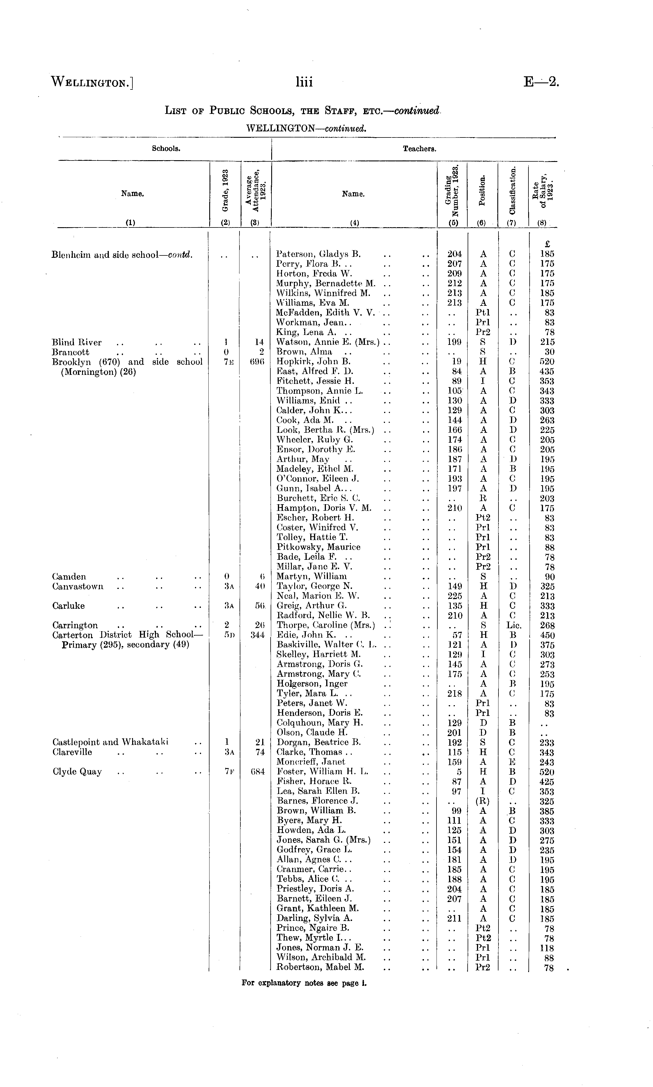 Schools. Teachers. Name. CO Ol Ol to TS 2 o (2) to CO co toed . rt rt CO ■r, TOC-t P flee t* A COrH H*S H (3) Name. CO ol MO» 0"-* ■5 r." tHr& oa 3 to (S) a 5 **8 -"n O Ch a o rt "9 "w tn d 5 (7) S Sco* rt "rt s? tftnS *o (1) U) (f>> (8) Blenheim and side school— eontd. Blinel River Branoott Brooklyn (670) and side school (Mornington) (26) 1 0 7.1! 14 2 690 Paterson, Gladys B. Perry, Flora B. .. Horton, Freda W. Murphy, Bernadette M. . . Willi ins, Winnifred M. Williams, Eva M. McFaddcn, Edith V. V. .. Workman, Jean King, Lena A. .. Watson, Annie E. (Mrs.) .. Brown, Alma Hopkirk, John B. East, Alfred F. D. Fitehett, Jessie H. Thompson, Annie L. Williams, Enid Calder, JohnK... Cook, Ada M. .. Look, Bertha, R. (Mrs.) . . Wheeler, Ruby G. Ensor, Dorothy F. Arthur, May Madeley, Ethel M. O'Connor, Eileen J. Gunn, Isabel A... Burchett, Eric S. C. Hampton, Doris V. M. Escher, Robert H. Coster, Winifred V. Tolley, Hattie T. Pitkowsky, Maurice Bade, Leila F. Millar, Jane E. V. Martyn, William Taylor, George N. Noal, Marion F. W. Greig, Arthur G. Radford, Nellie W. B. .. Thorpe, Caroline (Mrs.) . . Eelie, John K. . . Baskiville. Walter C. I. . . Skelley, Harriett M. Armstrong, Doris G. Armstrong, Mary C. Holgerson, Inger Tyler, Mara L. .. Peters, Janet W. Henderson, Deiris E. Colquhoun, Mary H. Olson, Claude H. Dorgan, Beatrice 15. Clarke, Thomas Monorieff, Janet Foster, William H. L. Fisher, Horace R. Lea, Sarah Ellen B. Barnes, Florence J. Brown, William B. Byers, Mary H. Howden, Ada L. Jones, Sarah G. (Mrs.) .. Godfrey, Grace L. Allan, Agnes C. Cranmer, Carrie.. Tebbs, Alice C. Priestley, Doris A. Barnett, Eileen J. Grant, Kathleen M. Darling, Sylvia A. Prince, Ngairc B. Thew, Myrtle I... Jones, Norman J. E. Wilson, Archibald M. Robertson, Mabel M. 204 207 209 212 213 213 i99 19 84 89 105 130 129 144 100 174 180 187 171 193 197 A A A A A A Ptl Prl Pr2 S S H A I A A A A A A A A A A A R A Pt,2 Prl Prl Prl Pr2 Pr2 S H A H A S H A I A A A A Prl Prl D D S H A H A I (R) A A A A A A A A A A A A Pt2 Pt2 Prl Prl Fr2 C c c c c c D c B c c D C D D C C I) B C D £ 185 175 175 175 185 175 83 83 78 215 30 520 435 353 343 333 303 203 225 205 205 195 195 195 195 203 175 83 83 83 88 78 78 90 325 213 333 213 268 450 375 303 273 253 195 175 83 83 210 0 Camden Canvastown 0 3 a 6 40 149 225 135 210 I) c c c Lie. B D C C 0 B G Carluke 3 a 50 Cerrrington Carterton District High School— Primary (295), seoonelary (49) 2 5d 20 344 57 121 129 145 175 218 Castlepoint and Whakataki Clareville 129 201 192 115 159 5 87 97 15 B C G E 15 1) C Clyde Quay 1 3a 7 k 21 74 084 99 111 125 151 154 181 185 188 204 207 B C I) D D .1) 0 c c c c c 233 343 243 520 425 353 325 385 333 303 275 235 195 195 195 185 185 185 185 78 78 118 88 78 211 For e: ilanatory notes sec page 1.