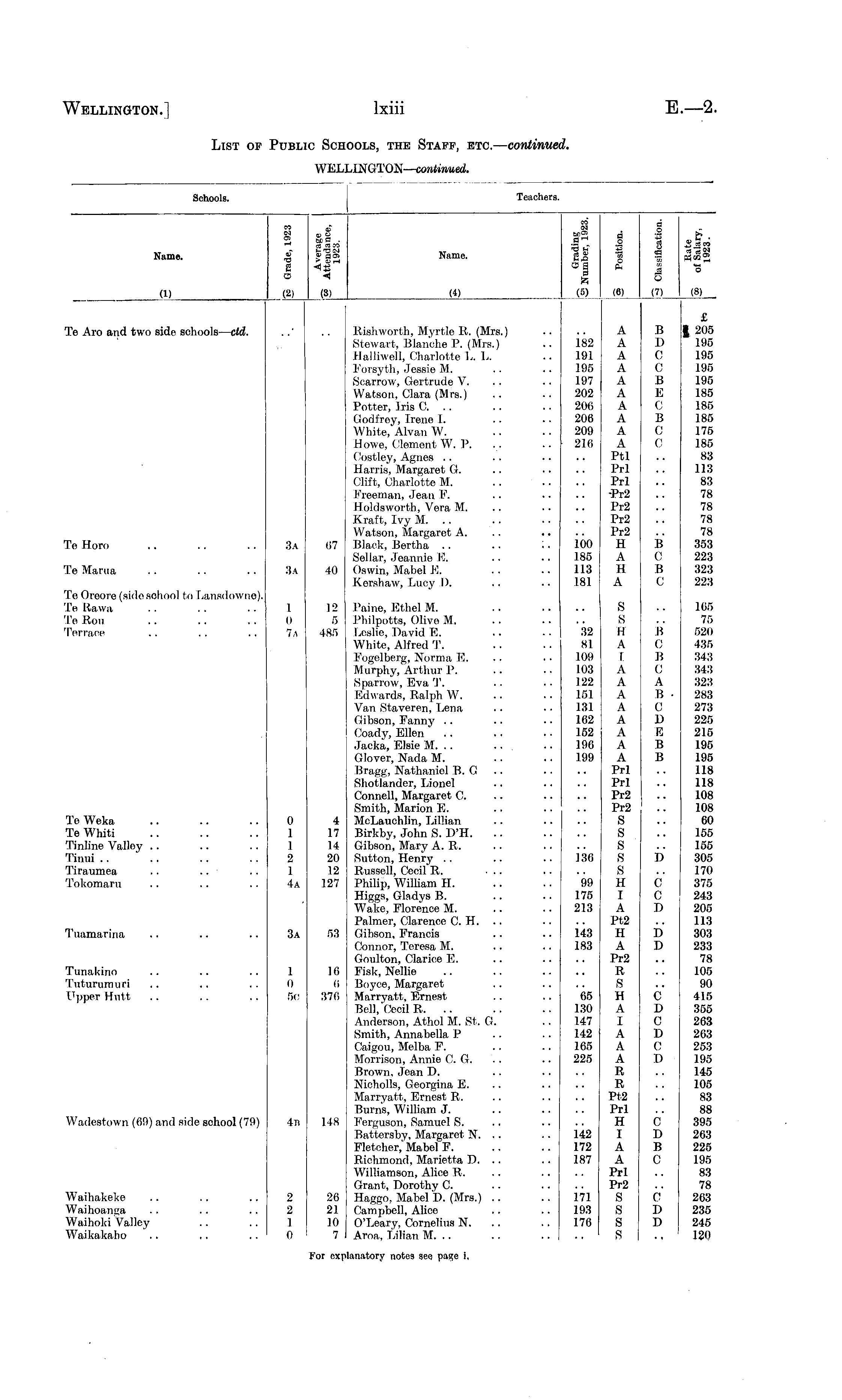 Schools. Teachers. Name. a. rH fl a „2__ to O • ■n -*■*; «. S'SM S a a. «3 Name. so b, 2 fl .5 ° os 8 a to (6) (6_ fl © £ 5 (7) *o (8) (1) (3) W 'I'e Aro and two side schools — ctd. Rishworth, Myrtle R. (Mrs.) Stewart, Blanche P. (Mrs.) Halliwell, Charlotte L. L. Forsyth, Jessie M. Searrow, Gertrude V. Watson, Clara (Mrs.) Potter, Iris C. .. Godfrey, Irene I. White, Alvan W. Howe, Clement W. P. Agnes 11 arris, Margaret G. Clift, Charlotte M. Freeman, Jean F. Holelsworth, Vera M. Kraft, Ivy M. .. Watson, Margaret A. Black, Bertha Sellar, Jeannie E. Oswin, Mabel E. Kershaw, Lucy I). 182 191 195 197 202 200 206 209 210 A A A A A A A A A A Ptl Prl Prl ■Pr2 Pr2 Pr2 Pr2 H A H A B D C c B E C B C c £ | 205 195 195 195 195 185 185 185 175 185 83 113 83 78 78 78 78 353 223 323 223 Te Horn 100 185 113 181 B C B C 3a 07 Te Mania 3a 40 Te Oreore (sielo school to Lanselowne). 'I'e Rawa 'I'e Ron Terrace 1 0 7,\ 12 5 485 i'airie, Ethel M. Phi I potts, Olive M. Leslie, David E. White, Alfred T. Fogelberg, Norma E. Murphy, Arthur P. Sparrow, Eva T. Edwards, Ralph W. Van Staveren, Lena Gibson, Fanny Coady, Ellen Jacka, Elsie M. .. ... Glover, Nada M. Bragg, Nathaniel B. G Shotlander, Lionel Connell, Margaret C. Smith, Marion E. McLauchlin, Lillian Birkby, John S. D'H. .. Gibson, Mary A. R. Sutton, Henry Russell, Cecil'R. Philip, William H. Higgs, Gladys 15. Wake, Florence M. Parmer, Clarence C. H. Gibson, Francis Connor, Teresa M. Goulton, Clarice E. Fisk, Nellie Boyec, Margaret Marryatt, Ernest Bell,'Cecil R. .. Anderson, Athol M. St. G. Smith, Annabella P Caigou, Melba F. Morrison, Annie C. G. Brown, Jean D. Nicholls, Georgina E. Marryatt, Ernest R. Burns, William J. Ferguson, Samuel S. Battersby, Margaret N. .. Fletcher,' Mabel F. Richmond, Marietta D. .. Williamson, Alice R. Grant, Dorothy C. Haggo, Mabel D. (Mrs.) .. Campbell, Alice O'Leary, Cornelius N. Aroa, Lilian M. .. 32 81 109 103 122 151 131 162 152 196 199 S S H A I A A A A A A A A Prl Prl Pr2 Pr2 S S s s s H I A Pt2 H A Pr2 R S H A I A A A R R Pt2 Prl H I A A Prl Pr2 S s s s 15 C 15 C A B ■ 0 D E B B 105 75 520 435 343 343 323 283 273 225 215 195 195 118 118 108 108 60 155 155 305 170 375 243 205 113 303 233 78 105 90 415 355 263 263 253 195 145 105 83 88 395 263 225 195 83 78 263 235 245 120 TeWeka Te Whiti Tinline Valley Tinui Tiraumea .. Tokomaru 0 1 1 2 1 4a 4 17 14 20 12 127 136 D 99 175 213 c c D Tuamarina 3a 53 143 183 D D Tunakino Tuturumuri Upper Hutt 1 o 5c 16 6 376 65 130 147 142 165 225 C D C D C D Wadestown (69) and sielo school (79) C D 15 C -In 148 142 172 187 Waihakeke Waihoanga Waihoki Valley Waikakaho 2 2 1 0 26 21 10 7 171 19.3 176 C D D For ox] ilanatory notes see paste i.