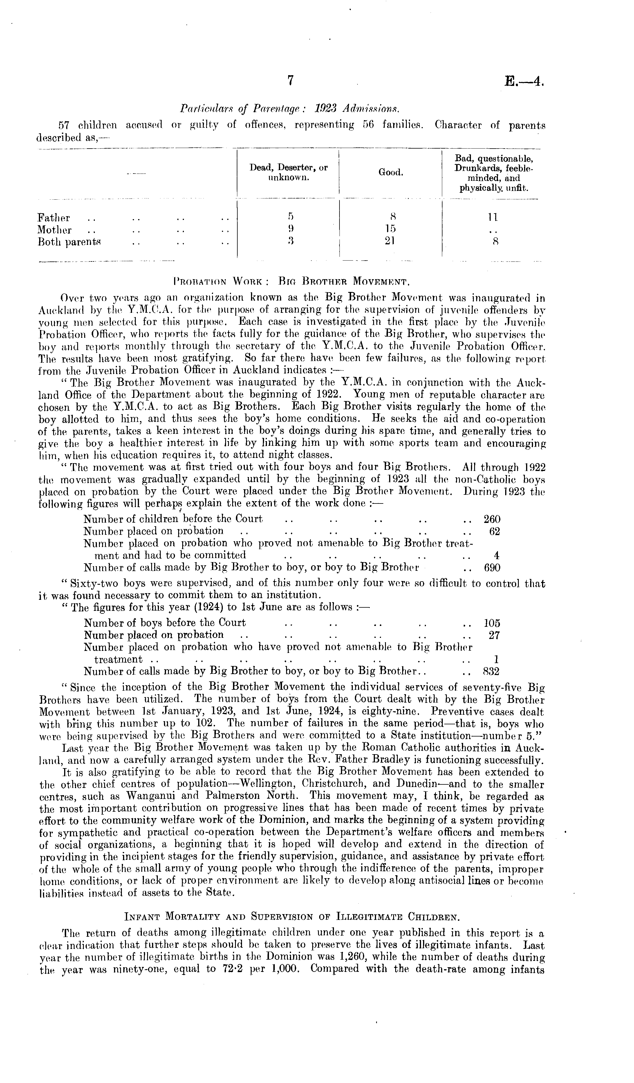 Probation Work : Big Brother Movement. Over two years ago an organization known as the Big Brother Movement was inaugurated in Auckland by the; Y.M.C.A. for the- purpose eif arranging fen- the- supervision of juvenile- offenders by young men selected for this purpose-. Each case is investigated in the first, place by the Juvenile Probation Officer, who reports the facts fully for the guidance- of the Big Brother, who supervises the' boy and reports monthly through the secretary of the Y.M.C.A. to the- Juvenile Probation Officer. The: results have been most gratifying. So far there have: been few failures, as the following report, from the Juvenile Probation Officer in Auckland indicates :— "Tilt; Big Brother Movement was inaugurated by the Y.M.C.A. in conjunction with the Auckland Office of the Department about the beginning of 1922. Young men of reputable character art; chosen by the Y.M.C.A. to act as Big Brothers. Each Big Brother visits regularly the home of the boy allotted to him, and thus sees the boy's home conditions. He seeks the aid and co-operation of the parents, takes a keen interest in the boy's doings during his spare time, and generally tries to give the boy a healthier interest in life by linking him up with some sports team and encouraging him, when his education requires it, to attend night classes. "The movement was at first tried out with four boys and four Big Brothers. All through 1922 the: movement was gradually expanded until by the beginning of 1923 all the non-Catholic boys placed on probation by the Court were placed under the Big Brother Movement. During 1923 the following figures will perhaps explain the extent of the work done ; — Number of children before the Court .. .. .. .. .. 260 Number placed on probation, . . .. .. .. .. 62 Number placed on probation who proved not amenable to Big Brother treatment and had to be committed .. .. . . .. .. 4 Number of calls made by Big Brother to boy, or boy to Big Brother .. 690 " Sixty-two boys were supervised, and of this number only four wore so difficult to control that it was found necessary to commit them to an institution. " The figures for this year (1924) to Ist June are as follows : — Number of boys before tho Court .. .. .. .. .. 105 Number placed on probation .. .. .. .. .. 27 Number placed on probation who have proved not amenable to Big Brother treatment .. .. .. .. .. .. .. .. 1 Number of calls made by Big Brother to boy, or boy to Big Brother.. .. 832 " Since the inception of the Big Brother Movement the individual services of seventy-five Big Brothers have been utilized. The number of boys from the Court dealt with by the Big Brother Movement between Ist January, 1923, ami Ist June, 1924, is eighty-nine. Preventive cases dealt with bring this number up to 102. The number of failures in the same period —that is, boys who were being supervised by the Big Brothers and were committed to a State institution—number 5." Last year the Big Brother Movement was taken up by the Roman Catholic authorities in Auckland, and now a carefully arranged system under the Rev. Father Bradley is functioning successfully. It is also gratifying to be able to record that the Big Brother Movement has been extended to the other chief centres of population —Wellington, Christchurch, and Dunedin—and to the smaller centres, such as Wanganui and Palmerston North. This movement may, I think, be regarded as the most important contribution on progressive lines that has been made of recent times by private effort to the community welfare work of the Dominion, and marks the beginning of a system providing for sympathetic and practical co-operation between the Department's welfare officers and members eif social organizations, a beginning that it is hoped will develop and extend in the direction of provieling in the incipient stages for the friendly supervision, guidance, anel assistance by private effort of the; whole of the small army of young people whei through the indifference of the parents, improper home conditions, or lack of proper environment are likely to develop along antisocial lines or become liabilities instead of assets to the State. Infant Mortality and Supervision of Illegitimate Children. The return of deaths among illegitimate children under one year published in this report is a clear indication that further steps shoulel be: taken to preserve the lives of illegitimate infants. Last year the number of illegitimate births in the Dominion was 1,260, while the number of deaths during the year was ninety-one, equal to 72-2 per 1,000. Compared with the death-rate among infants
