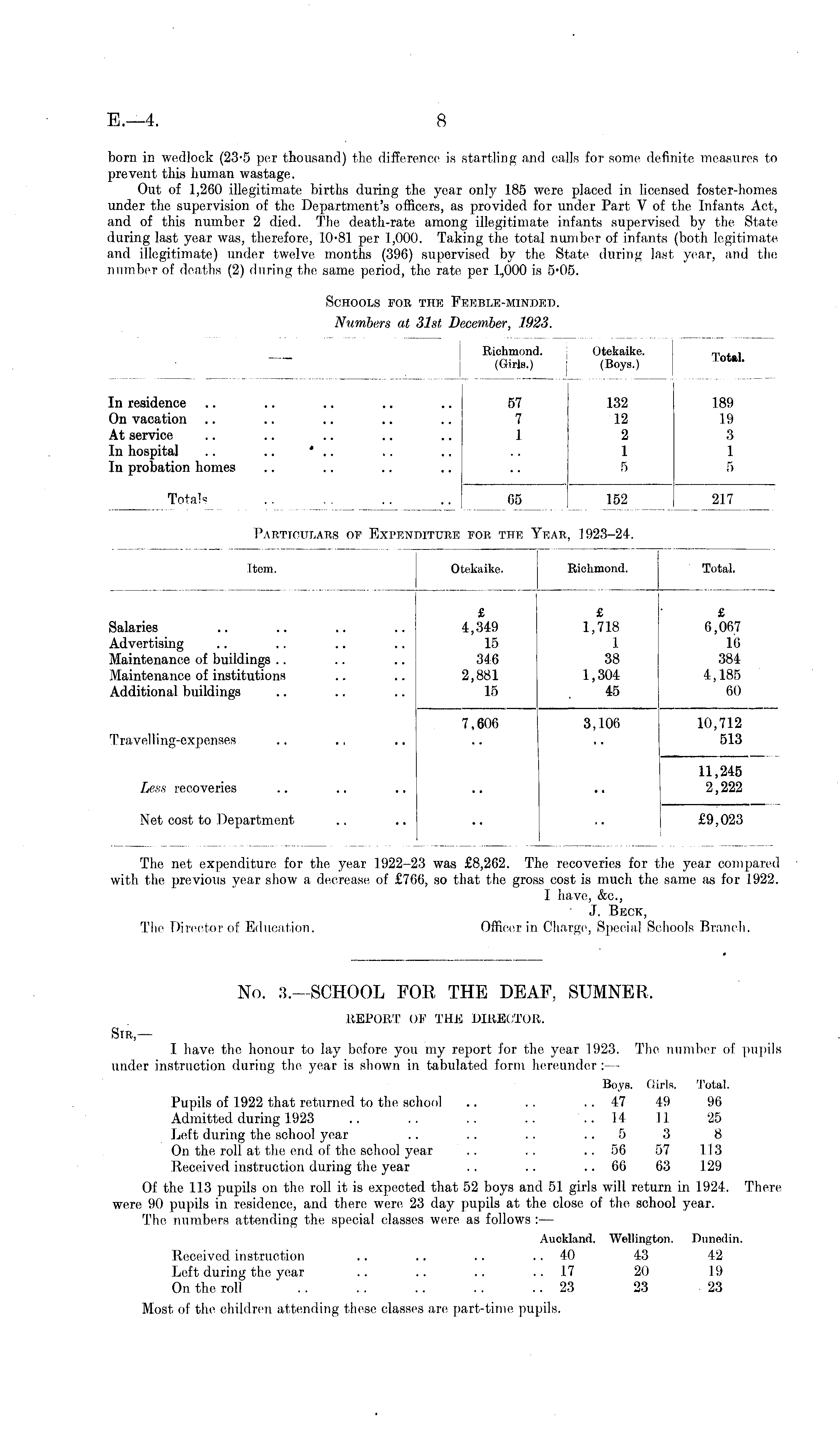 The net expenditure for the year 1922-23 was £8,262. The recoveries for the year compared with the previous year show a decrease of £766, so that the gross cost is much the same as for 1922. I have, &c, J. Beck, The Director of Education. Officer in Charge, Special Schools Branch.
