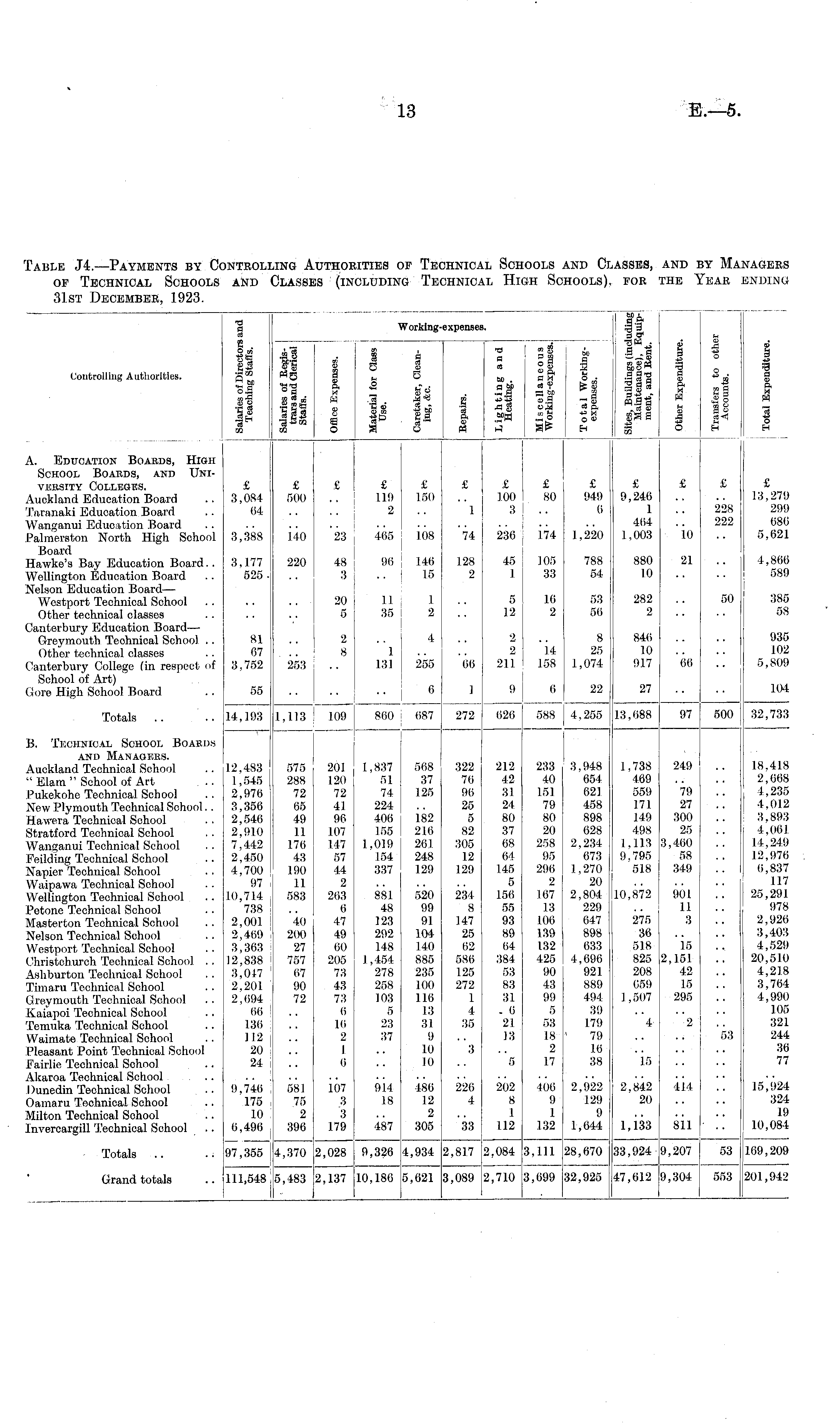Table J4.—Payments by Controlling Authorities of Technical Schools and Classes, and by Managers of Technical Schools and Classes (including Technical High Schools), for the Year ending 31st December, 1923.
