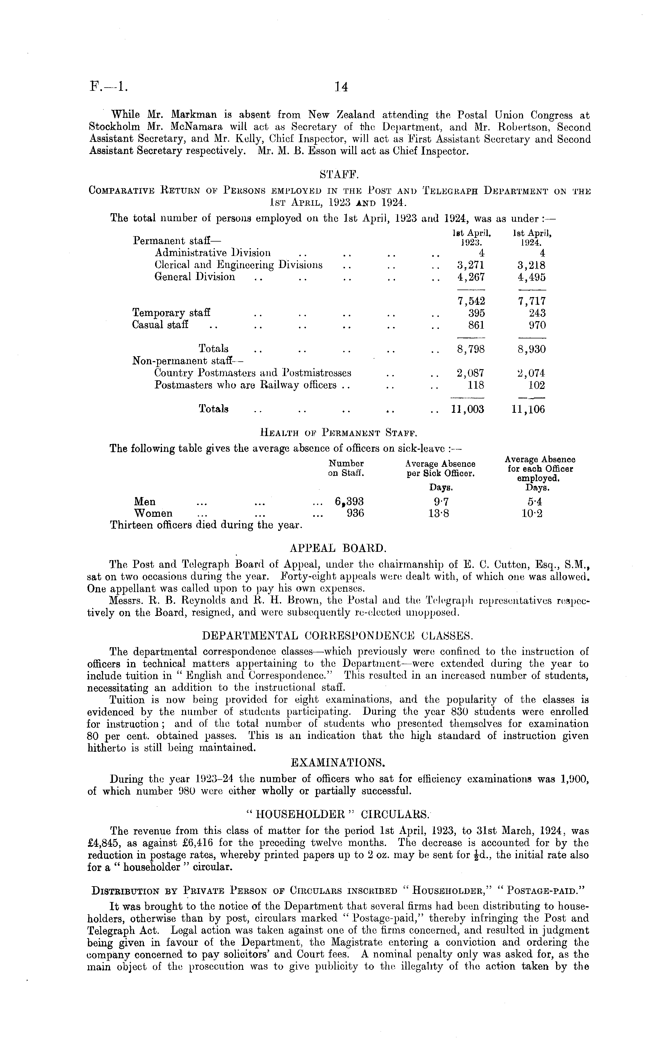 While Mr. Markman is absent from New Zealand attending the Postal Union Congress at Stockholm Mr. McNamara will act as Secretary of the Department, and Mr. Robertson, Second Assistant Secretary, and Mr. Kelly, Chief Inspector, will act as First Assistant Secretary and Second Assistant Secretary respectively. Mr. M. B. Esson will act as Chief Inspector. STAFF. Comparative Return of Persons employed in the Post and Telegraph Department on the Ist April, 1923 and 1924. The total number of persons employed on the Ist April, 1923 and 1924, was as under : — Ist April, Ist April, Permanent staff — 1923. 1924. Administrative Division .. .. .. .. 4 4 Clerical and Engineering Divisions .. .. .. 3,271 3,218 General Division .. .. .. .. ..4,267 4,495 7,542 7,717 Temporary staff .. .. .. .. .. 395 243 Casual staff .. .. .. .. .. .. 861 970 Totals .. .. .. .. ... 8,798 8,930 Non-permanent staff— Country Postmasters and Postmistresses .. .. 2,087 2,074 Postmasters who are Railway officers .. .. .. 118 102 Totals .. .. .. .. .. 11,003 11,106 Health of Permanent Staff. The following table gives the average absence of officers on sick-leave : — Number Average Absence Average Absence on Staff. per Sick Officer. 6^o Officer Days. Days. Men ... ... ... 6,393 97 54 Women ... ... ... 936 13-8 10-2 Thirteen officers died during the year. APPEAL BOARD. The Post and Telegraph Board of Appeal, under the chairmanship of E. C. Cutten, Esej., S.M., sat on two occasions during the year. Forty-eight appeals were dealt with, of which one was allowed. One appellant was called upon to pay his own expenses. Messrs. R. B. Reynolds and R. H. Brown, the Postal and the Telegraph representatives respectively on the Board, resigned, and were subsequently re-elected unopposed. DEPARTMENTAL CORRESPONDENCE CLASSES. The departmental correspondence classes—which previously were confined to tho instruction of officers in technical matters appertaining to the Department —were extended during the year to include tuition in " English and Correspondence." This resulted in an increased number of students, necessitating an addition to the instructional staff. Tuition is now being provided for eight examinations, and the popularity of the classes is evidenced by the number of students participating. During the year 830 students were enrolled for instruction; and of the total number of students who presented themselves for examination 80 per cent, obtained passes. This is an indication that the high standard of instruction given hitherto is still being maintained. EXAMINATIONS. During the year 1923-24 the number of officers who sat for efficiency examinations was 1,900, of which number 980 were either wholly or partially successful. " HOUSEHOLDER " CIRCULARS. The revenue from this class of matter for the period Ist April, 1923, to 31st March, 1924, was £4,845, as against £6,416 for the preceding twelve months. The decrease is accounted for by the reduction in postage rates, whereby printed papers up to 2 oz. may be sent for Jd., the initial rate also for a " householder " circular. Distribution by Private Person of Circulars inscribed " Householder," " Postage-paid." It was brought to the notice of the Department that several firms had been distributing to householders, otherwise than by post, circulars marked " Postage-paid," thereby infringing the Post and Telegraph Act. Legal action was taken against one of the firms concerned, and resulted in judgment being given in favour of the Department, the Magistrate entering a conviction and ordering the company concerned to pay solicitors' and Court fees. A nominal penalty only was asked for, as the main object of the prosecution was to give publicity to the illegality of the action taken by the