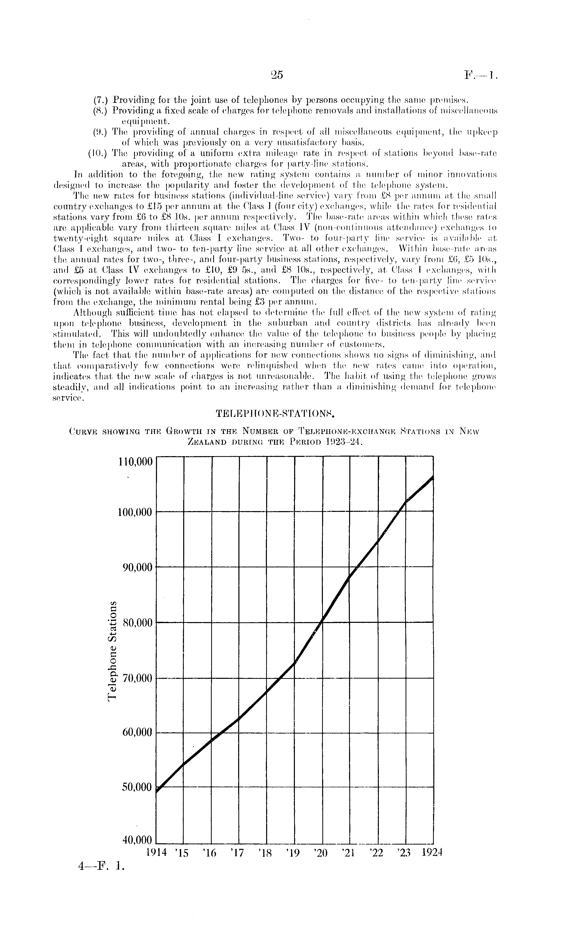 (7.) Providing for the joint use of telephones by persons occupying the same promises. (8.) Providing a fixed scale of charges for telephone removals and installations of miscellaneous equipment. (9.) The providing of annual charges in respect of all miscellaneous equipment, the upkeep of which was previously on a very unsatisfactory basis. (10.) The providing of a uniform extra mileage rate in respect of stations beyond base-rate areas, with proportionate charges for party-line stations. In addition to the foregoing, the new rating system contains a number of minor innovations designed to increase the popularity and foster the development of the telephone system. The new rates for business stations (individual-line service) vary from £8 per annum at the small country exchanges to £15 per annum at the Class I (four city) exchanges, while the rates for residential stations vary from £6 to £8 10s. per annum respectively. The base-rate areas within which these rates are applicable vary from thirteen square miles at Class IV (non-continuous attendance) exchanges to twenty-eight square miles at Class I exchanges. Two- to four-party line service is available at Class I exchanges, and two- to ten-party line service at all other exchanges. Within base-rate areas the annual rates for two-, three-, and four-party business stations, respectively, vary from £6, £5 10s., and £6 at Class IV exchanges to £10, £9 55., and £8 10s., respectively, at Class I exchanges, with correspondingly lower rates for residential stations. The charges for five- to ten-party line service (which is not available within base-rate areas) are computed on the distance of the respective stations from the exchange, the minimum rental being £3 per annum. Although sufficient time has not elapsed to determine the full effect of the new system of rating upon telephone business, development in the suburban and country districts has already been stimulated. This will undoubtedly enhance the value of the telephone to business people by placing them in telephone communication with an increasing number of customers. The fact that the number of applications for new connections shows no signs of diminishing, and that comparatively few connections were relinquished when the new rates came into operation, indicates that the new scale of charges is not unreasonable. The habit of using the telephone grows steadily, and all indications point to an increasing rather than a diminishing demand for telephone service.