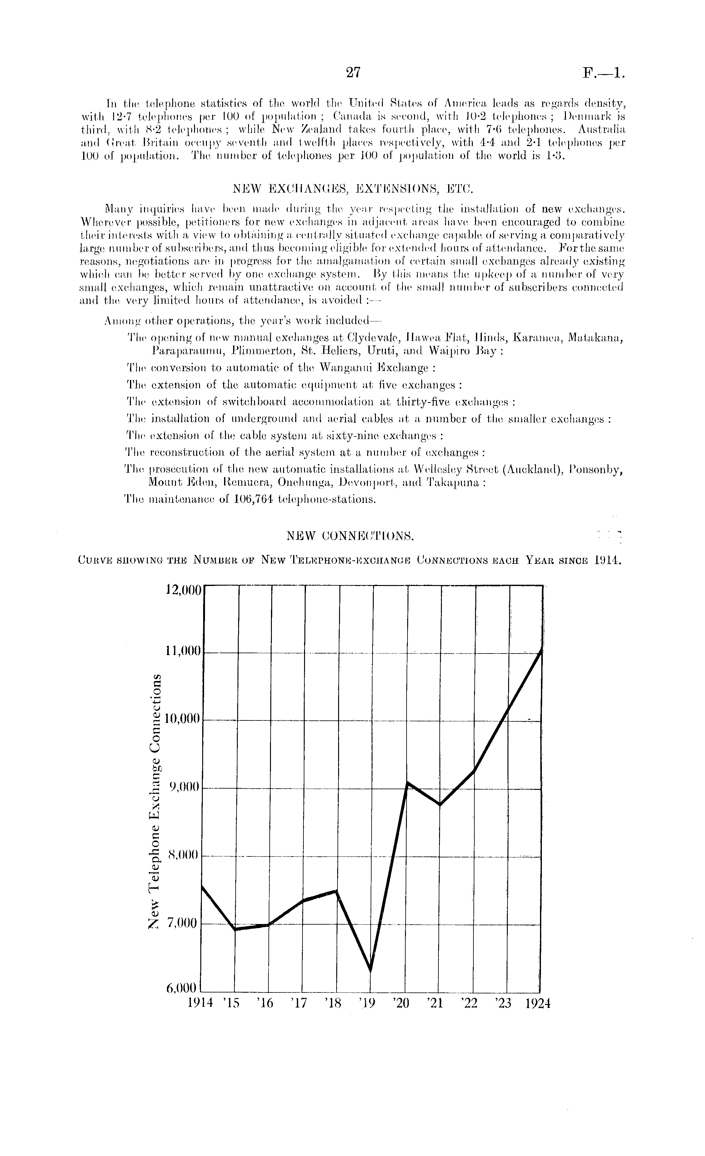In the telephone statistics of the world the United States of America leads as regards density, with 12-7 telephones per 100 of population; Canada is second, with 10-2 telephones; Denmark is third, with 8-2 telephones ; while New Zealand takes fourth place, with 7*6 telephones. Australia anel Great Britain occupy seventh, and twelfth places respectively, with 4-4 and 2T telephones per 100 of population. Tho number of telephones per 100 of population of tho world is 1-3. NEW EXCHANGES, EXTENSIONS, ETC. Many inquiries have been made during the year respecting the installation of new exchanges. Wherever possible, petitioners for new exchanges in adjacent areas have been encouraged to combine their interests with a view to obtaining a centrally situated exchange capable of serving a comparatively large number of subscribers, and thus becoming eligible for extended hours of attendance. For the same reasons, negotiations aro in progress for the amalgamation of certain small exchanges already existing which can be better served by one exchange system. By this means the upkeep of a number of very small exchanges, which remain unattractive: on account of the small number of subscribers connected and the very limited hours of attendance, is avoided : — Among other operations, the year's work included — The opening of new manual exchanges at Clydovale, Hawea Flat, Hinds, Karamea, Matakana, Paraparaumu, Plimmerton, St. Heliers, Uruti, and Waipiro Bay : The conversion to automatic of the Wanganui Exchange : Tho extension of the automatic equipment at five exchanges : The extension of switchboard accommodation at thirty-five exchanges : Tho installation of underground anel aerial cables at a number of the smaller exchanges : The extension of the cable system at sixty-nine exchanges : The reconstruction of the aerial system at a number of exchanges : The prosecution of the new automatic installations at Wellcsloy Street (Auckland), Ponsonby, Mount Eden, Remucra, Onohunga, Devonport, and Takapuna : The maintenance of 106,764 te:lophone-stations.