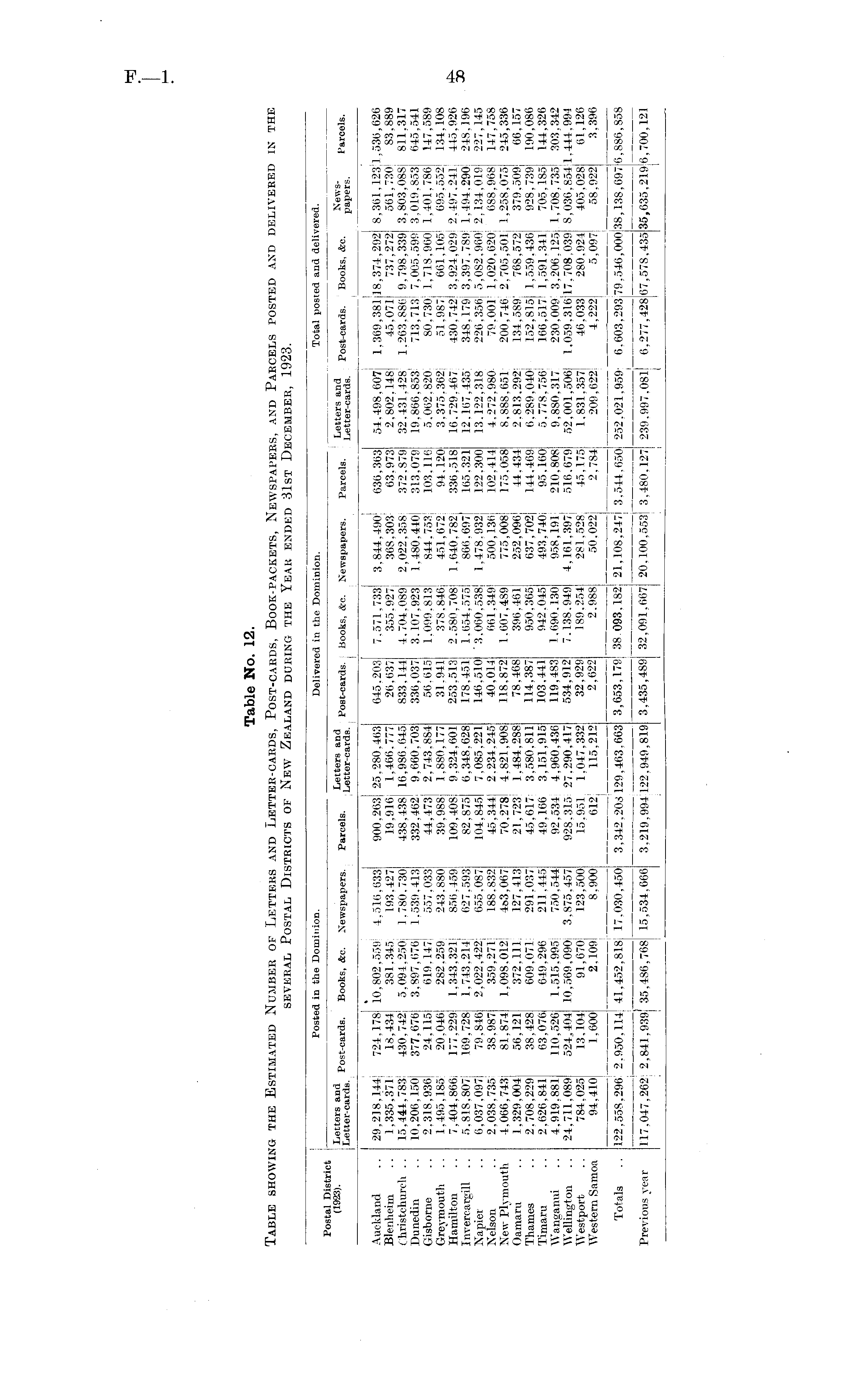 Posted in the Dominion. Delivered in the Dominion. Total posted and delivered. (1923). Letters and p . , Letter-cards. P° st - C arus. Books, &c. Newspapers. Parcels. Letters and p ost . ear(ls Letter-cards. ™ Ma 'rtls Books, &e. Newspapers. Parcels ' Letters and ±-arcers. better-cards. Post-cards. Books, &c. Newspapers. Parcels. Auckland Blenheim Christchurch .. Dunedin Gisborne Greymouth Hamilton Invercargill Napier Nelson New Plymouth Oamaru Thames Timaru Wanganui Wellington Westport Western Samoa 29,218,144! 1,335,3711 15,444,7831 10,206,150 2,318,936 1.495,185 7,404,866: 5.818,807 0,037,097 2,038,735 4,066,743 1,329,004 2.708,229 2.626,841 4.919.881 24,711,089 784.025 94,410 724,178 18,434 430,742 377,676 24,115 20.046 177,229 169,728 79,846 38.987 81,874 56,121 38,428 63,076 110,526 524,404 13,104 1,600 10,802,559 381.345 5.094,250 3,897,676 619,147 282.259 1.343,321 1,743,214 2.022,422 359,271 1.098.012 372,111 609,071 649,296 1,515.995 10,569,090 91,670 2,109 4,516,633 193,427 1.780,730 1.539,413 557,033 243,880 856.459 627.593 655,087 188.832 4o3,067 127,413 291.037 211,445 750,544 3,875,457 123,500 8.900 900,263 25.280,463 19,916 1,466.777 438,438 16,986.645 332.462 9,660,703 44,473 2,743.8S4 39.988 1,880,177 109,408 9,324.601 82,875 6,348.628 104,845 7,085.221 45,344 2.234,245 70,278 4.821,908 21,723 1,484,288 45,617 3,580.811 49.166; 3,151,915 92,5341 4,960,436 928,315! 27,290,417 15.951! 1.047.332 612 115,212 645.203 26,637 833,144 336,037 56.615 31.941 253.513 178.451 146,510 40,014 118,872 78,468 114,387 103.441 119,483 534,912 32.929 2,622 7,571,733 355,927 4,704.089 3.107,923 1,099.813 37S.846 2,580,708 1,654 .575 '3,060,538 661,349 1,607,489 396.461 950,365 942.045 1,690.130 7.138,949 189,254 2.988 3,844,490 368,303 2,022,358 1,480,440 844.753 451,672 1,640,782 866.697 1,478.932 500,136 775,008 252,096 637,702 493,740 958,191 4,161,397 281,528 50.022 636,363 63.973 372.879 313,079 103.116 94.120 336,518 165,321 122.300 102.414 175.058 44,434 144.469 95.160 210,808 516.679 45,175 2,784 54,498,607 1.369,38118,374,292 8,361,123 1,536,626 2,802.148 45,071 737,272 561,730 83,889 32,431,428 1,263.886 9,798,339 3,803,088 811.317 19,866,853! 713,713 7,005,599 3,019,853 645,541 5,062.820! 80,730 1,718,960 1,401.786 147,589 3,375.362; 51,987 661,105 695,552 134,108 16.729,467i 430,742 3,924,029 2,497.241 445,926 12.167,435! 348,179 3,397,789 1,494.290 248.196 13,122,318 : 226,356 5,082,960 2.134,019 227,145 4,272.980 79.001 1,020,620 688,968 147,758 8,888.651! 200,746 2.705,501 1,258,075 245,336 2.813,292 134,589 768,572 379.509 66,157 6,289,040 152,815 1,559.436 928,739 190,086 5,778,756 166,517 1,591.341 705.185 144,326 9,880,317 ! 230,009 3,206.125 1,708,735 303.342 52,001,506 1,059.316 17,708,039 8,036.854 1.444,994 1.831,357 46,033 280.924 405,028 61,126 209,622 4,222 5,097 58,922 3,396 Totals . . 122,558,296 2,950,114 41,452,818 17,030,450 35,486,768 15,534,666 3,342,208429,463.663 3,653,179 38 093,182 21,108,247 3,544,650 252,021,959 6,603,293 79,546,000 38,138,697 6,886,851 20,100,553 3,480,127 239,997,081 6,277,42867, 578, 435 35,635, 2196, 700, 12 Previous year 117,047,262 2,841,939! 3,219,9941122,949,819 3,435,489 32,091,667