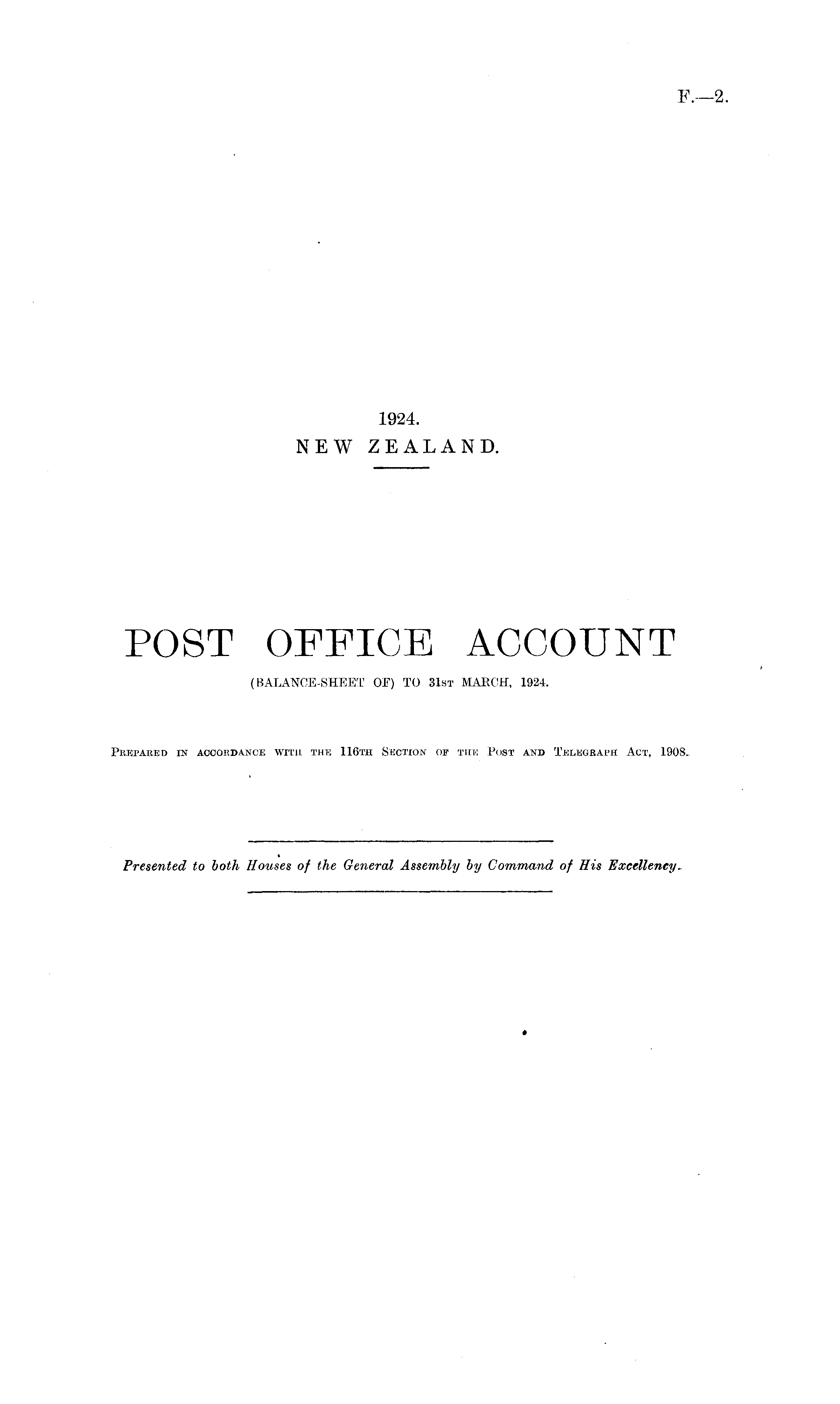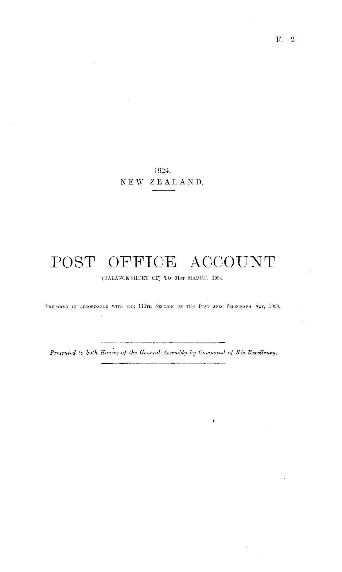 POST OFFICE ACCOUNT (BALANCE-SHEET OF) TO 31st MARCH, 1924. Prepared in accordance with the 116th Section of the Post and Telegraph Act, 1908.