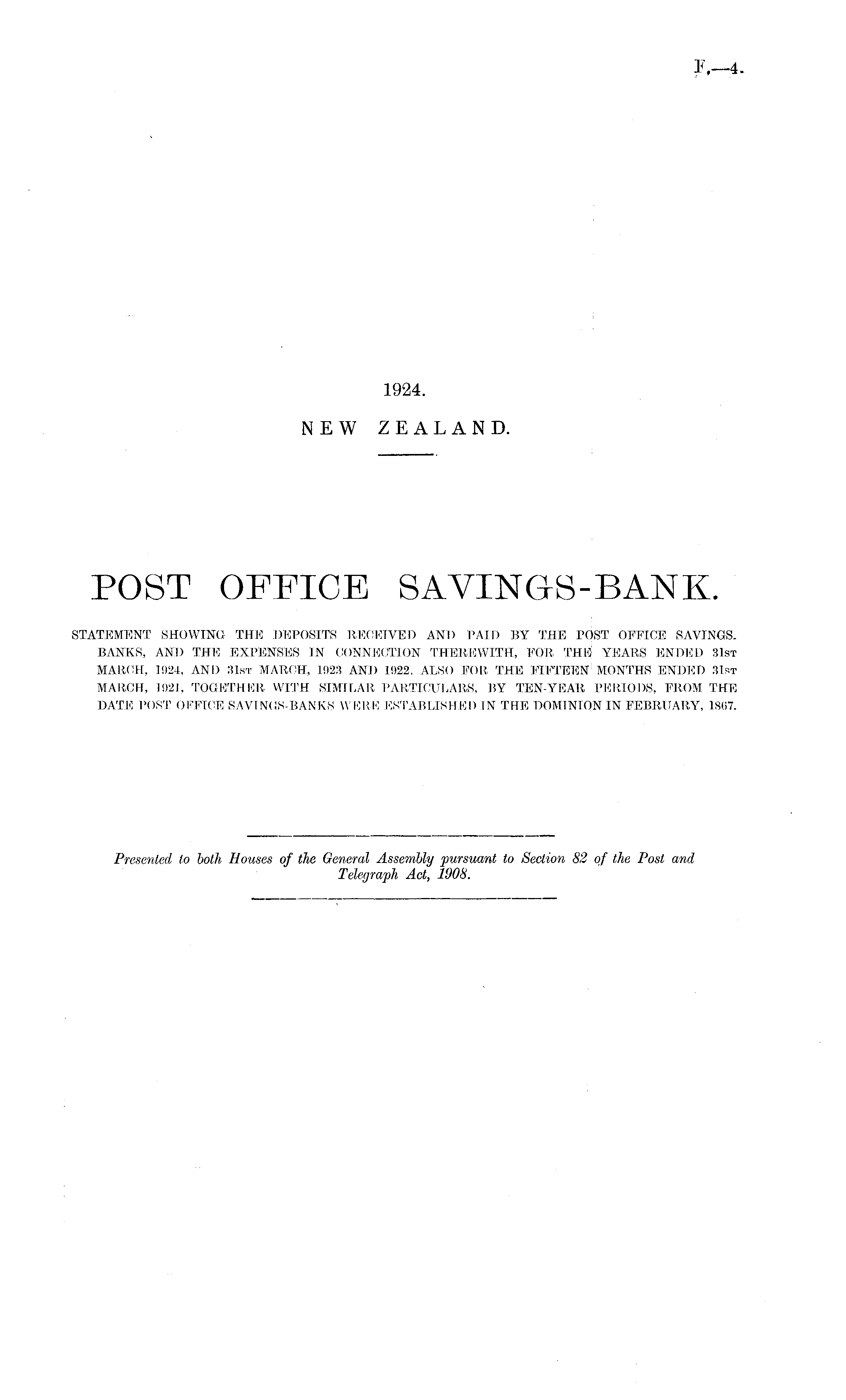 POST OFFICE SAVINGS-BANK. STATEMENT SHOWING THE DEPOSITS RECEIVED AND PAID BY THE POST OFFICE SAVINGS. BANKS, AND THE EXPENSES IN CONNECTION THEREWITH, FOR THE YEARS ENDED 31st MARCH, 1924, AND 31st MARCH, 1923 AND 1922, ALSO FOR THE FIFTEEN MONTHS ENDED 31st MARCH, 1921, TOGETHER WITH SIMILAR PARTICULARS, BY TEN-YEAR PERIODS, FROM THE DATE POST OFFICE SAVINGS-BANKS WERE ESTABLISHED IN THE DOMINION IN FEBRUARY, 1867.