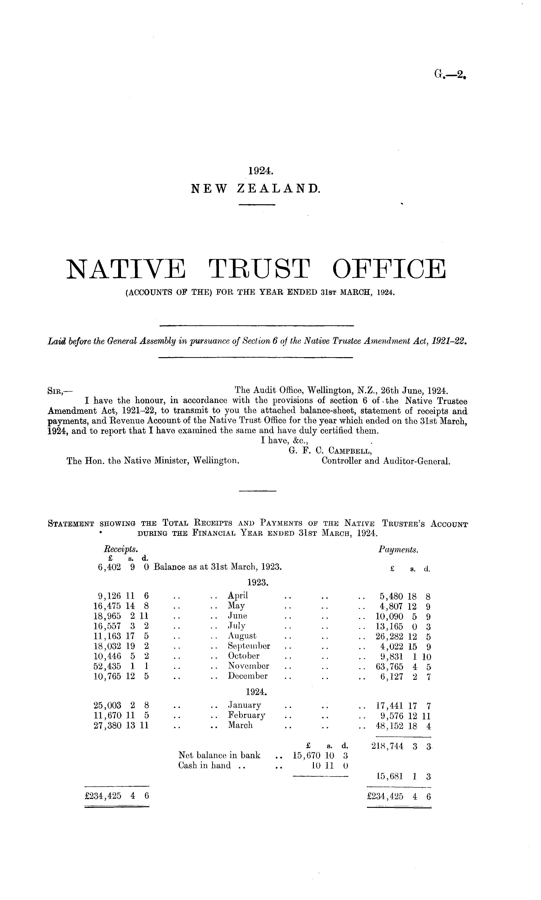 Sir,— The Audit Office, Wellington, N.Z., 26th June, 1924. I have the honour, in accordance with the provisions of section 6 of • the Native Trustee Amendment Act, 1921-22, to transmit to you the attached balance-sheet, statement of receipts and payments, and Revenue Account of the Native Trust Office for the year which ended on the 31st March, 1924, and to report that I have examined the same and have duly certified them. I have, &c, G. F. C. Campbell, The Hon. the Native Minister, Wellington. Controller and Auditor-General. Statement showing the Total Receipts and Payments op the Native Trustee's Account during the Financial Year ended 31st March, 1924. Receipts. Payments. £ s. d. 6,402 9 0 Balance as at 31st March, 1923. £ s . d. 1923. 9,126 11 6 .. .. April .. .. .. 5,480 18 8 16,475 14 8 .. .. May .. .. .. 4,807 12 9 18,965 2 11 .. .. June .. .. .. 10,090 5 9 16,557 3 2 .. .. July .. .. .. 13,165 0 3 11,163 17 5 .. .. August .. .. .. 26,282 12 5 18,032 19 2 .. .. September .. .. .. 4,022 15 9 10,446 5 2 .. .. October .. .. .. 9,831 110 52,435 11 .. .. November .. .. .. 63,765 4 5 10,765 12 5 .. .. December .. .. .. 6,127 2 7 1924. 25,003 2 8 .. .. January .. .. .. 17,441 17 7 11,670 11 5 .. .. February .. .. .. 9,576 12 11 27,380 13 11 .. .. March .. .. .. 48,152 18 4 £ s. d. 218,744 3 3 Net balance in bank .. 15,670 10 3 Cash in hand .. .. .1.0 11 0 15,681 1 3 £234,425 4 6 £234,425 4 6