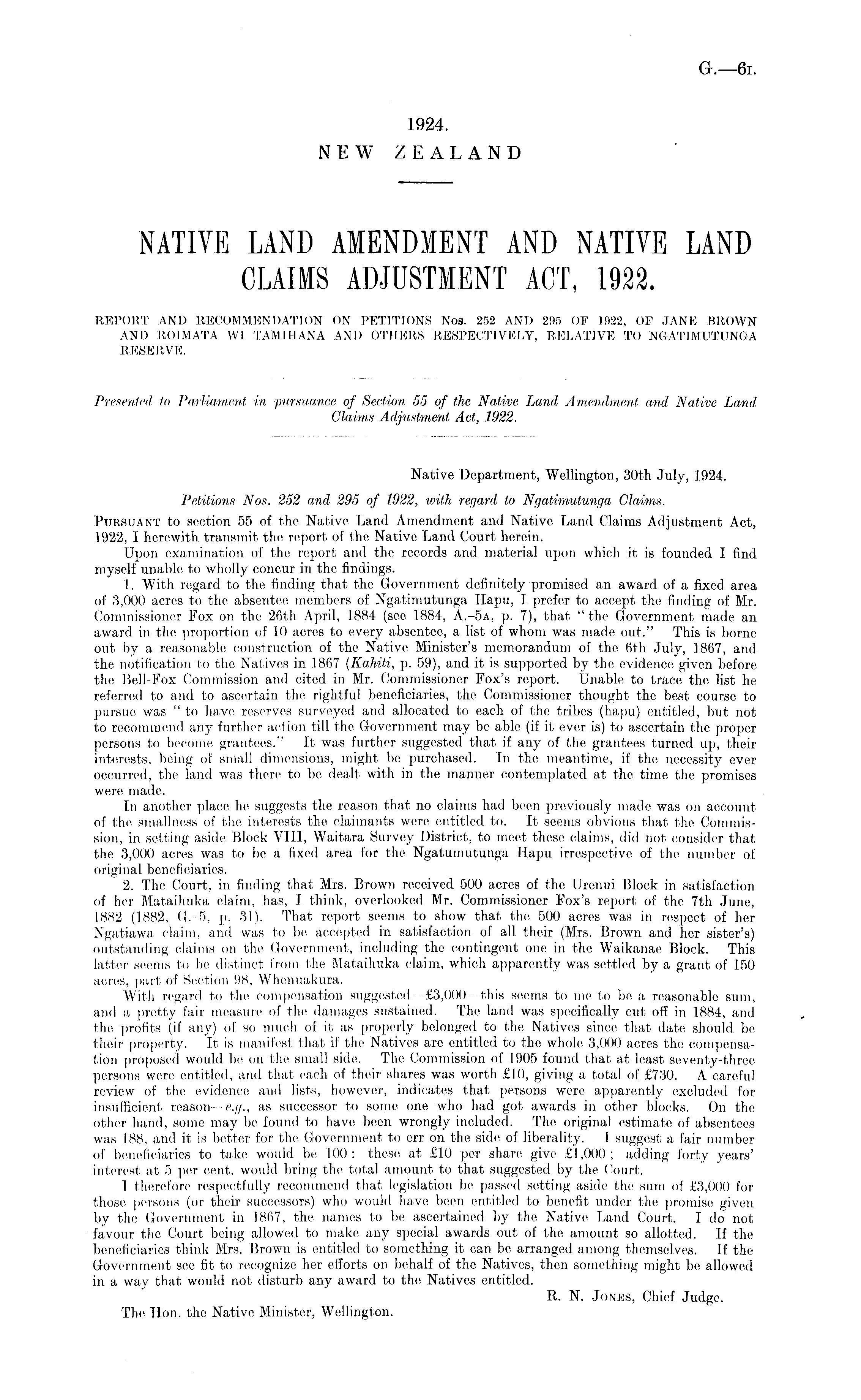 Native Department, Wellington, 30th July, 1924. Petitions Nos. 252 and 295 of 1922, with regard to Ngatimutunga Claims. Pursuant to section 55 of the Native Land Amendment and Native Land Claims Adjustment Act, 1922, I herewith transmit the report, of the Native Land Court herein. Upon examination of the report and tho records and material upon which it is founded I find myself unable to wholly concur in the findings. 1. With regard to the finding that the Government definitely promised an award of a fixed area of 3,000 acres to the absentee members of Ngatimutunga Hapu, I prefer to accept the finding of Mr. Commissioner Fox on the 26th April, 1884 (see 1884, A.-sa, p. 7), that "the Government made an award in the proportion of 10 acres to every absentee, a list of whom was made out." This is borne out by a reasonable construction of the Native Minister's memorandum of the 6th July, 1867, and the notification to the Natives in 1867 {Kahili, p. 59), and it is supported by the evidence given before the Bell-Fox Commission and cited in Mr. Commissioner Fox's report. Unable to trace the list he referred to and to ascertain the rightful beneficiaries, the Commissioner thought the best course to pursue was " to have reserves surveyed and allocated to each of the tribes (hapu) entitled, but not to recommend any further action till the Government may be able (if it ever is) to ascertain the proper persons to become grantees." It was further suggested that if any of the grantees turned up, their interests, being of small dimensions, might be purchased. In the meantime, if the necessity ever occurred, the land was there to be dealt with in the manner contemplated at the time the promises were made. In another place he suggests the reason that no claims had been previously made was on account of the smallness of the interests the claimants were entitled to. It seems obvious that the Commission, in setting aside Block VIII, Waitara Survey District, to moot these claims, did not consider that the 3,000 acres was to be a fixed area for the Ngatumutunga Hapu irrespective of the number of original beneficiaries. 2. The, Court, in finding that Mrs. Brown received 500 acres of the Urenui Block in satisfaction of her Mataihuka claim, has, I think, overlooked Mr. Commissioner Fox's report of the 7th June, 1882 (1882, (1. 5, p. 31). That report seems to show that the 500 acres was in respect of her Ngatiawa claim, and was to be. accepted in satisfaction of all their (Mrs. Brown and her sister's) outstanding claims on the Government, including the contingent one in the Waikanao Block. This latter seems In lie distinct from the, Mataihuka claim, which apparently was settled by a grant of 150 acres, part of Section 98. Whenuakura. With regard to the compensation suggested—£3,ooo—this seems to me to be a reasonable sum, and a pretty fair measure of Iho damages sustained. The land was specifically cut off in 1884, and the profits (if any) of so much of it as properly belonged to the Natives since that date should be, their properly. It, is manifest that if the Natives arc entitled to the whole 3,000 acres the compensation proposed would be on the small side. The Commission of 1905 found that at least seventy-three persons were entitled, and that each of their shares was worth £10, giving a total of £730. A careful review of the evidence and lists, however, indicates that persons were apparently excluded for insufficient reason— e.g., as successor to some, one who had got awards in other blocks. On the other hand, some may be found to have been wrongly included. The original estimate of absentees was 188, and it is better for tho Government to err on the side of liberality. I suggest a fair number of beneficiaries to take would be 100 : these at £10 per share give £1,000 ; adding forty years' interest at. 5 per cent, would bring the total amount to that suggested by the Court. I therefore respectfully recommend that legislation be passed setting aside the sum of £3,000 for those persons (or their successors) who would have been entitled to benefit under the promise given by the Government in 1867, the names to be ascertained by the Native Land Court. Ido not favour the Court being allowed to make, any special awards out of the amount so allotted. If the beneficiaries think Mrs. Brown is entitled to something it can be arranged among themselves. If the Government see fit to recognize her efforts on behalf of the Natives, then something might be allowed in a way that would not disturb any award to the Natives entitled. R. N. Jones, Chief Judge. The Hon. the Native Minister, Wellington.