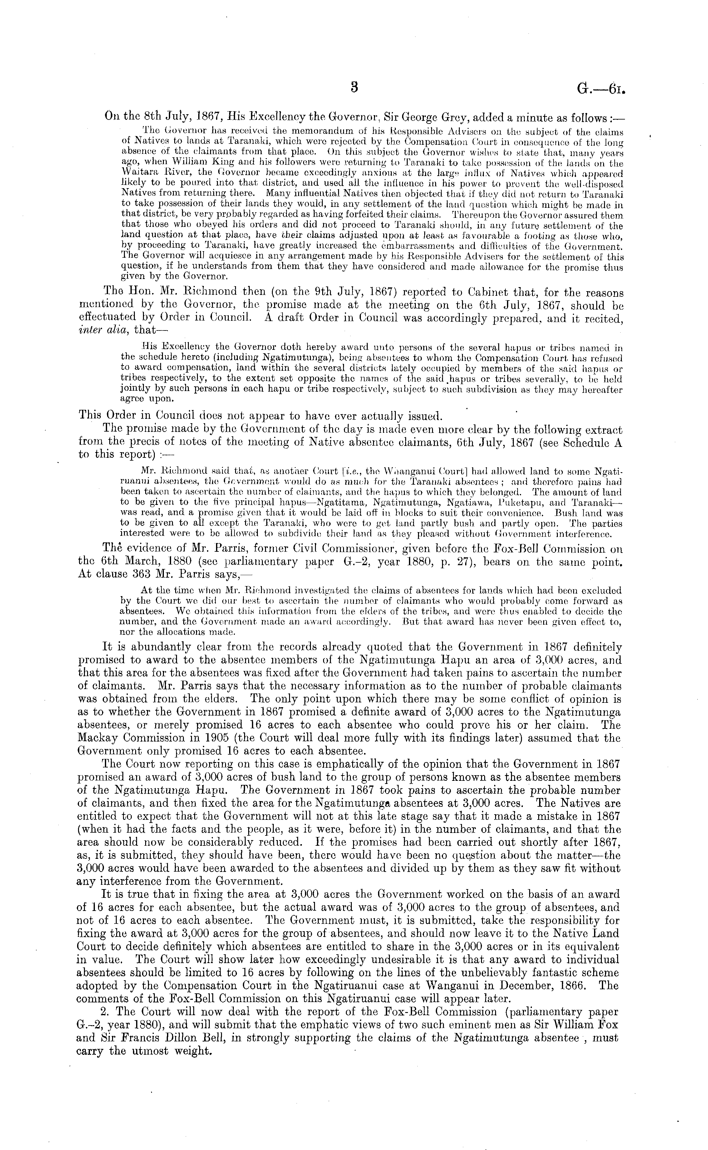 On the Bth July, 1867, His Excellency the Governor, Sir George Grey, added a minute as follows :— The Governor has received the memorandum of his Responsible Advisers on the subject of the claims of Natives to lands at, Taranaki, which were rejected by the Compensation Court in oonsequenoe ol' the long absence of the claimants from that place. On this subject the Governor wishes to statu thai, many years ag", when William King and his followers were returning to Taranaki to take possession of the lands oil the Waitara River, the Governor became exceedingly anxious at the large influx of Natives which appeared likely to be poured into that, district, and used all the influence in his power to prevent the, well-disposed Natives from returning there. Many influential Natives then objected that if they did not return to Taranaki to take possession of their lands they would, in any settlement of the land question which might be made in that district, be very probably regarded as having forfeited their claims. Thereupon the Governor assured them, that those who obeyed his orders and did not proceed to Taranaki should, in any future settlement of the land question at that place, have their claims adjusted upon at least as favourable a footing as those who, by proceeding to Taranaki, have greatly increased the embarrassments and difficulties of the Government. The Governor will acquiesce in any arrangement made by his Responsible Advisers for the settlement of this question, if he understands from them that they have considered and ma.de allowance for the promise thus given by the Governor. The Hon. Mr. Richmond then (on the 9th July, 1867) reported to Cabinet that, for the reasons mentioned by the Governor, the promise made at the, meeting on the 6th July, 1867, should be effectuated by Order in Council. A draft Order in Council was accordingly prepared, and it recited, inter alia, that— His Excellency the Governor doth hereby award unto persons of the several hapus or tribes named in the schedule hereto (including Ngatimutunga), being absentees to whom the Compensation Court has refused to award compensation, land within the several districts lately occupied by members of the said hapus or tribes respectively, to tho extent sot opposite the names of the said.hapus or tribes severally, to ho held jointly by such persons in each hapu or tribe respectively, subject to such subdivision as they may hereafter agree upon. This Order in Council does not appear to have ever actually issued. Tho promise made by the Government of the, day is made even more, clear by the following extract from the precis of notes of the meeting of Native absentee claimants, 6th July, .1867 (see. Schedule A to this report) : — Mr. Richmond said that, as another Court [i.e., the YY'nanganui Court] had allowed land to some Ngatiruanui absentees, the Government would do as much for the Taranaki absentees ; and therefore pains had been taken to ascertain the number of claimants, and (lie lupus to which they belonged. The amount of land to be given to the five principal hapus—Ngatitama, Ngatimutunga,, Ngatiawa, Puketapu, and Taranaki — was read, and a promise given that it would be laid oil in blocks to suit their convenience. Bush land was to be given to all except the Taranaki, who were to get land partly bush and partly open. The parties interested were to be allowed to subdivide- their land as they pleased without Government interference. The evidence of Mr. Parris, former Civil Commissioner, given before the Fox-Bell Commission on the 6th March, 1880 (see parliamentary paper G.-2, year 1880, p. 27), bears on the same point. At clause 363 Mr. Parris says, — At the time when Mr. Richmond investigated tho claims of absentees for lands which had been excluded by the Court we did our best to ascertain the number of claimants who would probably come forward as absentees. Wo obtained this information from the elders of the tribes, and were thus enabled to decide the number, and the Government made an award accordingly. But that award has never been given effect to, nor the allocations made. It is abundantly clear from the records already quoted that tho Government In 1867 definitely promised to award to the absentee members of the Ngatimutunga Hapu an area of 3,000 acres, and that this area for the absentees was fixed after the Government had taken pains to ascertain tho number of claimants. Mr. Parris says that the necessary information as to the number of probable claimants was obtained from the elders. The only point upon which there may be some conflict of opinion is as to whether the Government in 1867 promised a, definite award of 3,000 acres to the Ngatimutunga absentees, or merely promised 16 acres to each absentee who could prove his or her claim. The Mackay Commission in 1905 (the Court will deal more fully with its findings later) assumed that the Government only promised 1.6 acres to each absentee. The Court now reporting on this case is emphatically of the opinion that the Government in 1867 promised an award of 3,000 acres of bush land to the group of persons known as the absentee members of the Ngatimutunga Hapu. The Government in 1867 took pains to ascertain the probable number of claimants, and then fixed the area for the Ngatimutunga absentees at 3,000 acres. The Natives are entitled to expect that the Government will not at this late stage say that it made a mistake, in 1867 (when it had the facts and the people, as it were, before it) in. the number of claimants, and that the area should now be considerably reduced. If the promises had been carried out shortly after 1867, as, it is submitted, they should have been, there would have been no question about the matter —the 3,000 acres would have been awarded to the absentees and divided up by them as they saw fit without any interference from the Government. It is true that in fixing the area at 3,000 acres the Government worked on the basis of an a